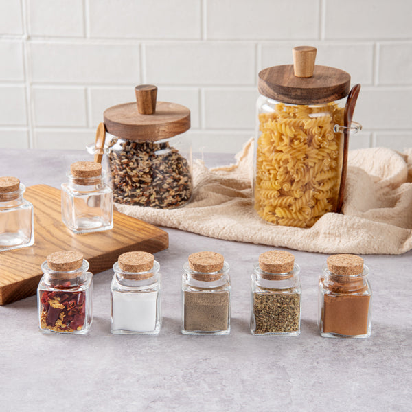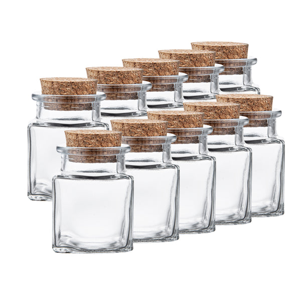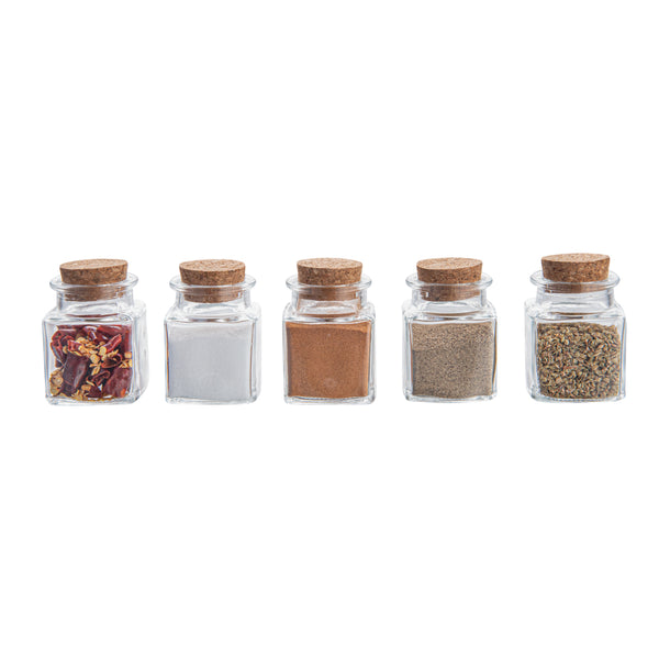 Attractively store herbs or other spices with our Chef 101 2-ounce Square Clear Glass Herb Storage Jars. These storage jars with lids are FDA-approved to safely store various hot or cold ingredients. Featuring a vintage and elegant cork lid, these glass storage containers fashionably elevate your storage area and provide secure sealing. With a unique square design, these glass food storage containers add a modern touch to your kitchen or supply stations. For simple cleaning, these glass herb jars are dishwasher-safe. These glass storage containers have a crystal-clear finish to provide a full view of contents inside for refilling when needed. These glass containers with lids have a 2-ounce capacity and measure 1.57 inches in length by 1.57 inches in width by 1.97 inches in height. Sold in a 10 count box.