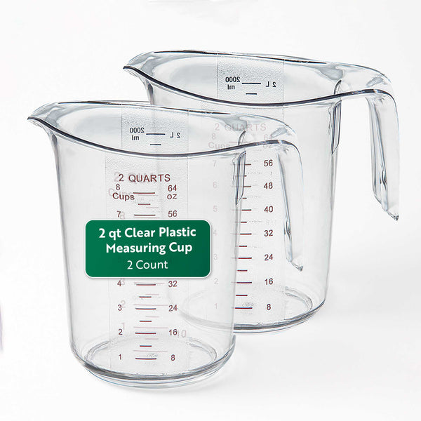 Ensure precise measurements every time with our Chef 101 Embossed Graduations Plastic Measuring Cup. Featuring embossed graduations, this plastic measuring cup eliminates guesswork in cooking and baking, ensuring your recipes remain consistent and of high quality. Its versatile design supports both metric and imperial measurements, accommodating a wide range of recipes and user preferences. The clear measuring cup's finish allows easy visibility of measurement markings and liquid levels, speeding up preparation time and enhancing efficiency. Made from durable plastic, it withstands the rigorous demands of commercial kitchens and is shatterproof. With a height of 7.5 inches and a capacity of 2 quarts, this liquid measuring cup is perfect for both hot and cold food applications. Simplify cleaning with its dishwasher-safe design, making it a convenient choice for foodservice professionals. Each order includes a bundle of 2 Chef 101 Embossed Graduations Plastic Measuring Cups.