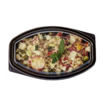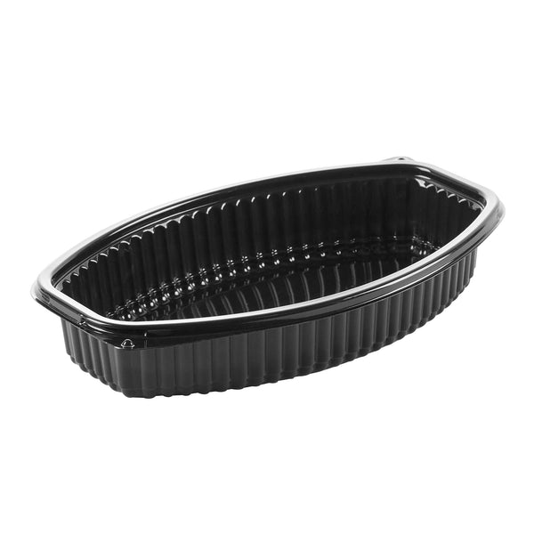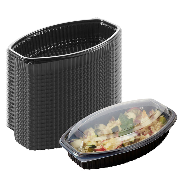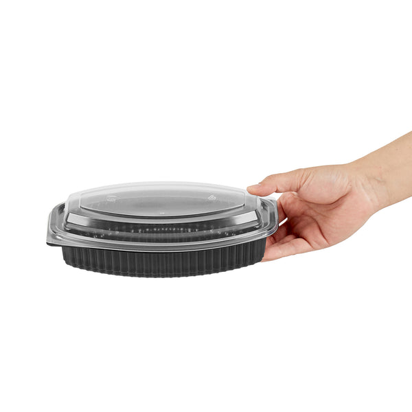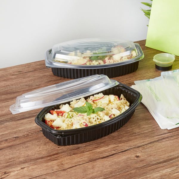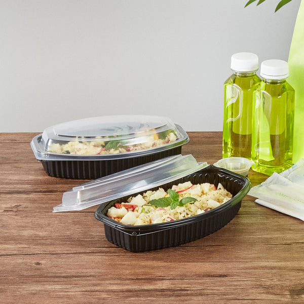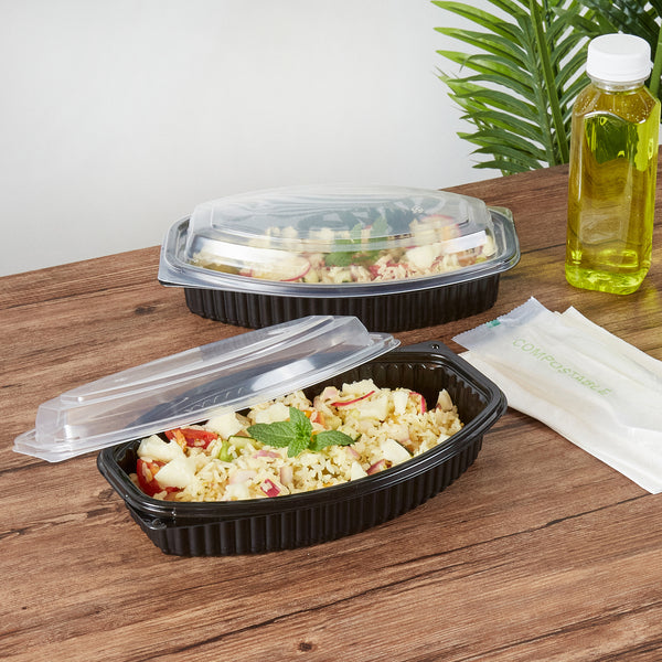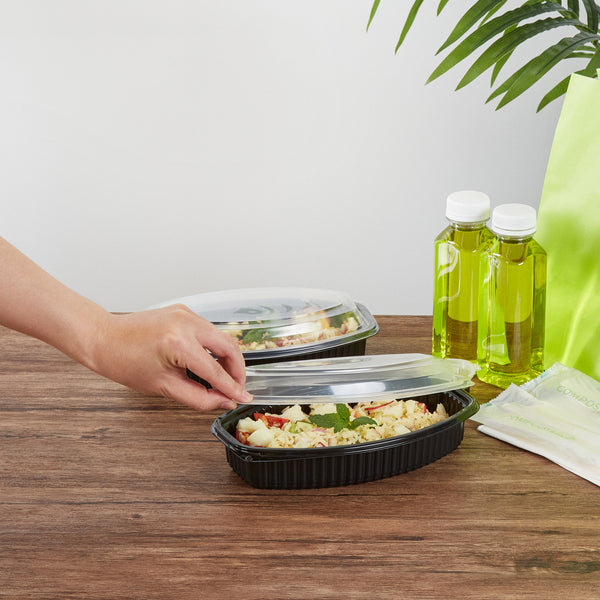 Elevate your foodservice experience with our Chef 101 24-ounce Oval Black Plastic Food Containers. These take out containers come with a clear plastic lid and creates a snug seal, minimizing spills during transport. The flat design of these plastic lids makes stacking and storing the containers easy, maximizing space efficiency and ensuring secure transport. These plastic food containers are microwave-safe and allow customers to reheat meals without the need for extra utensils. Created from premium plastic, these to go containers are suitable for holding hot and cold food items. These clear lids show off the delicious contents inside, making them highly attractive to customers. The sleek black finish of these carry out containers adds a touch of sophistication to your takeaway meals, enhancing presentation. These disposable food containers are freezer-safe to store leftovers for later use. For eco-conscious foodservice establishments, these takeaway containers with lids are recyclable and help reduce your carbon footprint. To facilitate an easy cleanup, these food containers with lids are disposable and can be discarded after use. With a capacity of 24 ounces, these plastic containers with lids measure 9.25 inches in length by 5.75 inches in width by 2.5 inches in height, providing ample space for a variety of dishes. Sold in a 50 count box.