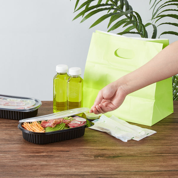 Discover convenience with our Chef 101 25-ounce Oval Black Plastic Food Containers. These take out containers come equipped with a clear plastic lid and form a secure seal, keeping your food intact in transit. The flat design of these plastic lids allows you to easily stack and store the containers, maximizing space efficiency and ensuring secure transport. These to go containers are microwave-safe and provide customers the convenience of reheating meals without changing utensils. Created from premium plastic, these carry out containers are suitable for holding hot and cold food items. For easy food display, these clear lids provide excellent sibility and showcase the contents inside. The sleek black finish of these takeaway containers adds a touch of sophistication to your meals. To store your leftovers, these food containers with lids are freezer-safe. Designed for eco-minded establishments, these plastic to go containers are recyclable and offer an eco-friendly way to pack meals. These plastic food containers can be discarded after use and ensure a straightforward cleaning experience. With a capacity of 25 ounces, these plastic containers with lids measure 9.25 inches in length by 6 inches in width by 1.75 inches in height. Sold in a 50 count box.