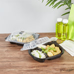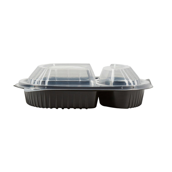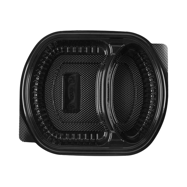 Enhance your food delivery service with our Chef 101 28-ounce Oval Black Plastic Food Containers. These food containers with lids come with two compartments, allowing you to pack different foods separately, ensuring their individual flavors and textures are preserved. To keep your food intact during delivery, these plastic food containers come with a clear plastic lid and create a tight seal to minimize spills. These to go containers are microwave-safe and allow customers to conveniently reheat their meals without the need for additional utensils. With a clear finish, the lids of these take out boxes provide excellent visibility and showcase your culinary creations. The black finish of these disposable food containers adds a touch of sophistication to your takeaway meals. These take out containers are freezer-safe and ideal for refrigerating your leftovers for later use. For eco-conscious establishments, these black food containers are recyclable and offer a sustainable way to package your take out orders. To ensure cleanup is quick and effortless, these plastic containers with lids are disposable and can be discarded after use. With a capacity of 28 ounces, these carry out containers measure 9.5 inches in length by 8 inches in width by 2.75 inches in height, providing ample space for generous portions. Sold in a 100 count box.