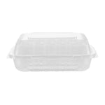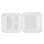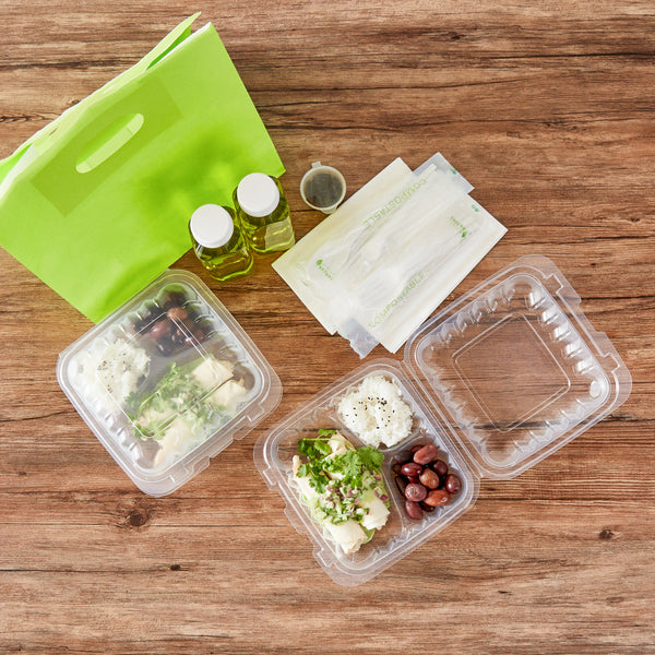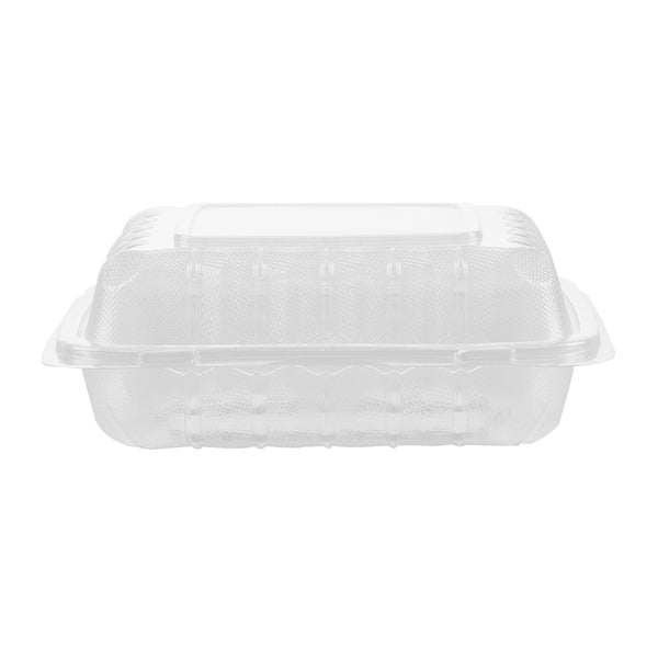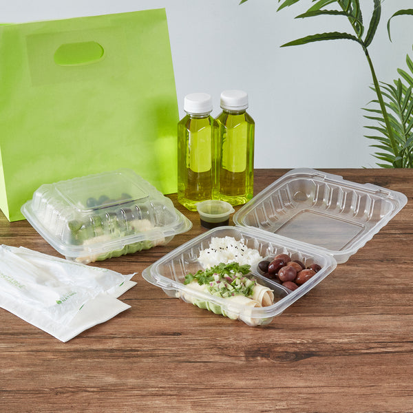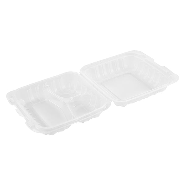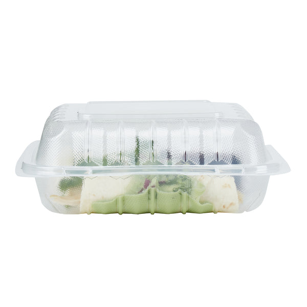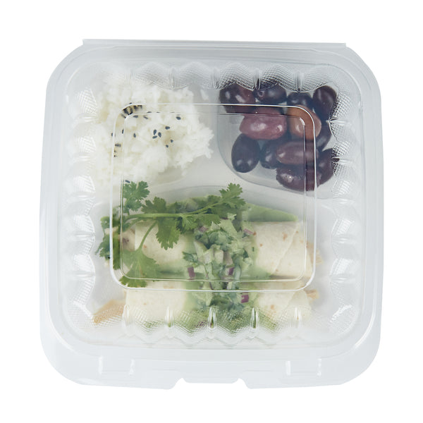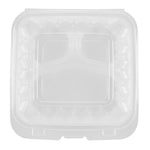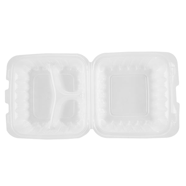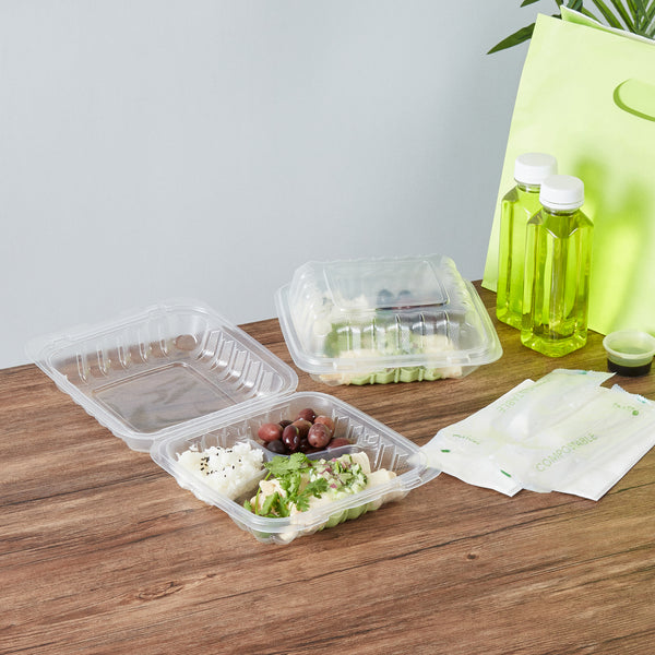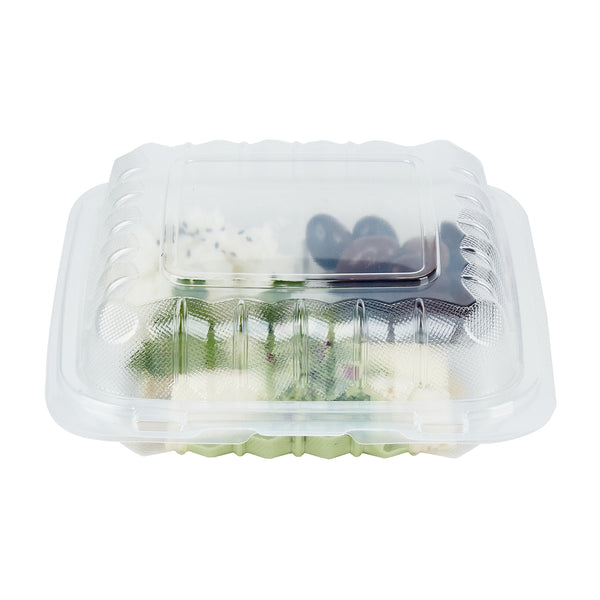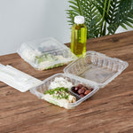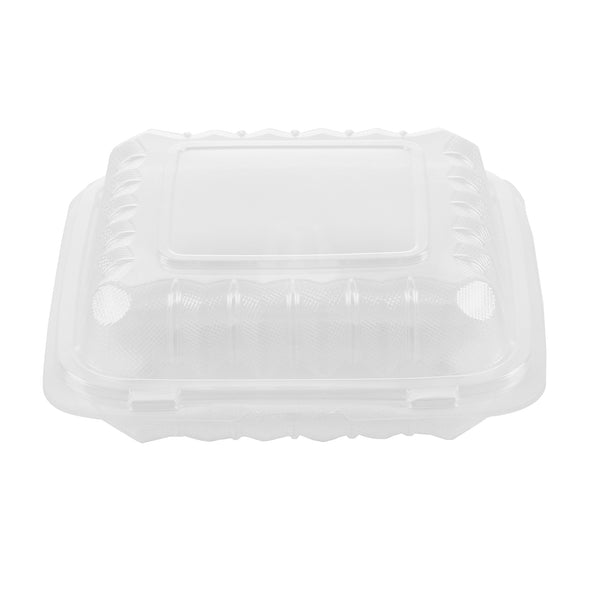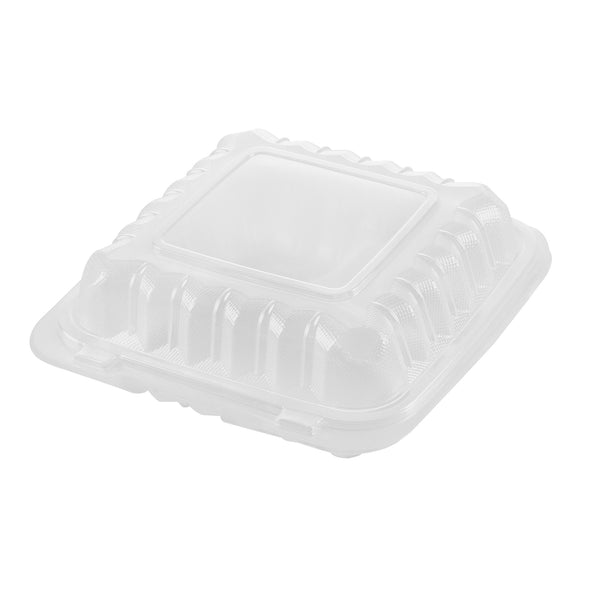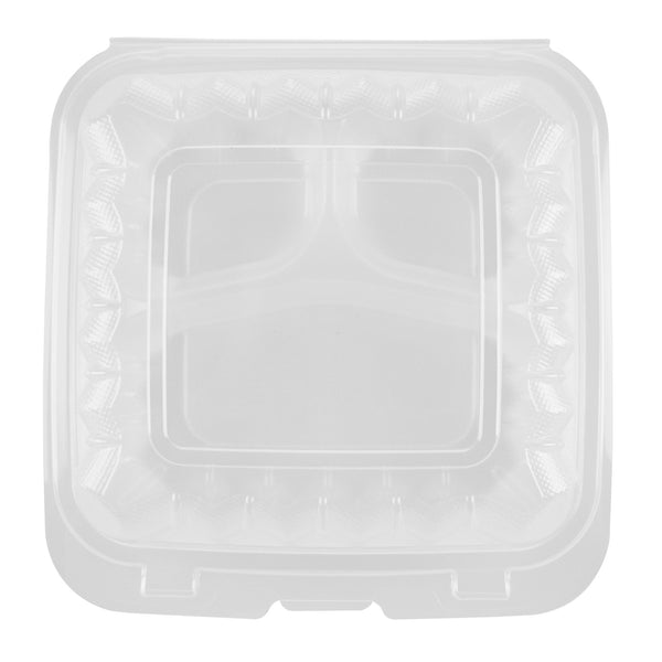 Efficiently transport and display meals with our Chef 101 30-ounce Square Clear Plastic Clamshell Containers. These take out containers have 3 compartments and keep different foods separated, preserving their flavors and textures for a fresh and organized meal. Microwave-safe for maximum convenience, these to go containers enable customers to heat their meals easily. These take out boxes are equipped with a hinged lid and form a tight-fitting seal, keeping your food intact during transportation. The clear finish of these takeaway containers expertly showcases the contents of the containers, enhancing their visual appeal. Crafted from durable plastic, these clamshell containers are perfect for serving both hot and cold dishes. These disposable food containers can be discarded after use and offer an easy cleanup. Designed to be freezer-safe, these to go boxes are ideal for storing leftovers for later use. Ideal for environmentally-friendly foodservice establishments, these clear food containers are recyclable. Each carry out container measures 7.5 inches in length by 7.5 inches in width by 2.75 inches in height and boasts a capacity of 30 ounces. Sold in a 50 count box.