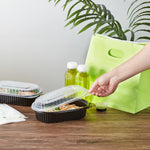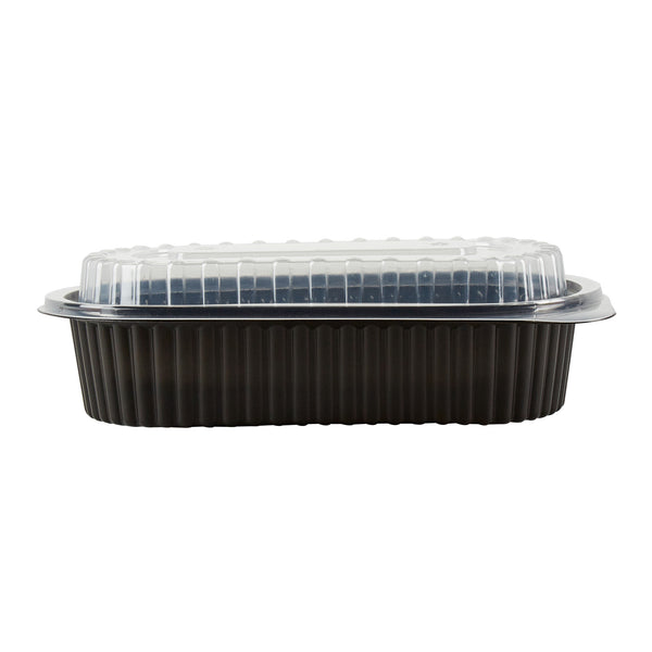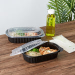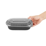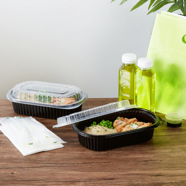 Pack food with our Chef 101 32-ounce Oval Black Plastic Food Containers. These take out containers come with a clear plastic lid and form a secure seal, keeping your food intact during transit. The dome-shaped design of these clear lids provides ample space to accommodate extra toppings. These to go containers are microwave-safe and offer customers the convenience of reheating meals without the need for additional utensils. Created from premium plastic, these carry out containers can hold hot and cold food items. These clear plastic lids offer excellent visibility and facilitate easy content identification, streamlining your operation. The black finish of these plastic food containers instantly elevates your food presentation and makes them visually appealing. These food containers with lids are freezer-safe and let you refrigerate your leftovers. Suitable for ecologically-conscious foodservice establishments, these plastic to go containers are recyclable. To shorten your cleanup, these disposable food containers can be discarded after use for quick cleanup. With a total capacity of 32 ounces, these plastic containers with lids measure 9.25 inches in length by 6 inches in width by 2.5 inches in height. Sold in a 100 count box.