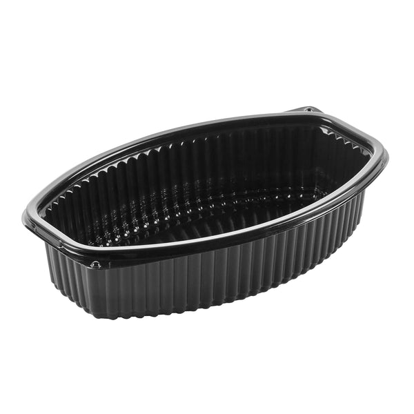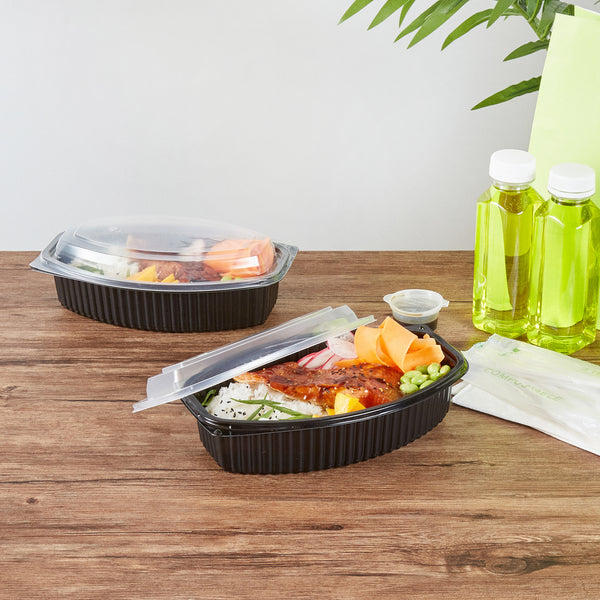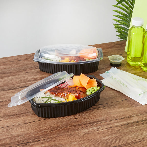Enhance your food delivery experience with our Chef 101 32-ounce Oval Black Plastic Food Containers. These plastic food containers come with clear lids and form a tight seal, preventing spills and keeping your food intact in transit. With a flat design, these clear plastic lids allow for easy stacking and storage, maximizing space efficiency and ensuring secure transport. These to go containers are microwave-safe, offering customers the convenience of reheating their meals without needing to transfer them to another dish. Crafted from premium plastic, these take out containers are suitable for holding hot and cold food items. With transparent lids, these take out food containers showcase the delicious contents inside, making them visually appealing. The sleek black finish of these carry out containers adds a touch of sophistication to any meal presentation. Ideal for storing your leftovers, these disposable food containers are freezer-safe and allow you to refrigerate your food for later use. For eco-conscious establishments, these to go boxes are recyclable and help minimize your carbon footprint. These plastic containers with lids are disposable and can be discarded after use, facilitating an easy cleanup. Measuring 9.25 inches in length by 5.75 inches in width by 3 inches in height, these food containers with lids have a capacity of 32 ounces and offer ample space for a variety of dishes. Sold in a 50 count box.