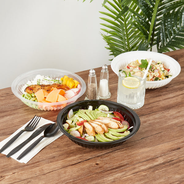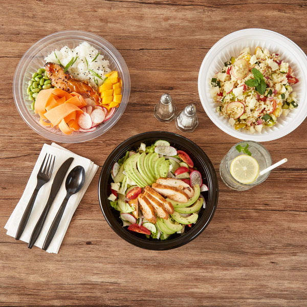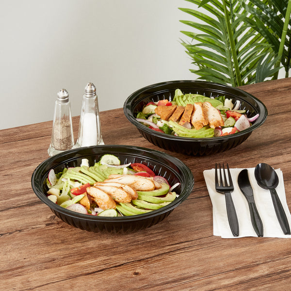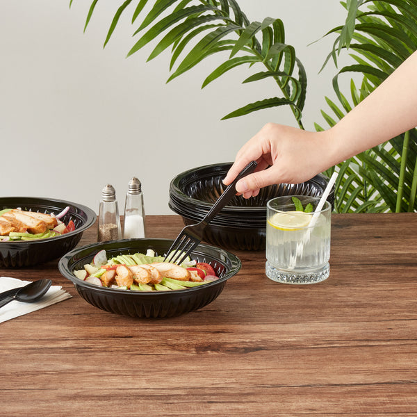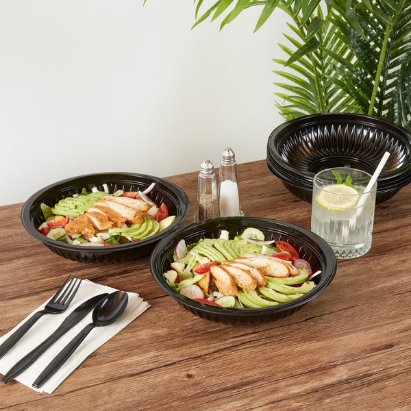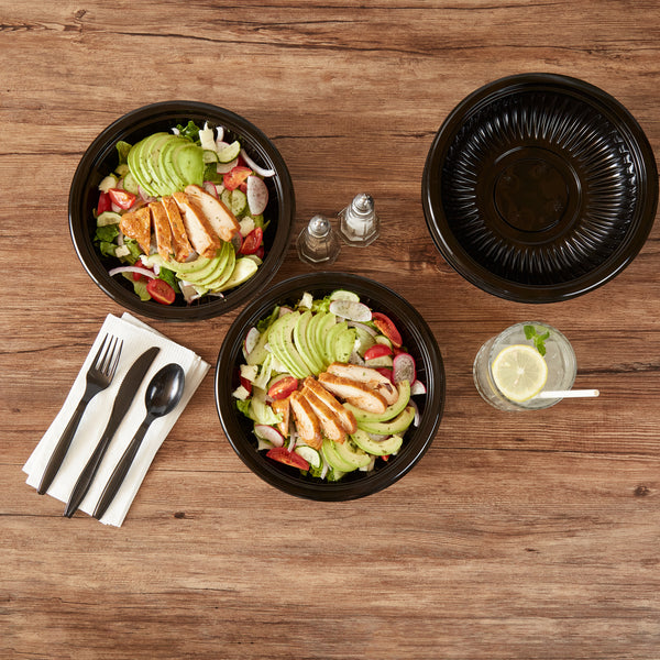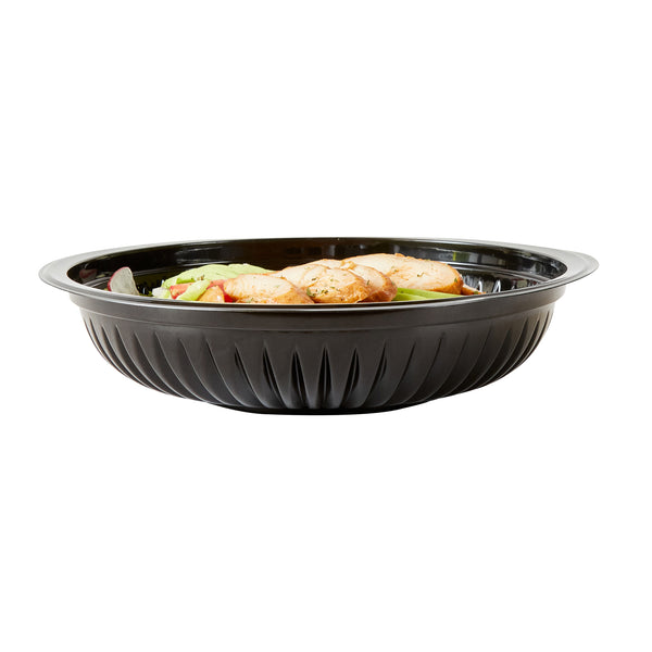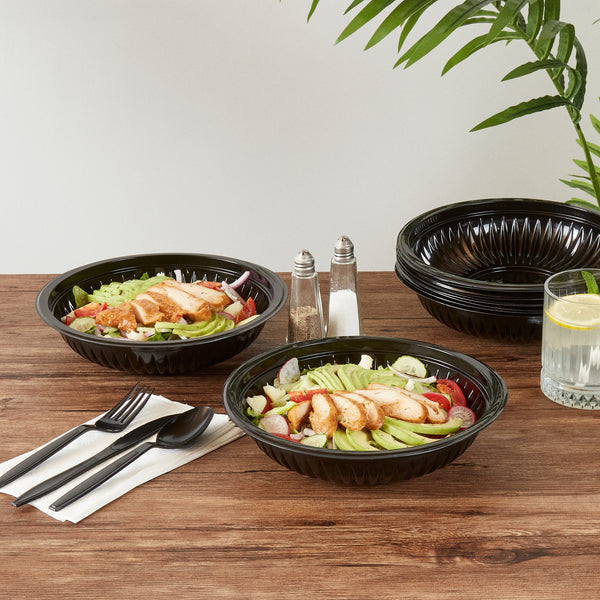 Elevate your dining experience with our Chef 101 34-ounce Round Black Plastic Bowls. These disposable bowls are designed to be microwave-safe and allow you to reheat meals easily without any hassle. Created from premium plastic, these serving bowls are suitable for both hot and cold food items, ensuring versatility in your kitchen. The sleek black finish of these food bowls enhances your food presentation and makes them ideal for serving food on various occasions. These plastic serving bowls are disposable and can be tossed after use, providing an easy cleanup solution. Plus, these pasta bowls are recyclable, offering an eco-friendly way to serve meals and reduce your carbon footprint. Measuring 9 inches in diameter by 2 inches in height, these plastic bowls have an ample capacity of 34 ounces and accommodate generous portions. Sold in a 50 count box.