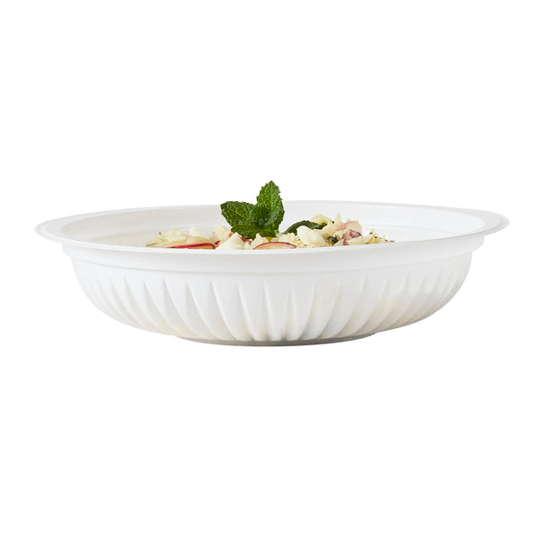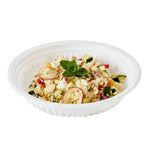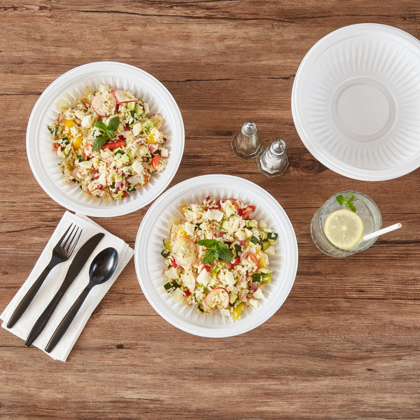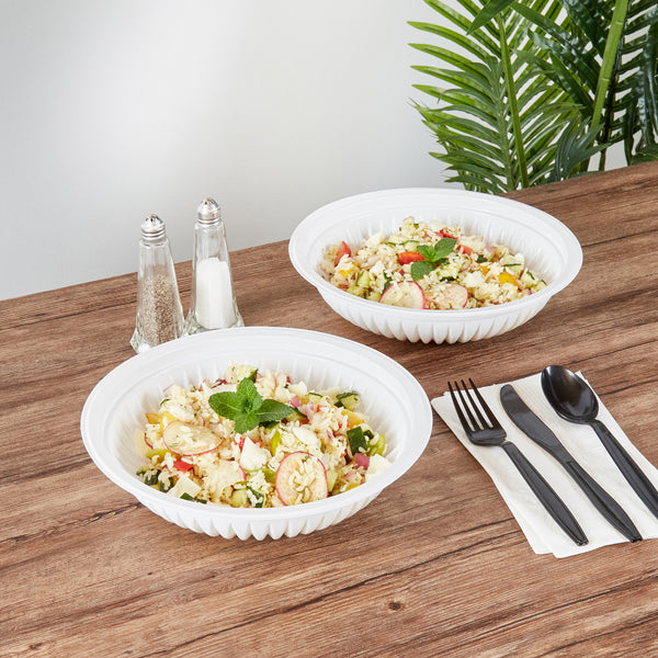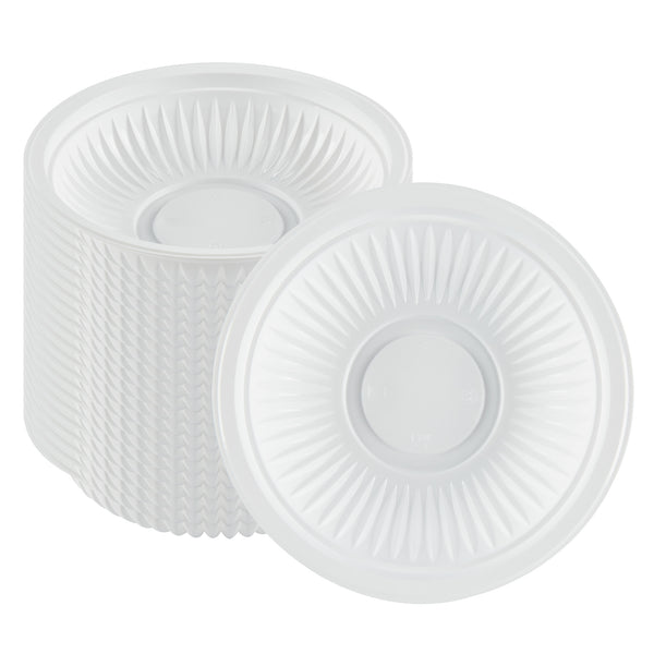 Elevate your foodservice experience with our Chef 101 34-ounce Round White Plastic Bowls. These disposable bowls are microwave-safe and allow you to easily reheat your meals, ensuring they are served at the perfect temperature. Created from premium plastic, these serving bowls are suitable for both hot and cold food items, making them ideal for any menu. The elegant white finish of these plastic serving bowls makes every dish visually appealing and complements various tablescapes. Designed for convenience, these food bowls are disposable, allowing for an effortless cleanup after each use. These white bowls are recyclable, providing an eco-friendly way to serve meals. With a generous capacity of 34 ounces, these plastic bowls measure 9 inches in diameter by 2 inches in height and offer ample space for your culinary creations. Sold in a 50 count box.