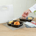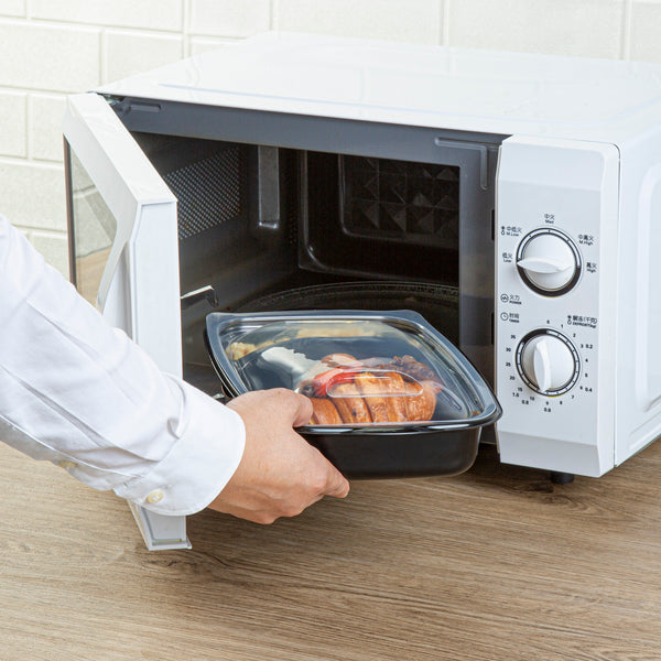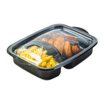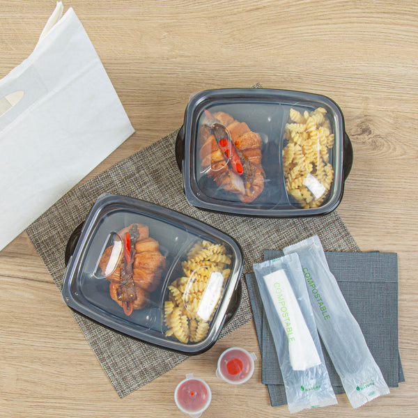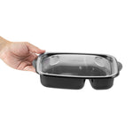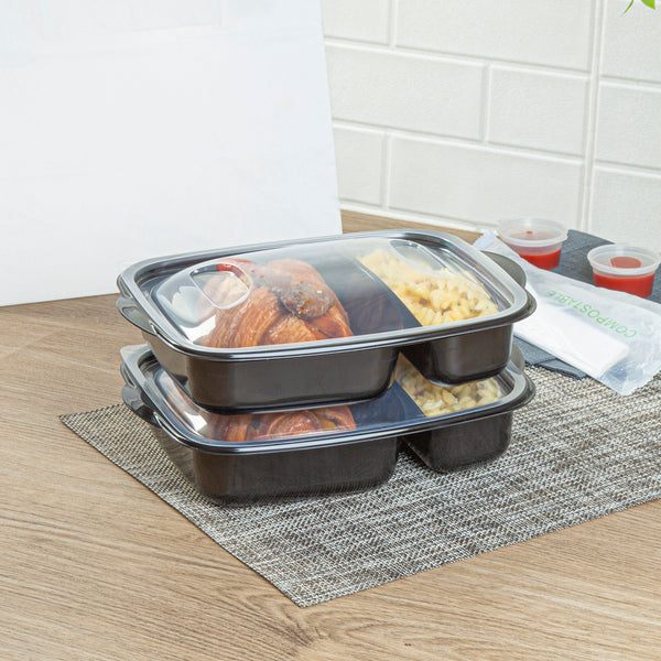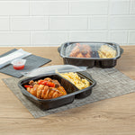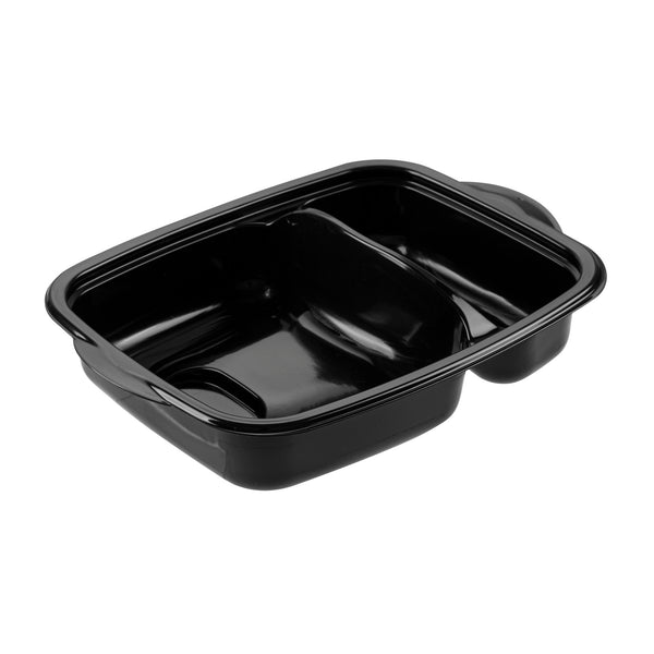 Enhance meal prep efficiency with our microwaveable takeout container. The Chef 101 Black Plastic Microwaveable Takeout Container, measuring 8.86 inches in length, is crafted from durable PP plastic, making it ideal for rigorous catering demands. Its microwave-safe design simplifies reheating and serving. The clear included lid secures freshness, enhancing the culinary delight for customers, and the two-compartment design keeps food items separate, maintaining flavor integrity. These food containers are also freezer-safe, extending storage options for restaurants and catering events. Elevate your meal presentation with the sleek black color, perfect for upscale dining experiences and meal prep services. Each order includes 50 Chef 101 Black Plastic Microwaveable Takeout Containers.