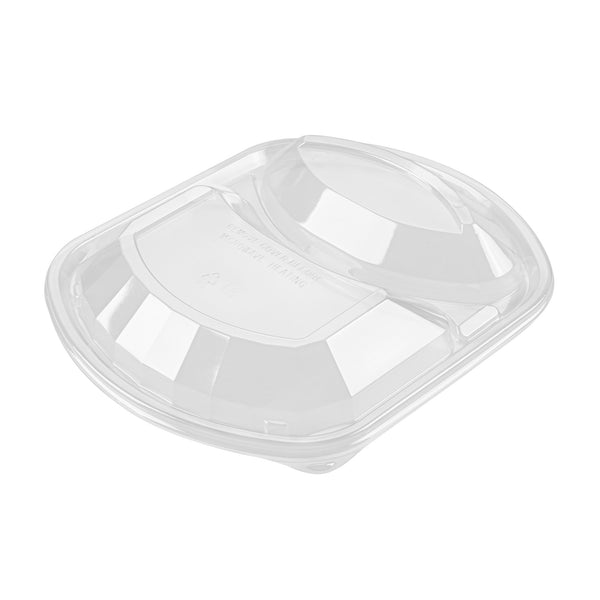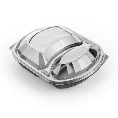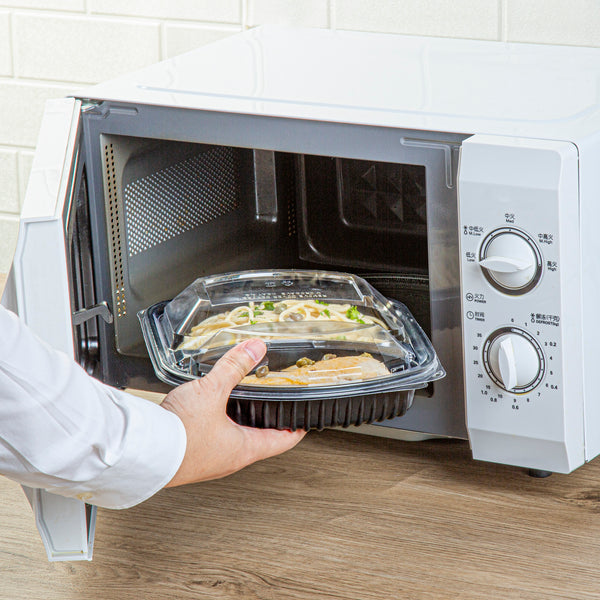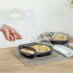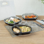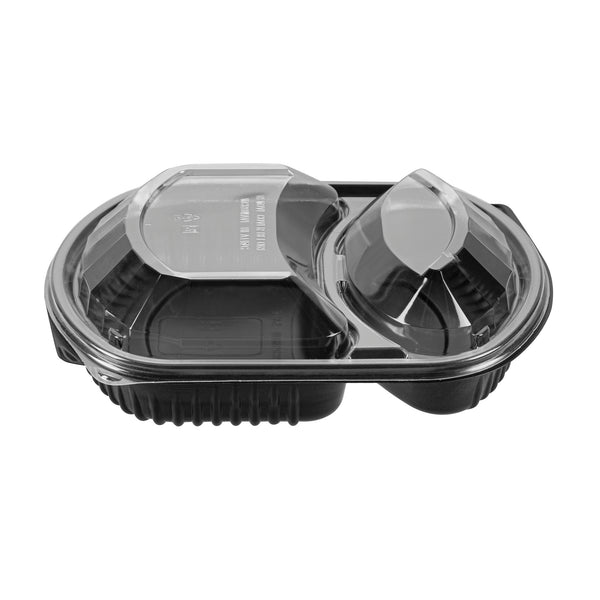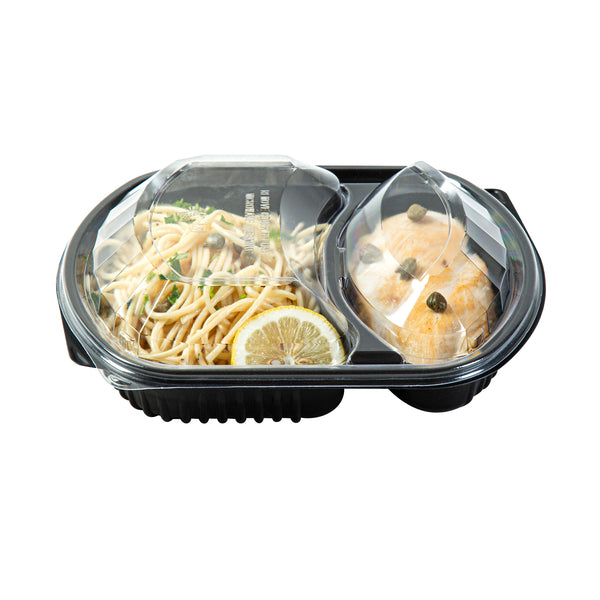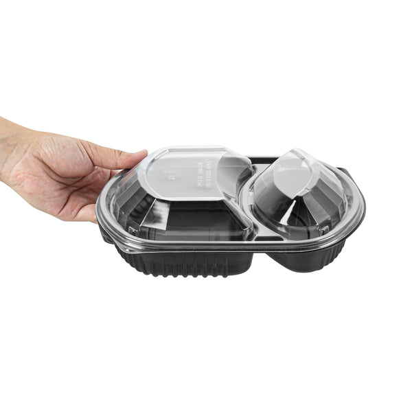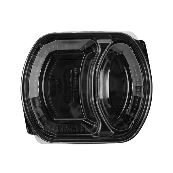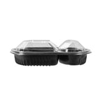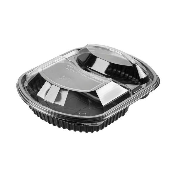 36 OZ BLACK PLASTIC FOOD CONTAINER - WITH CLEAR LID, 2 COMPARTMENTS