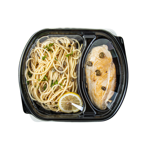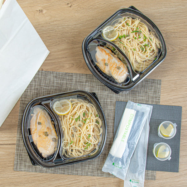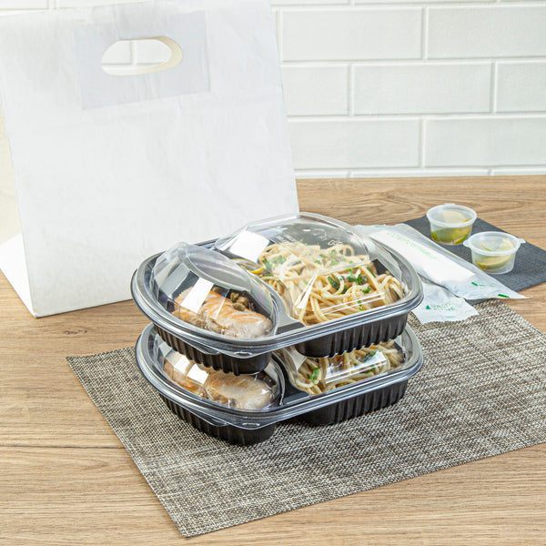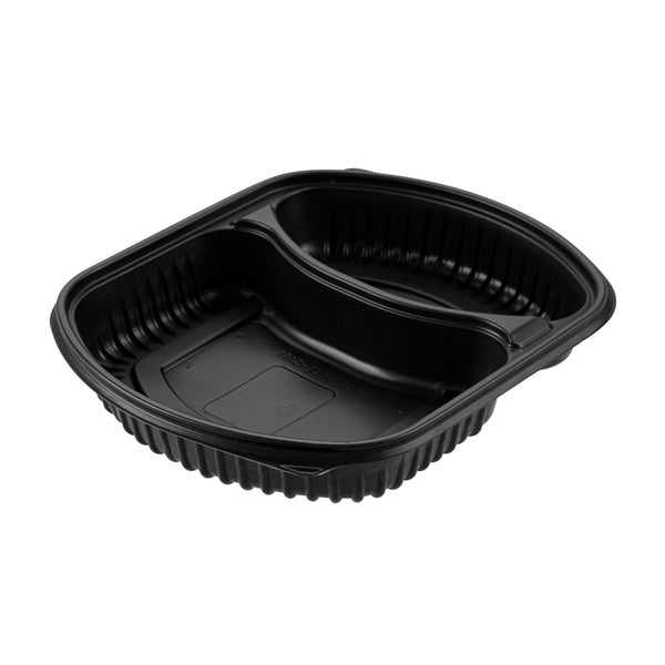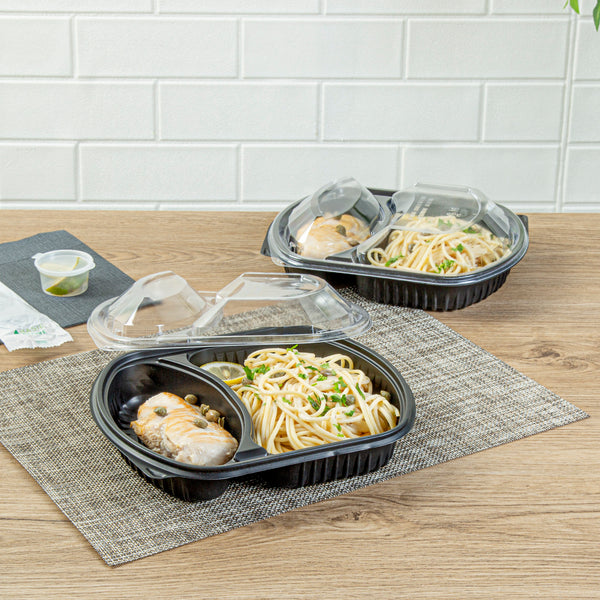 Enhance your foodservice efficiency. The Chef 101 Two-Compartment Container streamlines meal prep and delivery with its microwave-safe design, facilitating quick reheating of meals to optimize kitchen operations. Constructed from durable PP plastic, this black meal prep container withstands rigorous demands, ensuring reliable performance during transport and service. Its clear, tight-fitting lid secures freshness and prevents leaks, maintaining food integrity for customer satisfaction. The compartment food container features a two-compartment layout, preserving flavors and presentation by keeping ingredients separate. Measuring 9.25 inches in length, this sleek container offers a capacity of 36 ounces, ideal for portioning and storing balanced meals. Its freezer-safe design extends the shelf life of dishes like soups and stews, while its dishwasher-safe feature simplifies post-service cleanup. Each order includes 100 Chef 101 Two-Compartment Microwaveable Takeout Containers.