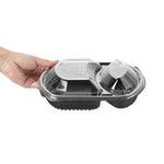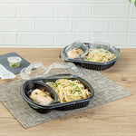 36 OZ BLACK PLASTIC FOOD CONTAINER - WITH CLEAR LID, 2 COMPARTMENTS
