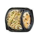 Enhance your foodservice efficiency. The Chef 101 Two-Compartment Container streamlines meal prep and delivery with its microwave-safe design, facilitating quick reheating of meals to optimize kitchen operations. Constructed from durable PP plastic, this black meal prep container withstands rigorous demands, ensuring reliable performance during transport and service. Its clear, tight-fitting lid secures freshness and prevents leaks, maintaining food integrity for customer satisfaction. The compartment food container features a two-compartment layout, preserving flavors and presentation by keeping ingredients separate. Measuring 9.25 inches in length, this sleek container offers a capacity of 36 ounces, ideal for portioning and storing balanced meals. Its freezer-safe design extends the shelf life of dishes like soups and stews, while its dishwasher-safe feature simplifies post-service cleanup. Each order includes 50 Chef 101 Two-Compartment Microwaveable Takeout Containers.