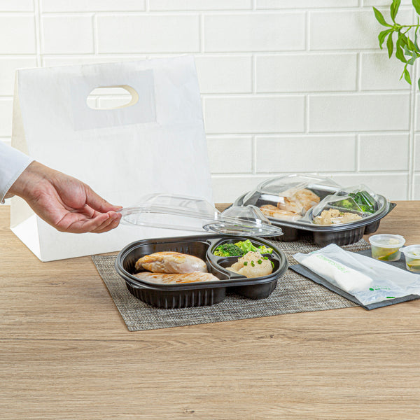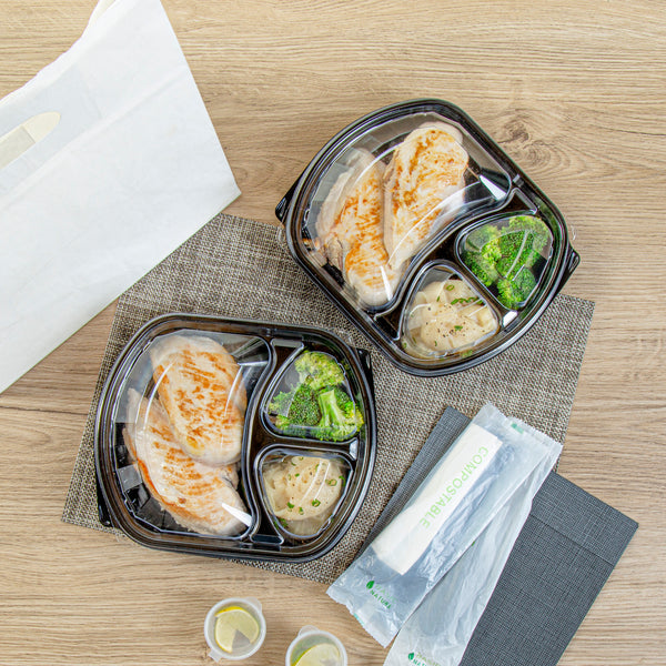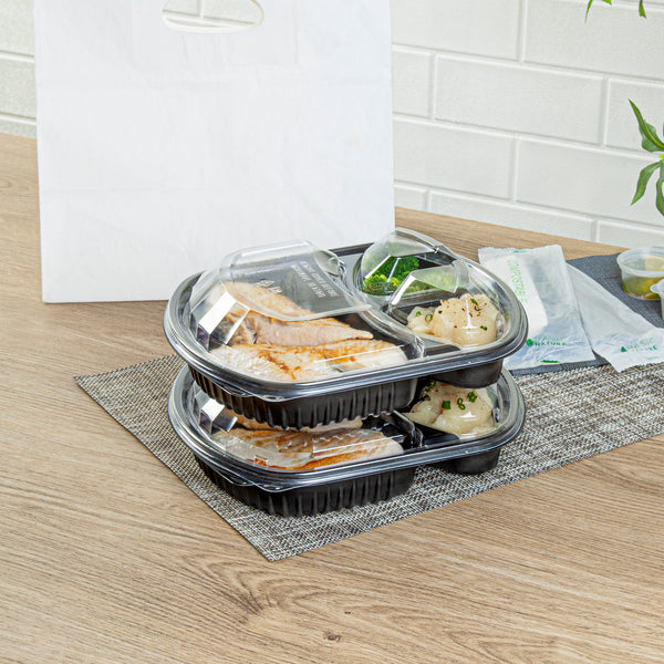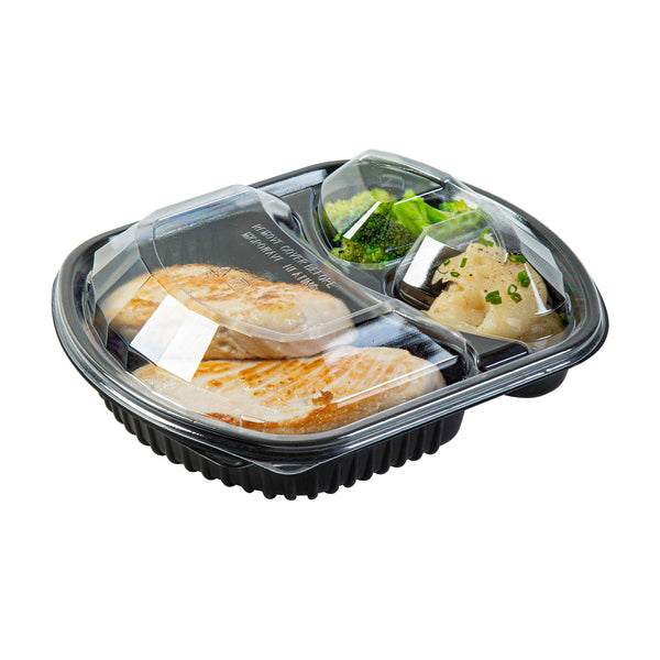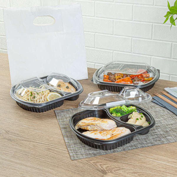 Optimize your meal delivery process with versatile microwaveable takeout containers. Chef 101 Microwave-Safe Three-Compartment Microwaveable Takeout Containers offer convenient meal prep and reheating with their robust PP plastic construction, effortlessly withstanding temperatures. These bento-style takeout containers feature a three-compartment design, ensuring flavor integrity by keeping dishes separate, while the clear lids enhance presentation and secure freshness. Made from plastic, these black plastic to-go containers guarantee safe food storage for diners, providing peace of mind for foodservice professionals. Additionally, their freezer-safe design is perfect for meal prepping and long-term storage, supporting the dynamic needs of catering and delivery services. Enhance your kitchen's efficiency and storage with stackable containers. Each order includes 100 Chef 101 Microwave-Safe Three-Compartment Microwaveable Takeout Containers.