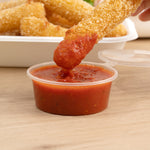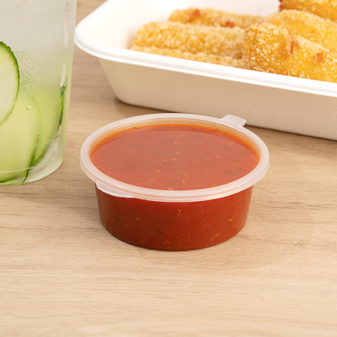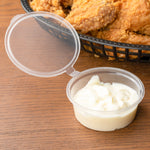 Provide customers with classic condiments alongside their foods using our Chef 101 4-ounce Clear Plastic Portion Cups. These sauce cups with lids are made with recyclable plastic to quickly dispose of cups in an eco-friendly way. These disposable portion cups are designed with a built-in hinged lid that securely seals in toppings to avoid spills during delivery. Ideal for restaurants, cafes, and other foodservice establishments, these plastic condiment cups with lids are microwave-safe to conveniently heat up sauces for guests. These sauce cups with lids can hold up to 4 ounces of your favorite condiments. The clear finish of these disposable portions cups matches the look of your serving supplies to create a seamless appearance to food displays. For a space-saving way to store condiments and toppings, stack these sauce cups with lids. These plastic condiment cups with lids measure 3.25 inches in diameter and 1.25 inches in height. Shipped in a 100 count box.