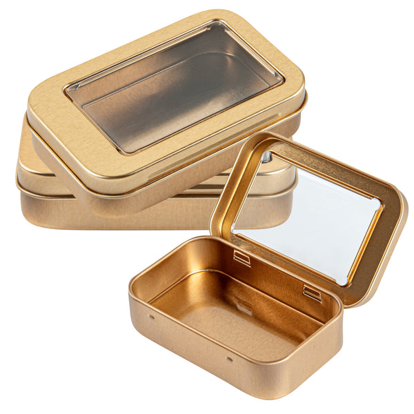 4 OZ RECTANGLE GOLD TIN CONTAINER - WITH WINDOW LID