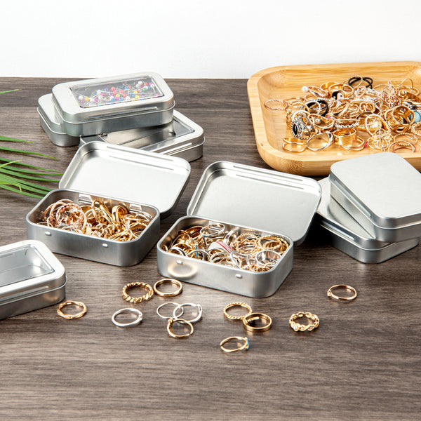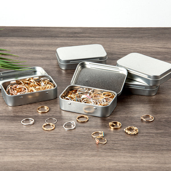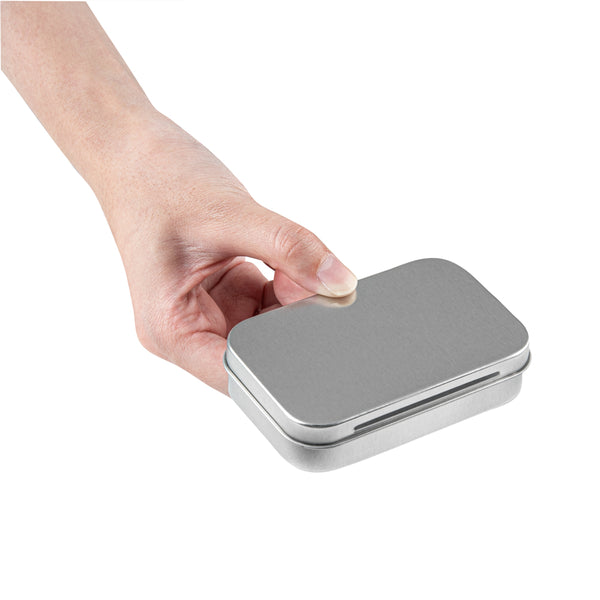 Pack your corporate gifts using our Chef 101 4-ounce Rectangle Silver Tin Containers. These metal storage containers are constructed using top-quality tinplate material, allowing you to use them for a long time without worrying about breakage. Manufactured with hinged lids, these rectangular storage tin containers can be flipped open or closed by simply pressing the lids, obviating the chances of dropping the lids while opening. The round edges of these metal storage boxes are smooth to provide you with a comfortable grip while using them. To let you carry your pills, mints, or candies everywhere, these rectangular tin boxes with hinged lids are compact and fit in any bag. With a plain silver finish surface, you can label these tin storage containers or tie a ribbon around them to gift your loved ones. These metal storage boxes measure 3.75 inches in length by 2.25 inches in width each and can hold up to 4 ounces. Sold in a 10 count box.