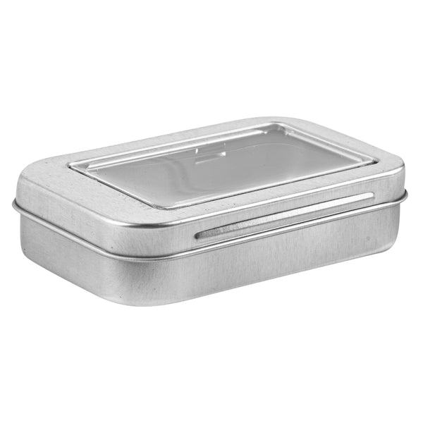 4 OZ RECTANGLE SILVER TIN CONTAINER - WITH WINDOW LID
