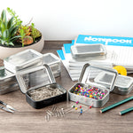 Carry your mints everywhere using our Chef 101 4-ounce Rectangle Silver Tin Containers. These metal storage boxes are made of high-quality tinplate material, allowing them to withstand rigorous use for a long time. The press-on lids with the clear PVC window fit tightly to the body of these tin storage boxes, securing the contents inside while allowing you to see them too. With smooth, rounded edges, these metal storage containers protect your hand from accidental cuts. The sleek design of these rectangular storage tin boxes lets you carry them on the go or fit them comfortably in any of your bags. With a plain silver finish on the surface of these metal storage containers with lids, you can stick labels on them or tie ribbons for decoration. Measuring 3.75 inches in length by 2.25 inches in width, these storage tins with lids can hold up to 4 ounces. Sold in a 10 count box.