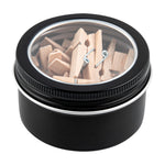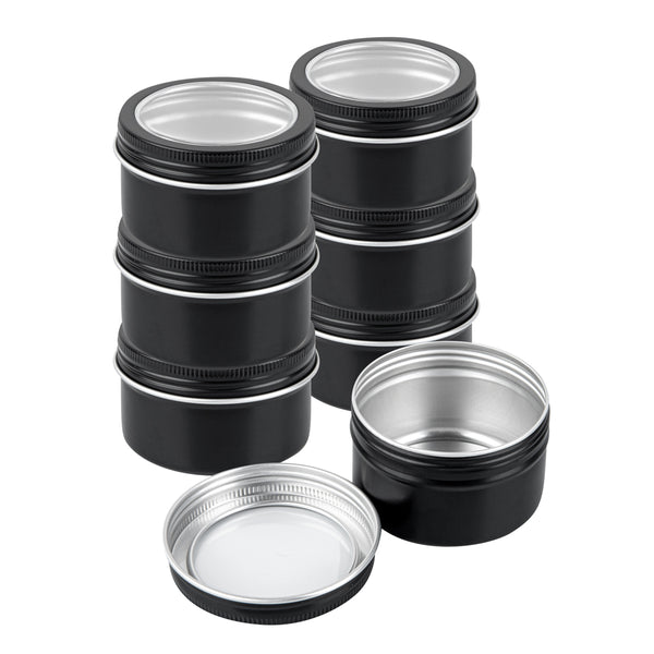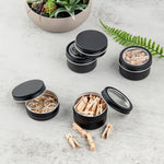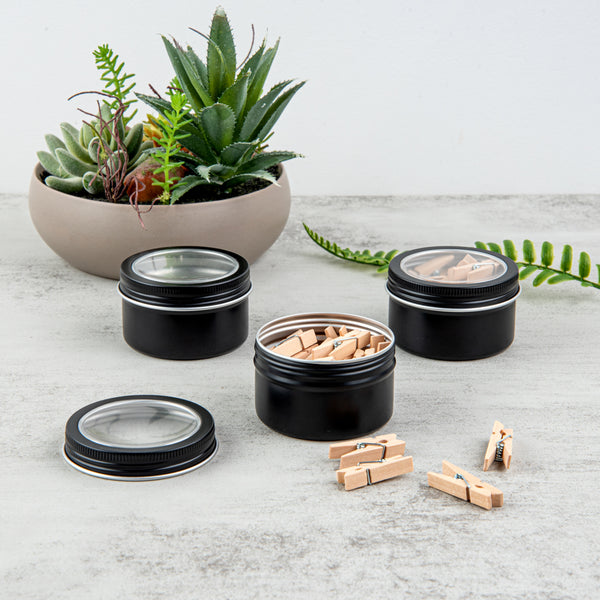 Pack your small rings using our Chef 101 4-ounce Round Black Tin Containers. Made of durable aluminum, these metal storage containers won't rust or break. The screwable lids of these aluminum boxes for storage have a window-like feature made of PVC plastic, allowing you to see the contents inside without having to open the containers. Plus, the lids of these containers for storage are tight fitting and secure the items inside. The slim and sleek design of these decorative storage boxes allows you to carry them in your bags or store them anywhere easily. Customize these containers with lids with a ribbon or a sticker, as they come in a plain black finish surface. Measuring 2.75 inches in diameter by 1.75 inches in height, these round storage boxes can hold up to 4 ounces. Sold in a 10 count box.