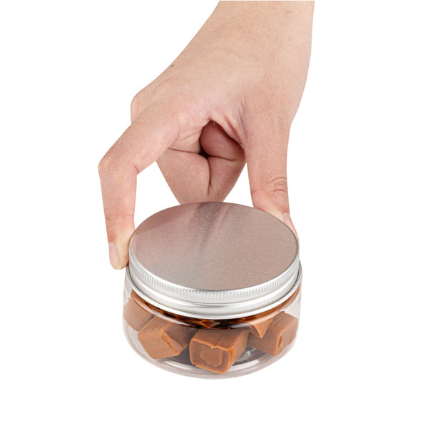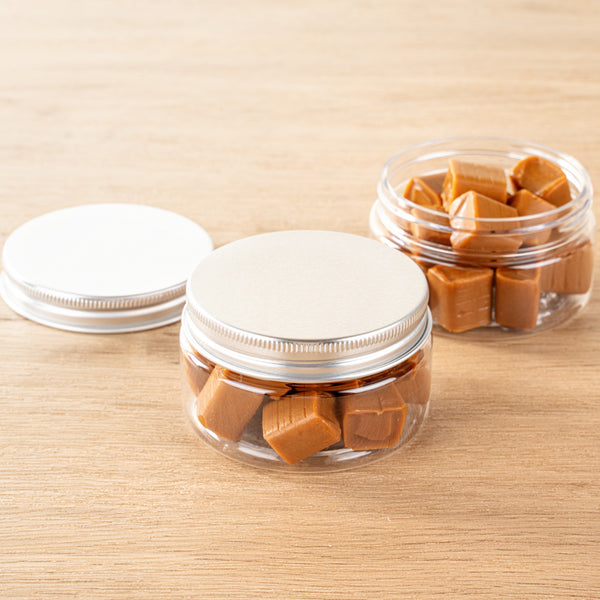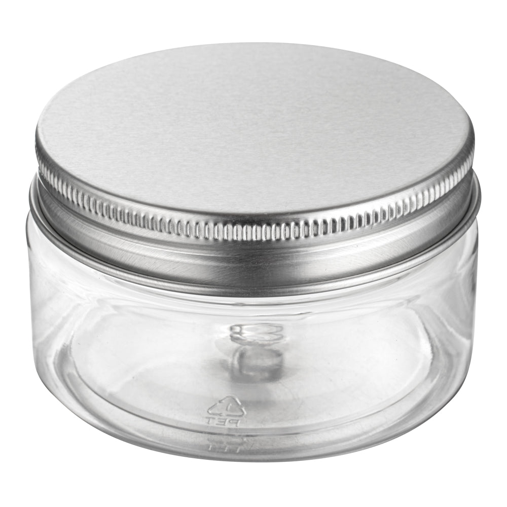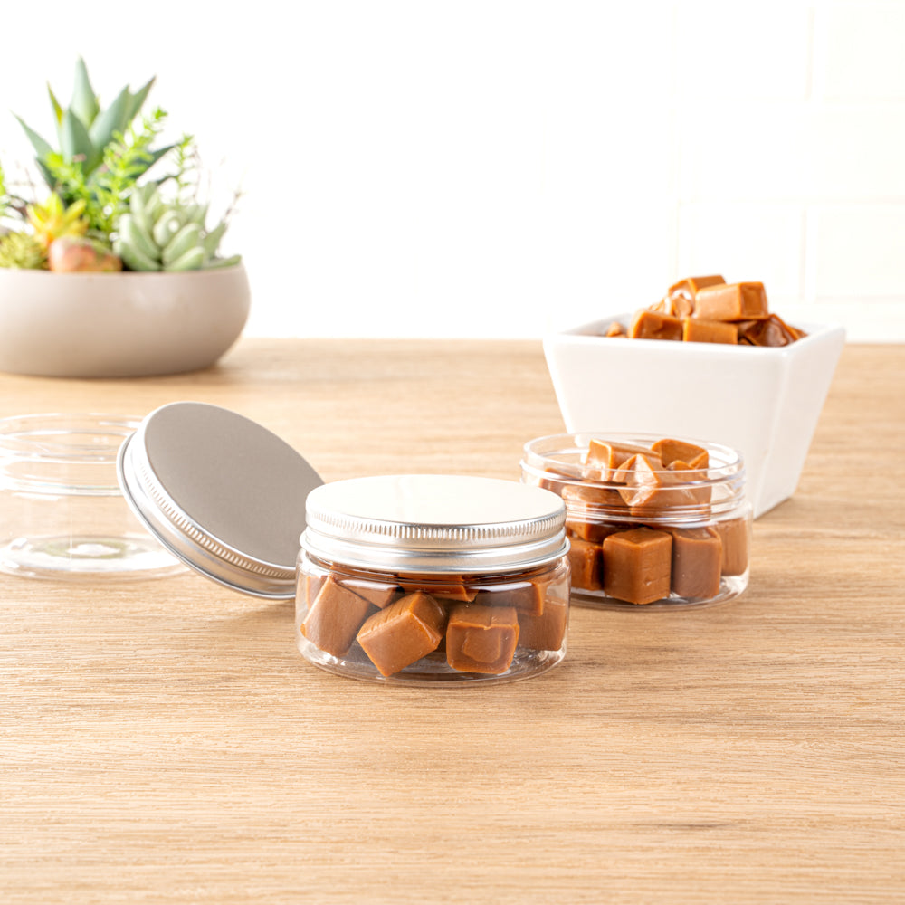 4 OZ CLEAR PLASTIC CANDY AND SNACK JAR - WITH SILVER ALUMINUM LID