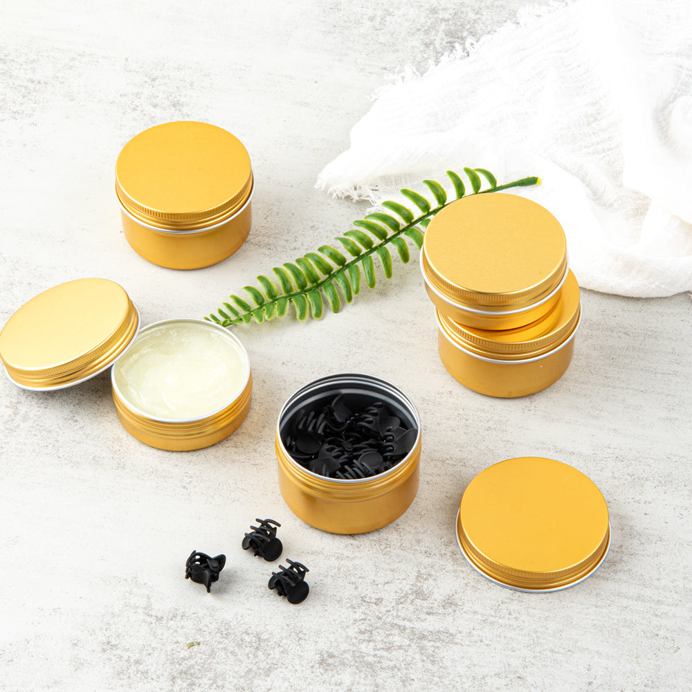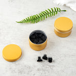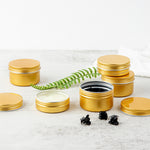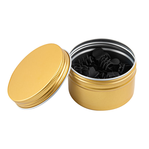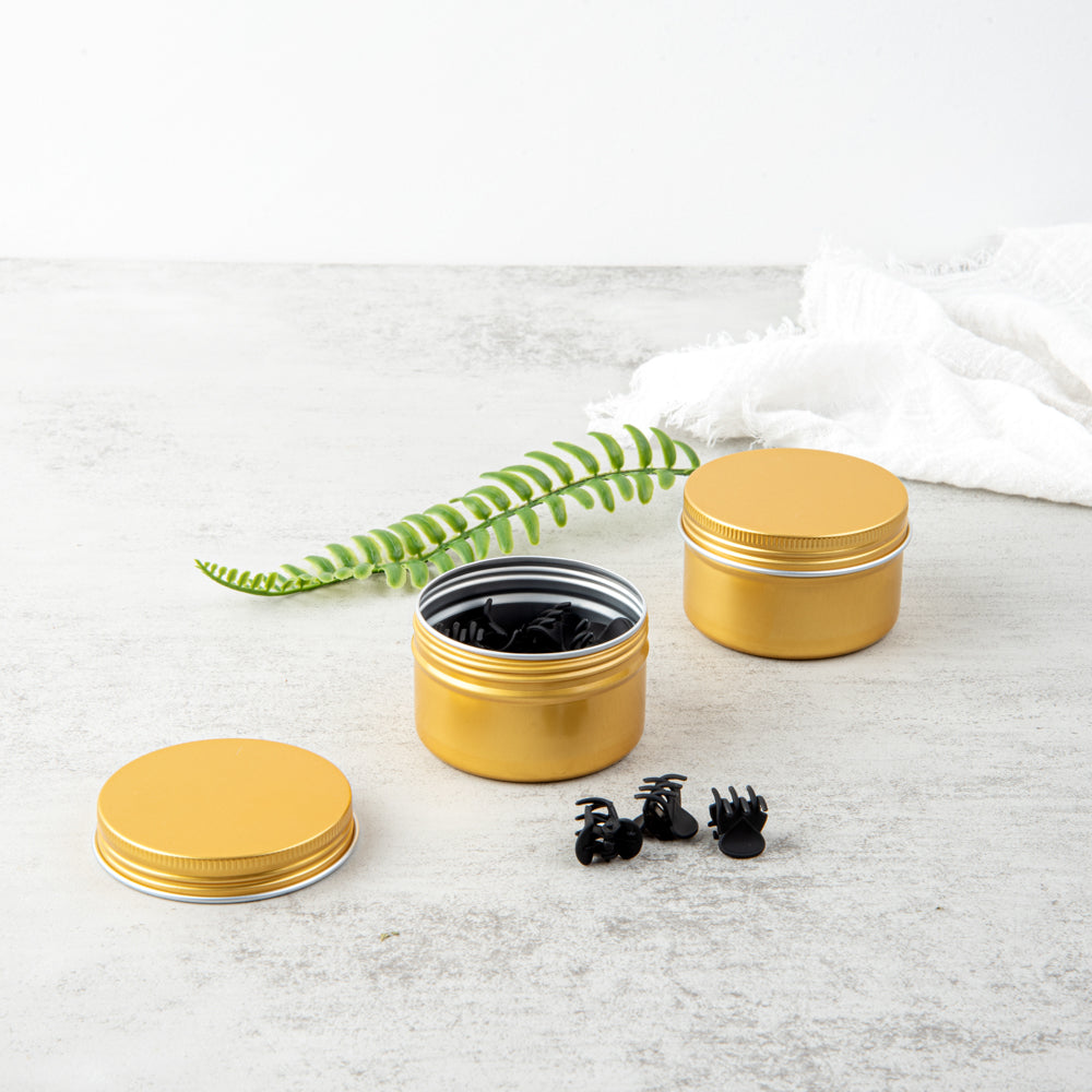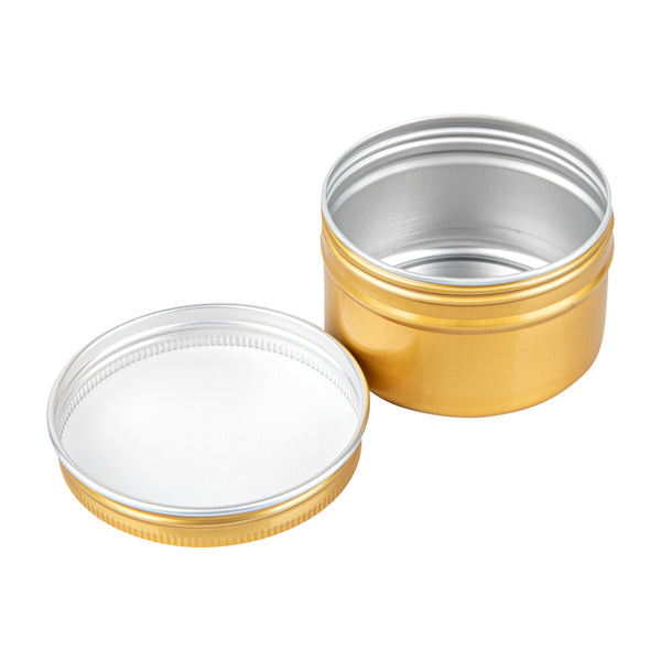 Organize your stationery items using our Chef 101 4-ounce Round Gold Tin Containers. The premium aluminum build of these decorative storage boxes makes them durable and virtually unbreakable. Equipped with screwable, tight-fitting lids, these storage containers secure the contents inside, avoiding accidental spills during transit. The compact design of these round metal storage boxes allows you to store them anywhere on the shelves without taking up much space. These aluminum boxes for storage come with a gold finish, enhancing the appearance of the items inside. Each of these containers for storage measures 2.75 inches in diameter by 1.75 inches in height and has a capacity of 4 ounces. Sold in a 100 count box.