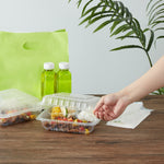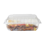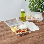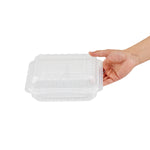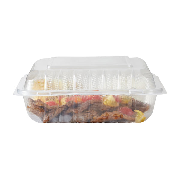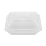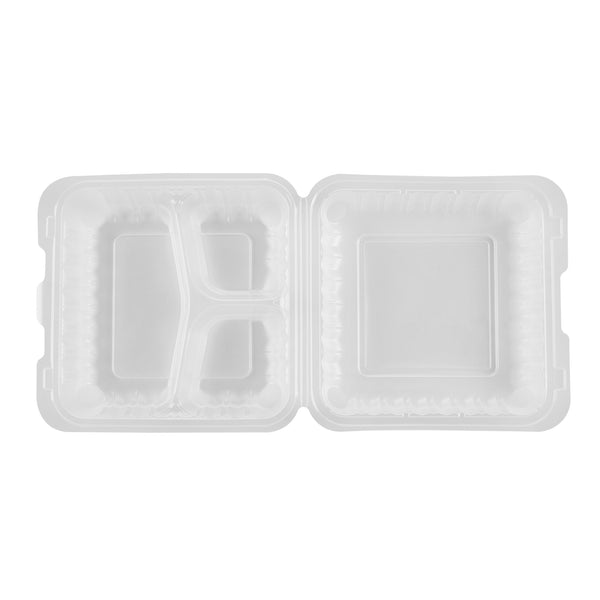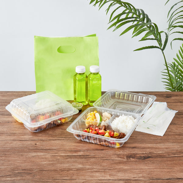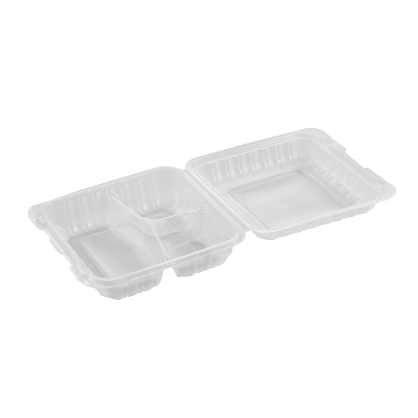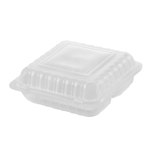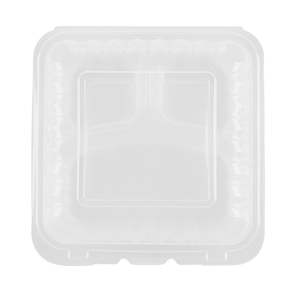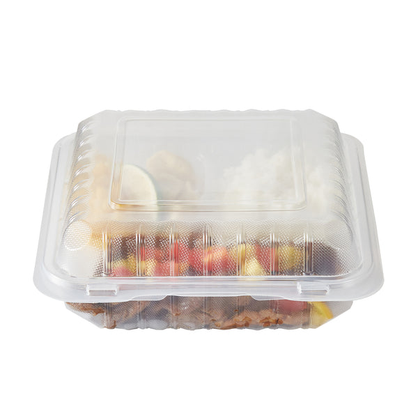 Enhance the presentation and functionality of your foodservice offerings with our Chef 101 47-ounce Square Clear Plastic Clamshell Containers. Featuring 3 compartments, these carry out containers keep food items neatly separated for easy transport and storage. Ideal for busy customers, these take out boxes are microwave-safe for maximum convenience, enabling easy meal reheating. With a built-in hinged lid, these take out containers form a secure seal, ensuring your food remains intact during transportation. These to go boxes have a clear finish and enhance visibility of the contents, making them perfect for showcasing food items attractively and ensuring easy identification. Crafted from durable plastic, these clamshell containers are perfect for serving both hot and cold dishes. These takeaway containers are disposable and can be discarded after use for a straightforward cleanup, saving you time and effort. To store your leftovers, these plastic food containers are freezer-safe, providing versatile storage options. These disposable food containers are recyclable and help reduce your carbon footprint. Measuring 9 inches in length by 9 inches in width by 3.5 inches in height, these plastic clamshell containers have a capacity of 47 ounces, making them ideal for generous portions. Sold in a 100 count box.