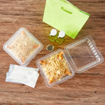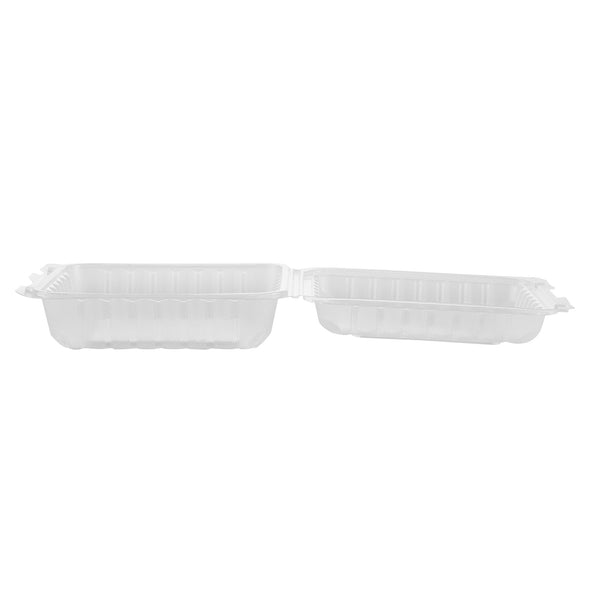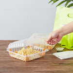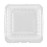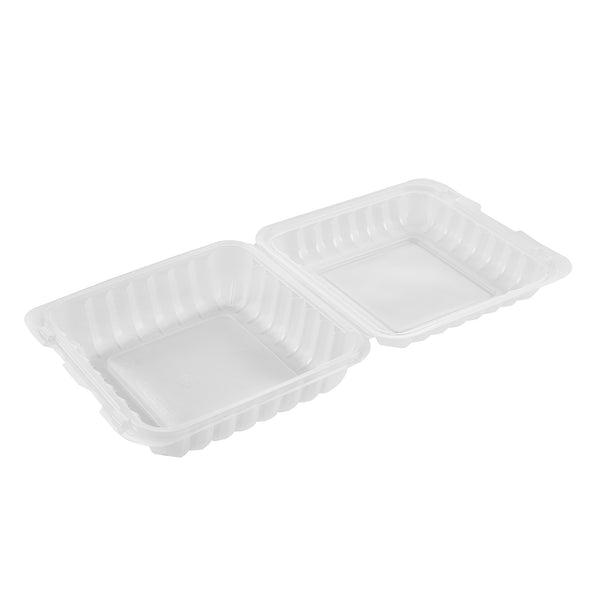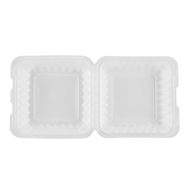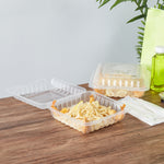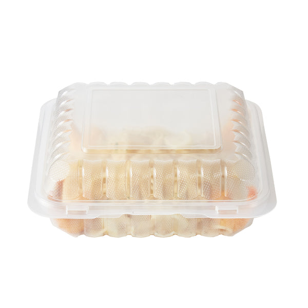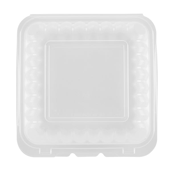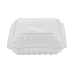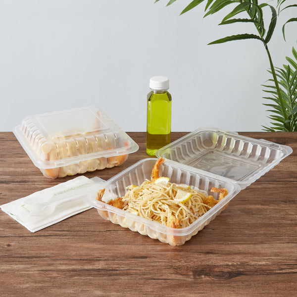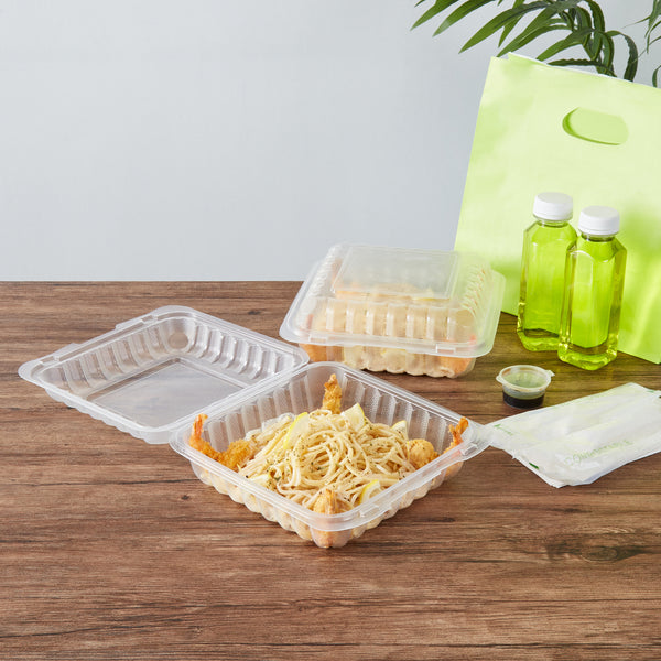 Elevate your food packaging game with our Chef 101 47-ounce Square Clear Plastic Clamshell Containers. These takeaway boxes are microwave-safe for maximum convenience, enabling customers to heat their meals easily. Designed with a built-in hinged lid, these take out boxes form a secure seal to ensure a mess-free take out solution. These take out containers have a clear finish and are perfect for showcasing food items. Crafted from durable plastic, these clamshell containers are perfect for serving hot and cold dishes. To store your leftovers, these takeaway containers are freezer-safe, providing versatile storage options. These carry out containers are disposable and can be discarded after use, offering an easy cleanup process. Perfect for eco-conscious foodservice establishments, these disposable food containers are recyclable. These to go boxes have a capacity of 47 ounces and measure 9 inches in length by 9 inches in width by 3.5 inches in height. Sold in a 100 count box.
