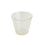 Add sparkle to your events with our Chef 101 5-ounce Gold Glitter Plastic Tumblers. With these party cups, highlight the elegance of gold glitter to elevate the aesthetics of any table setting at festive occasions. Made of hard and durable PS plastic, these glitter plastic cups can be used at weddings, birthdays, and more. These plastic glasses are cold food-friendly and ideal for chill beverages. The recyclable nature of these cocktail cups ensures a quick and sustainable cleanup, allowing you to effortlessly maintain an eco-conscious environment. Turn every occasion into a chic affair with these dazzling glasses that are disposable, providing an easy cleanup solution. At 2.8 inches in diameter and 2.3 inches in height, these 5-ounce gold plastic tumblers offer a compact size. Sold in a 20 count box.
