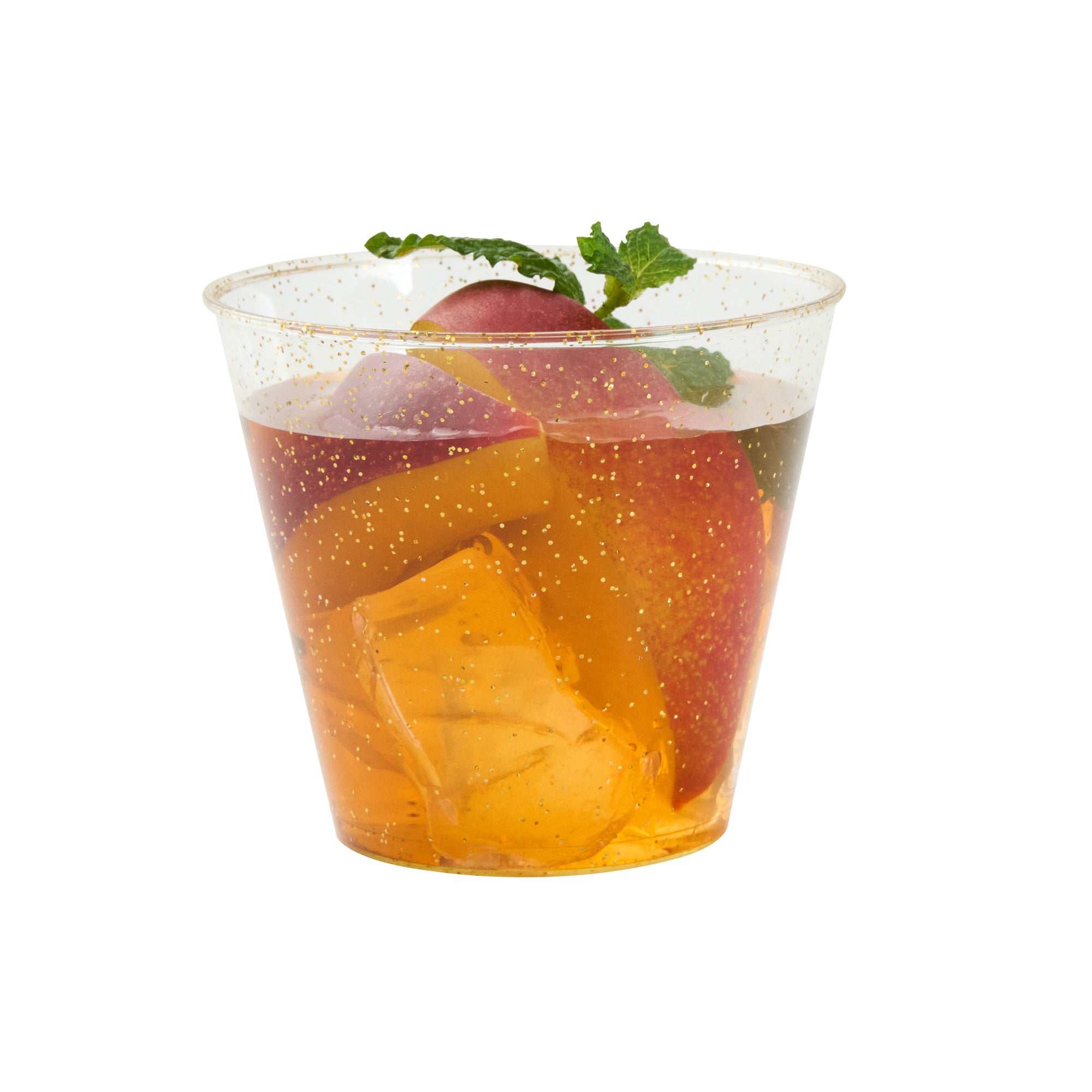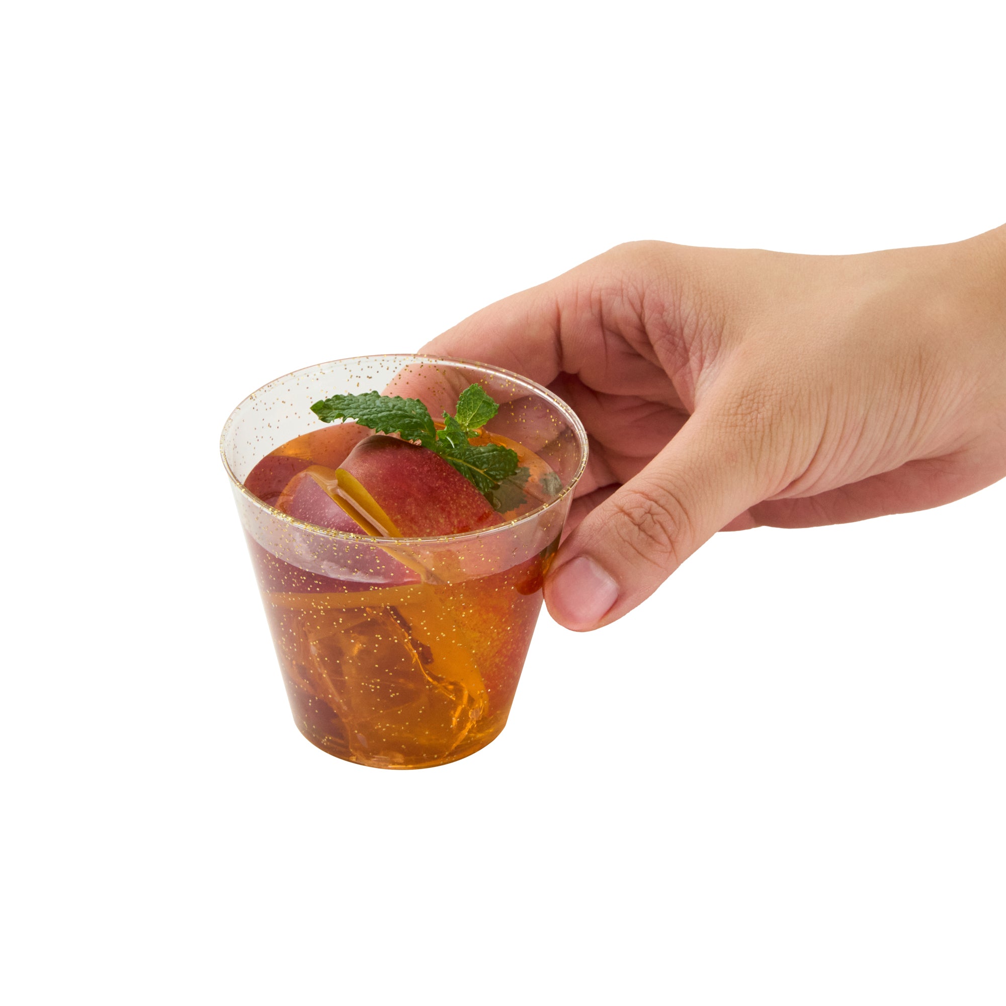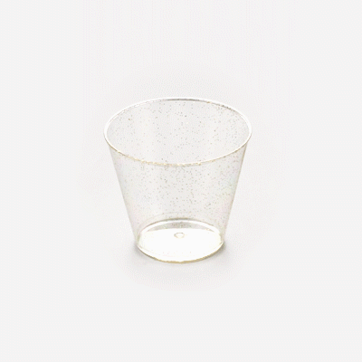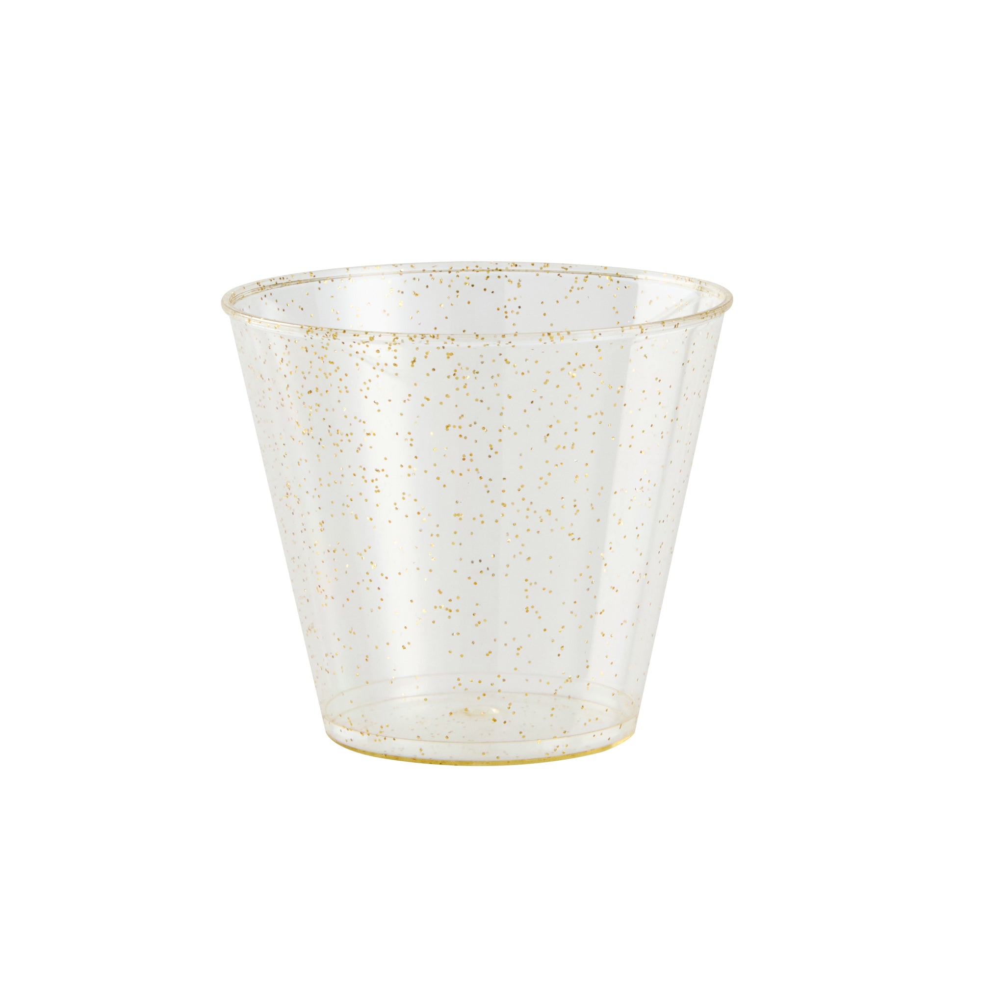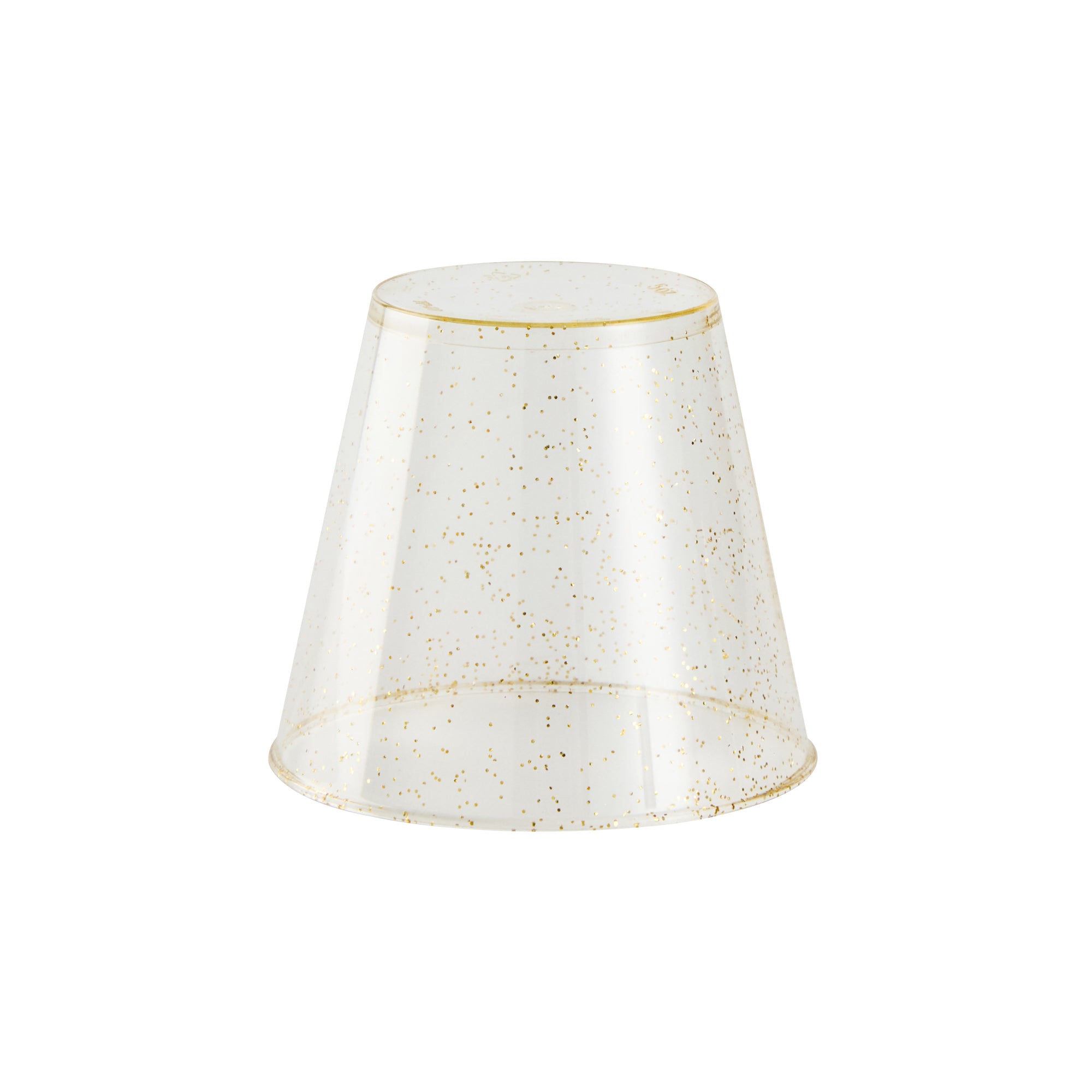 Add sparkle to your events with our Chef 101 5-ounce Gold Glitter Plastic Tumblers. With these party cups, highlight the elegance of gold glitter to elevate the aesthetics of any table setting at festive occasions. Made of hard and durable PS plastic, these glitter plastic cups can be used at weddings, birthdays, and more. These plastic glasses are cold food-friendly and ideal for chill beverages. The recyclable nature of these cocktail cups ensures a quick and sustainable cleanup, allowing you to effortlessly maintain an eco-conscious environment. Turn every occasion into a chic affair with these dazzling glasses that are disposable, providing an easy cleanup solution. At 2.8 inches in diameter and 2.3 inches in height, these 5-ounce gold plastic tumblers offer a compact size. Sold in a 500 count box.