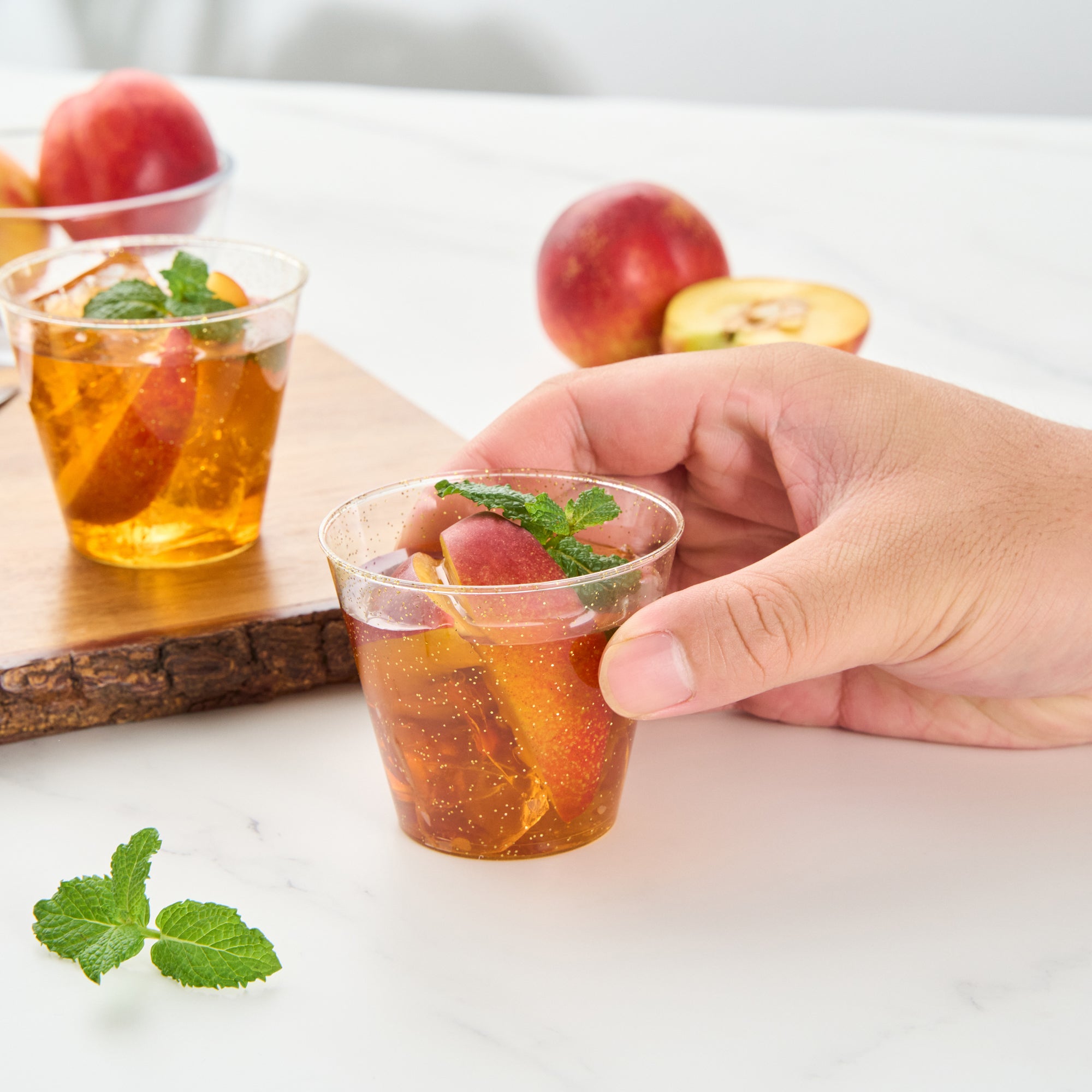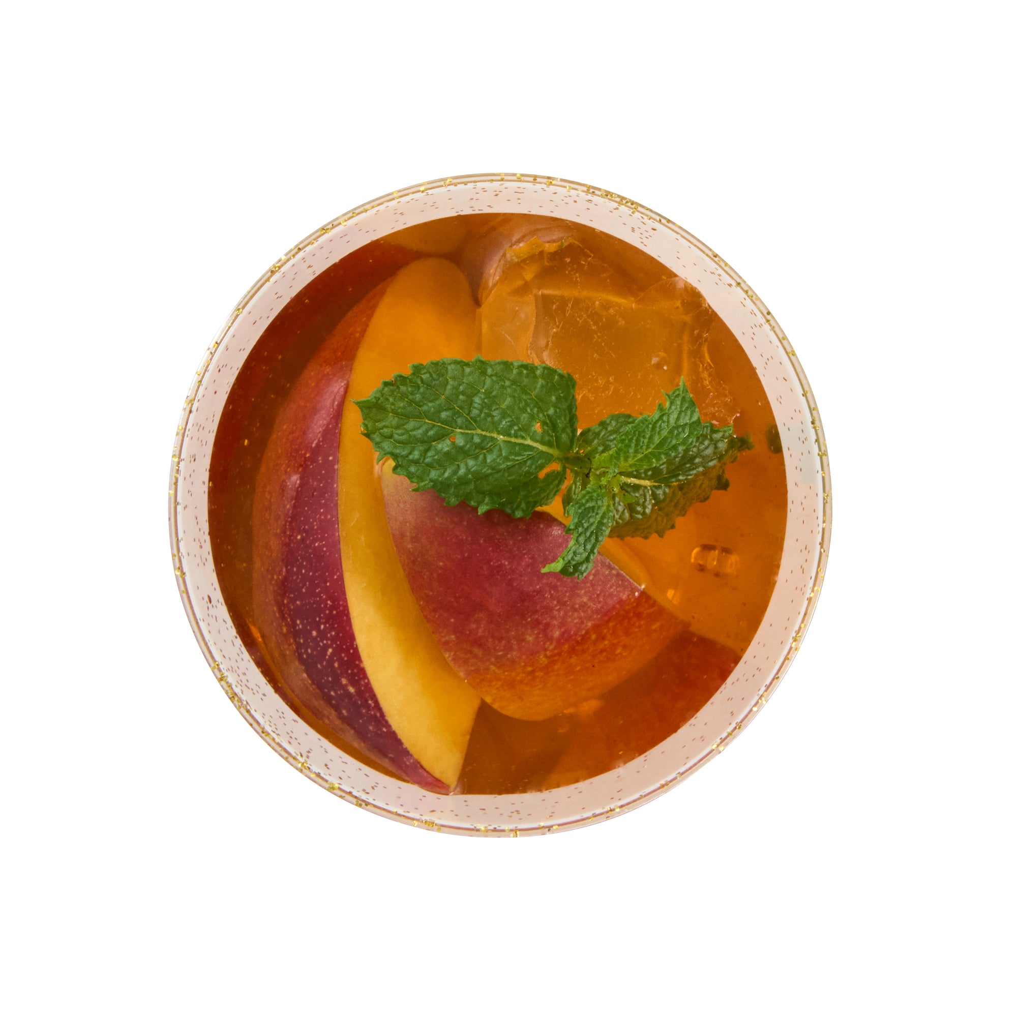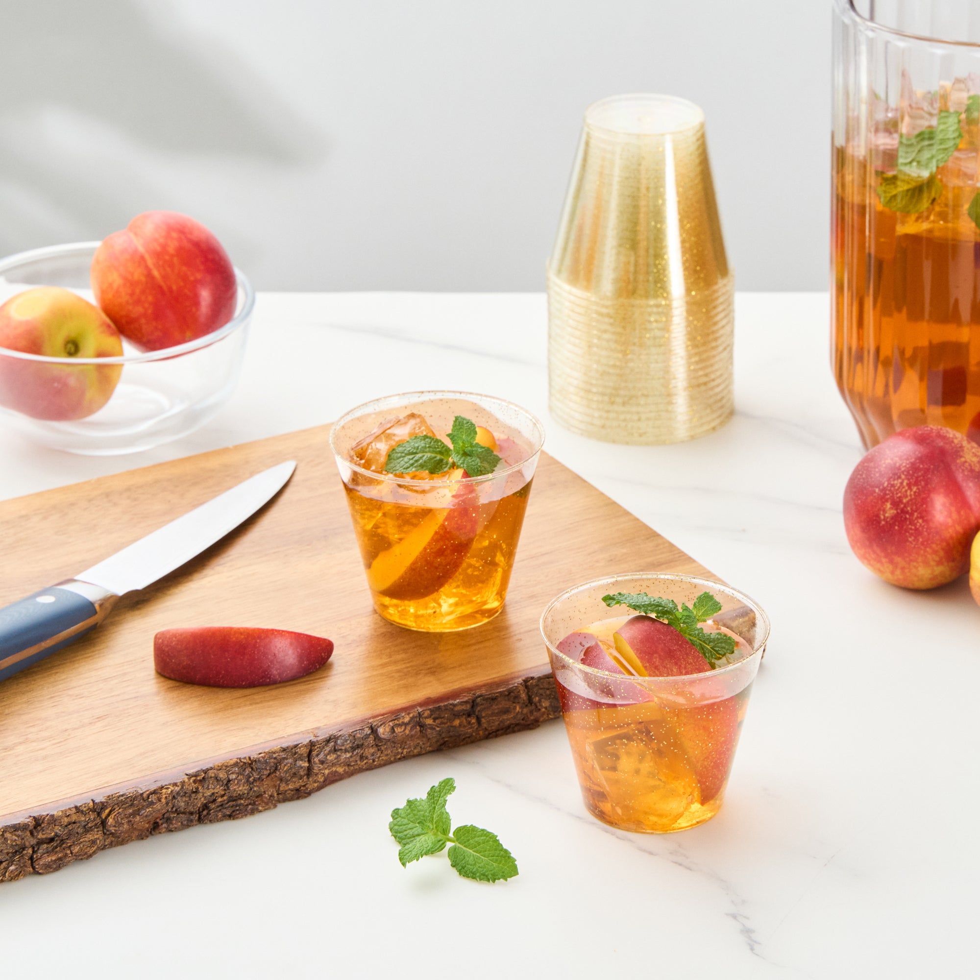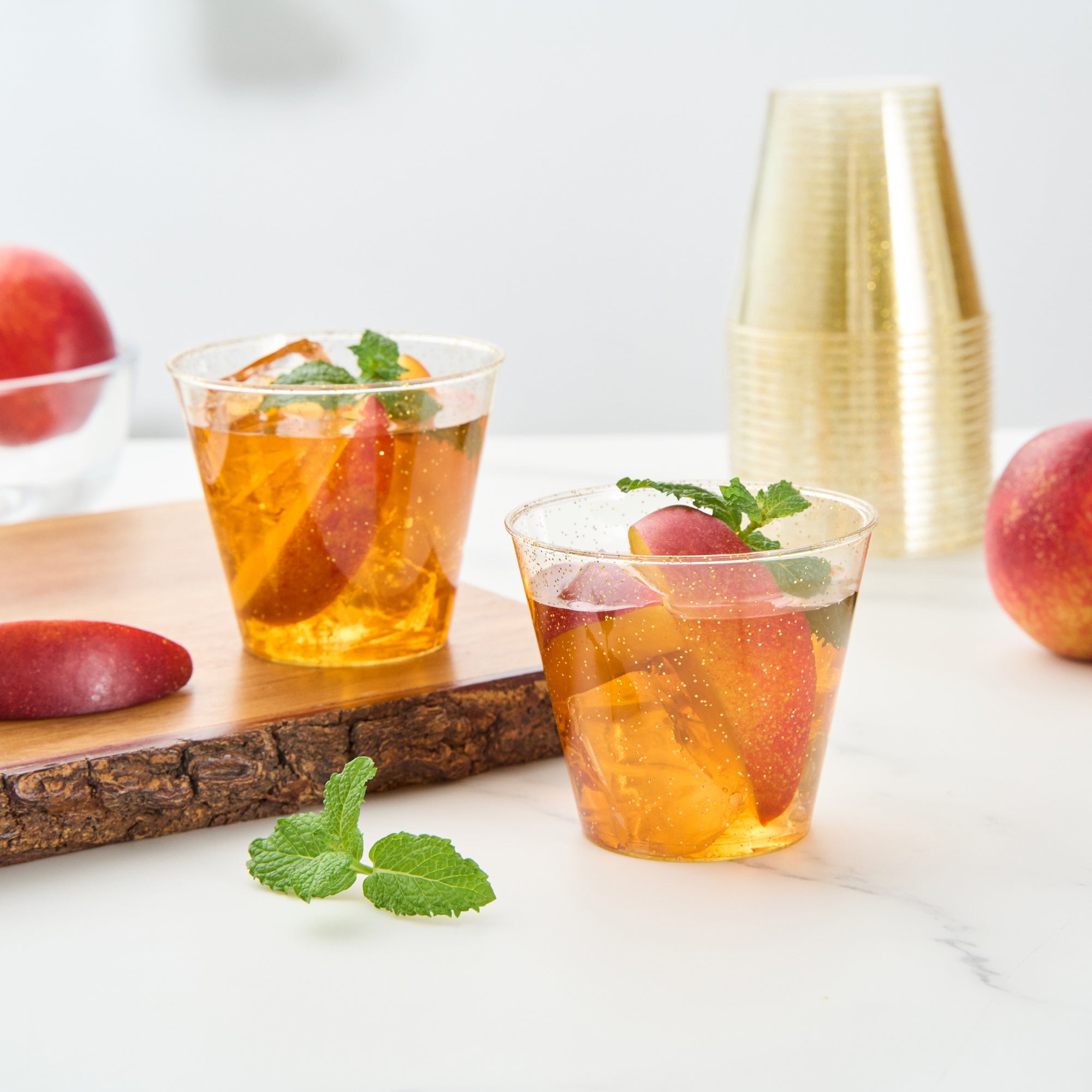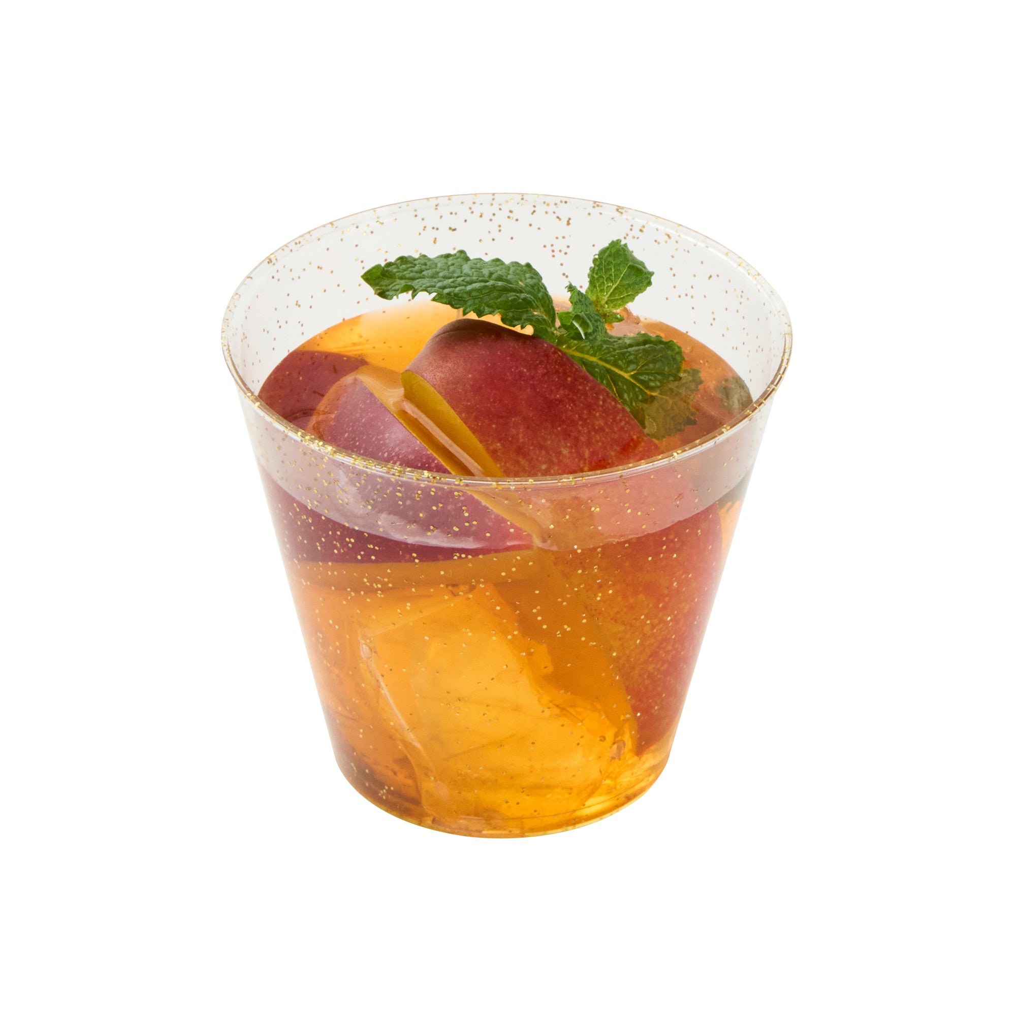Add sparkle to your events with our Chef 101 5-ounce Gold Glitter Plastic Tumblers. With these party cups, highlight the elegance of gold glitter to elevate the aesthetics of any table setting at festive occasions. Made of hard and durable PS plastic, these glitter plastic cups can be used at weddings, birthdays, and more. These plastic glasses are cold food-friendly and ideal for chill beverages. The recyclable nature of these cocktail cups ensures a quick and sustainable cleanup, allowing you to effortlessly maintain an eco-conscious environment. Turn every occasion into a chic affair with these dazzling glasses that are disposable, providing an easy cleanup solution. At 2.8 inches in diameter and 2.3 inches in height, these 5-ounce gold plastic tumblers offer a compact size. Sold in a 500 count box.