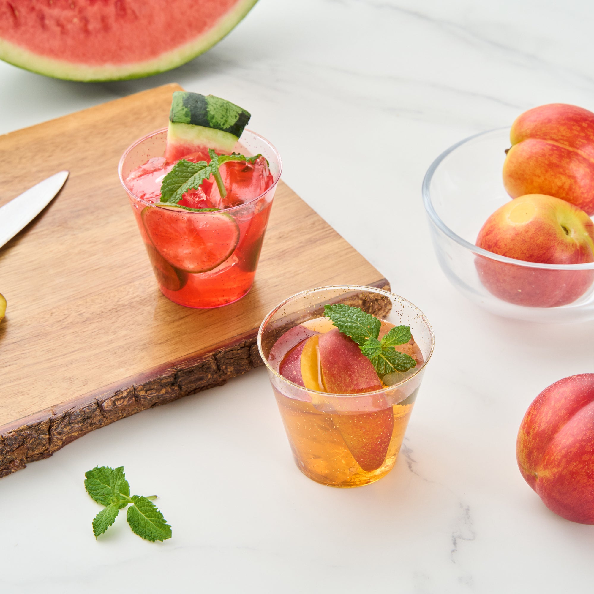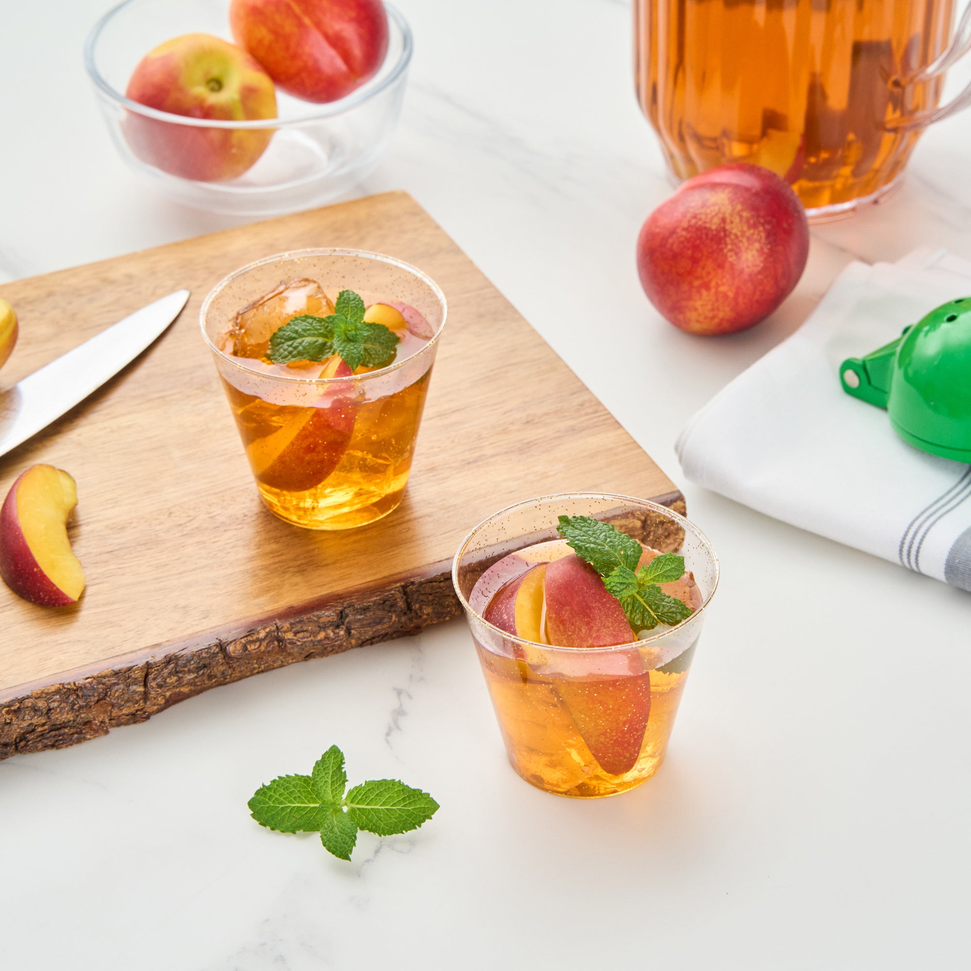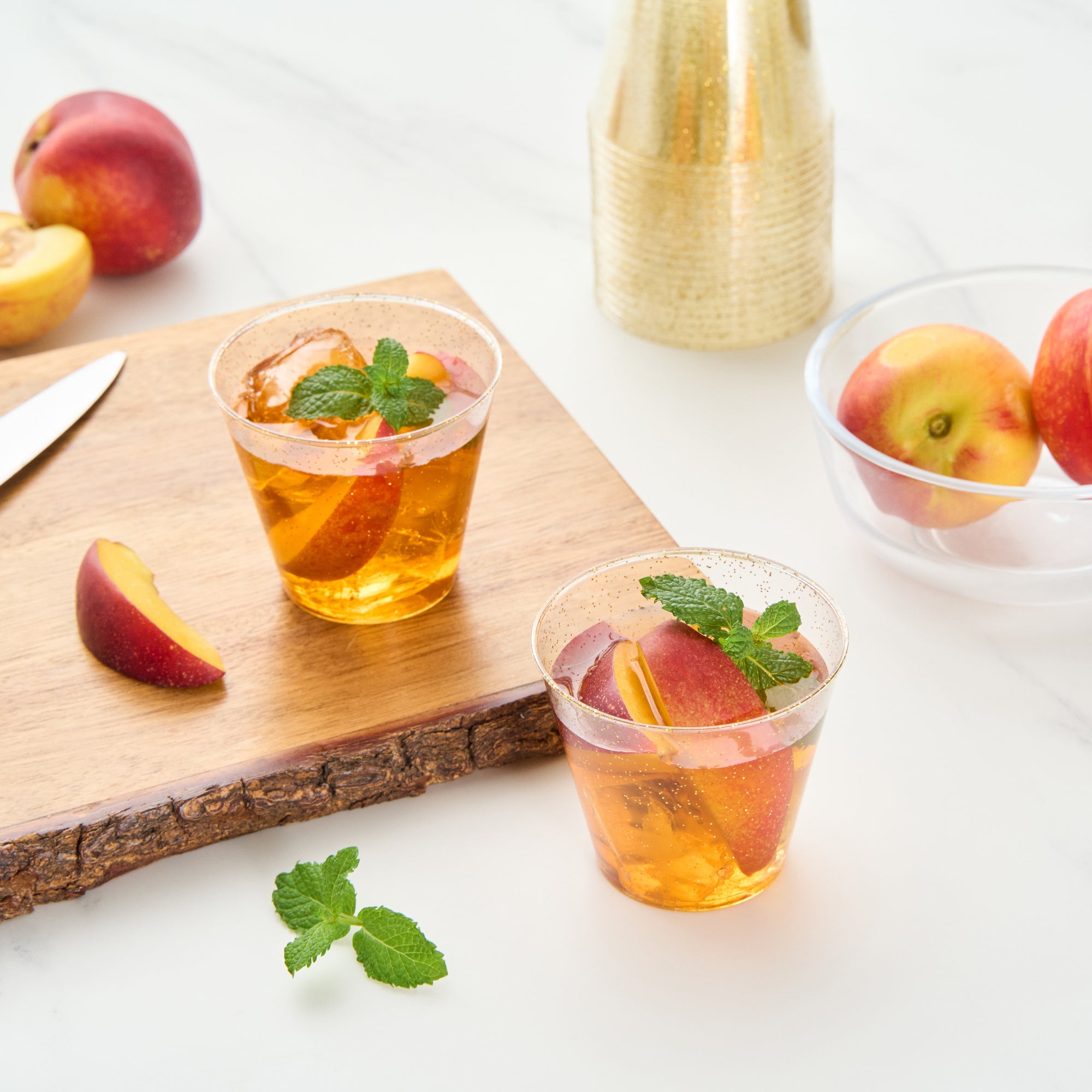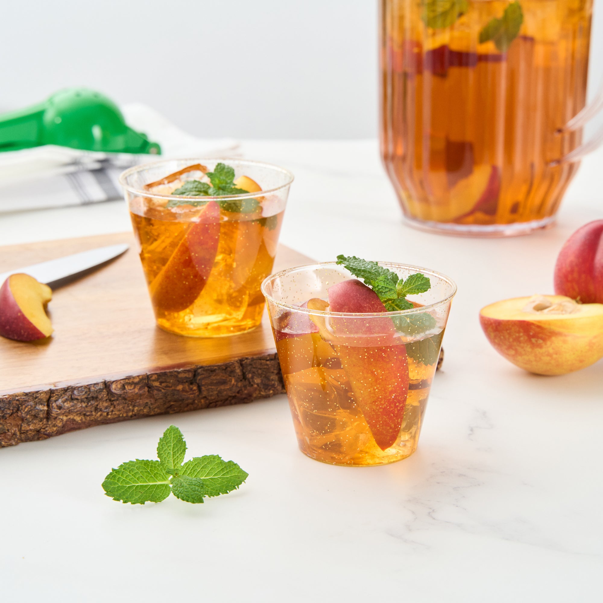 Add sparkle to your events with our Chef 101 5-ounce Gold Glitter Plastic Tumblers. With these party cups, highlight the elegance of gold glitter to elevate the aesthetics of any table setting at festive occasions. Made of hard and durable PS plastic, these glitter plastic cups can be used at weddings, birthdays, and more. These plastic glasses are cold food-friendly and ideal for chill beverages. The recyclable nature of these cocktail cups ensures a quick and sustainable cleanup, allowing you to effortlessly maintain an eco-conscious environment. Turn every occasion into a chic affair with these dazzling glasses that are disposable, providing an easy cleanup solution. At 2.8 inches in diameter and 2.3 inches in height, these 5-ounce gold plastic tumblers offer a compact size. Sold in a 500 count box.