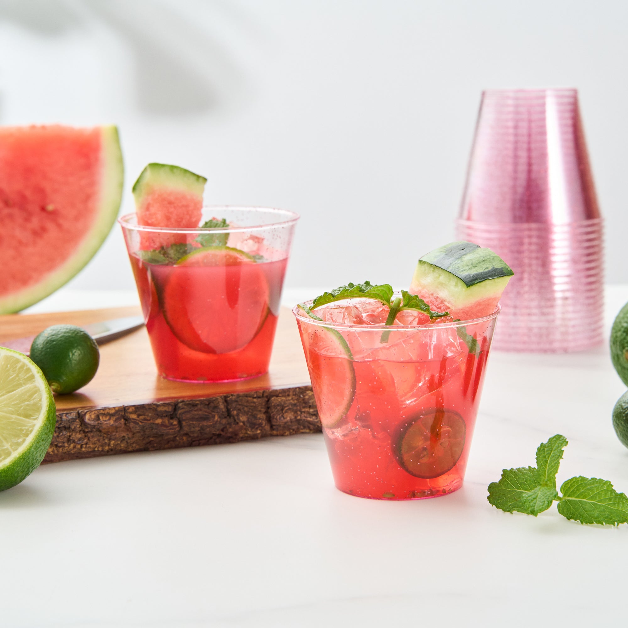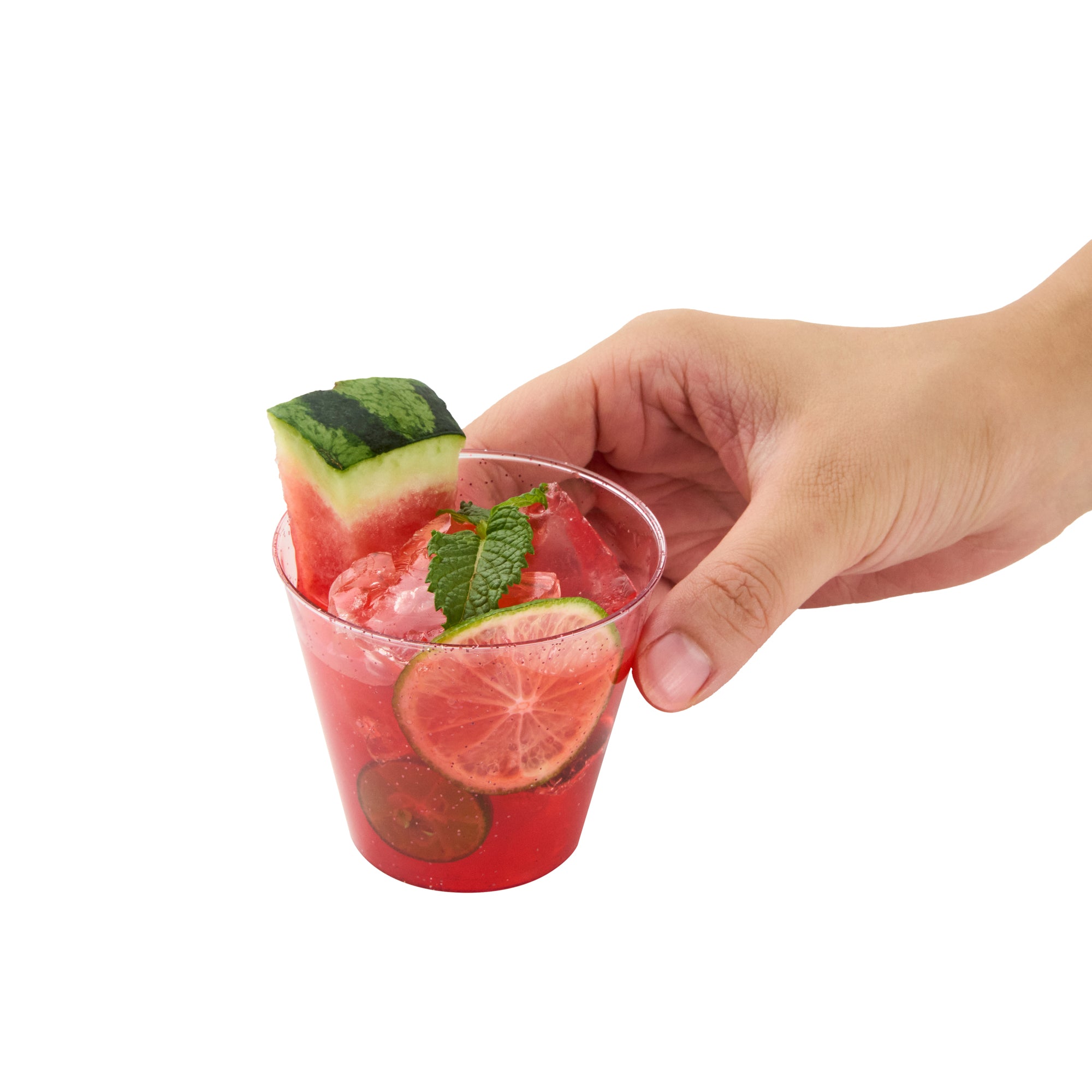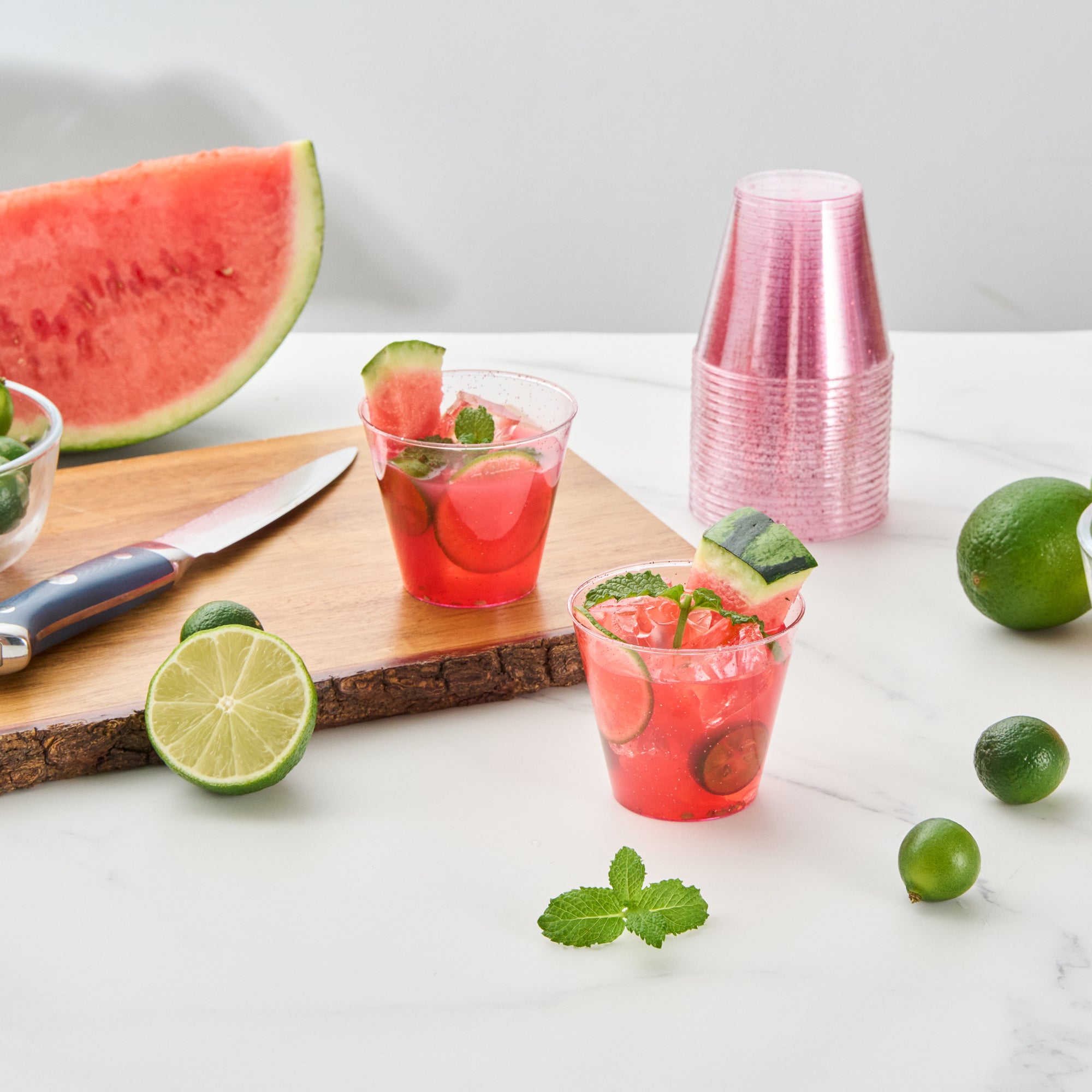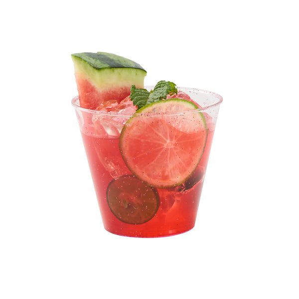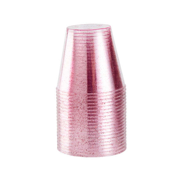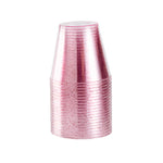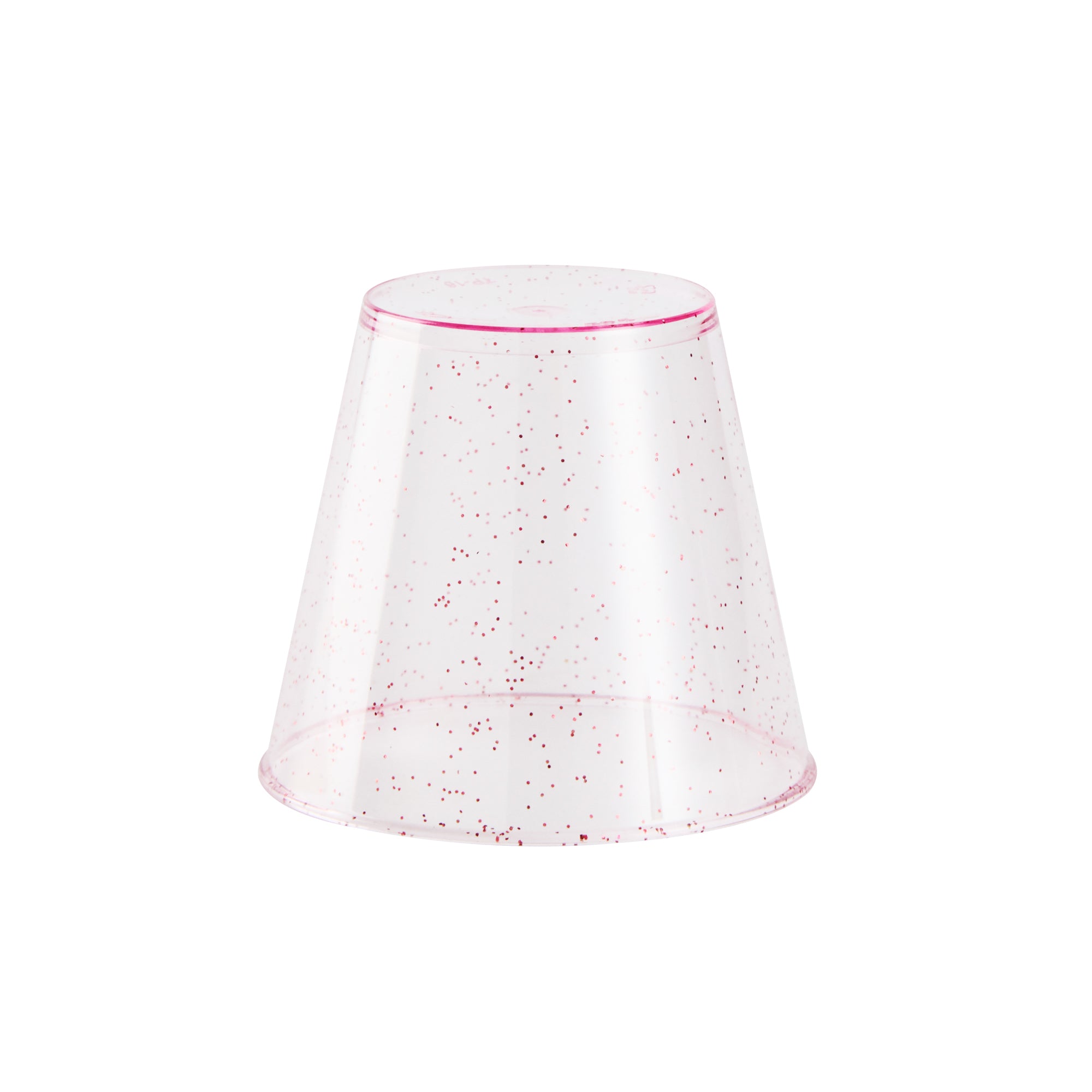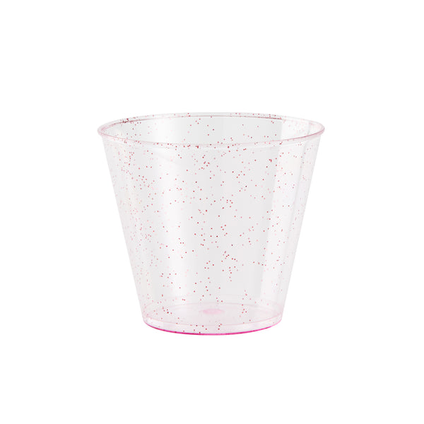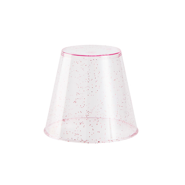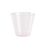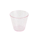 Enhance beverage service with these Chef 101 5-ounce Pink Glitter Plastic Tumblers. Featuring a chic pink hue infused with glitter, these party cups elevate any event's ambiance with dazzling presentations for festive drinks. Made from durable PS plastic, these cold food-friendly cups effortlessly serve iced beverages and chilled desserts. The compact size of these glitter finish cups ensures easy handling. These cocktail cups are also recyclable, supporting sustainable practices. The clear plastic design of these plastic cups allows the glitter to pair beautifully with any colored beverage, transforming simple occasions into visually appealing experiences. Make your next gathering memorable with these disposable plastic glasses, perfect for both professional and casual settings. Measuring 2.8 inches in diameter and 2.3 inches in height, these 5-ounce glitter disposable cups are perfect for portioned servings, making them ideal for weddings and parties. Sold in a 20 count box.