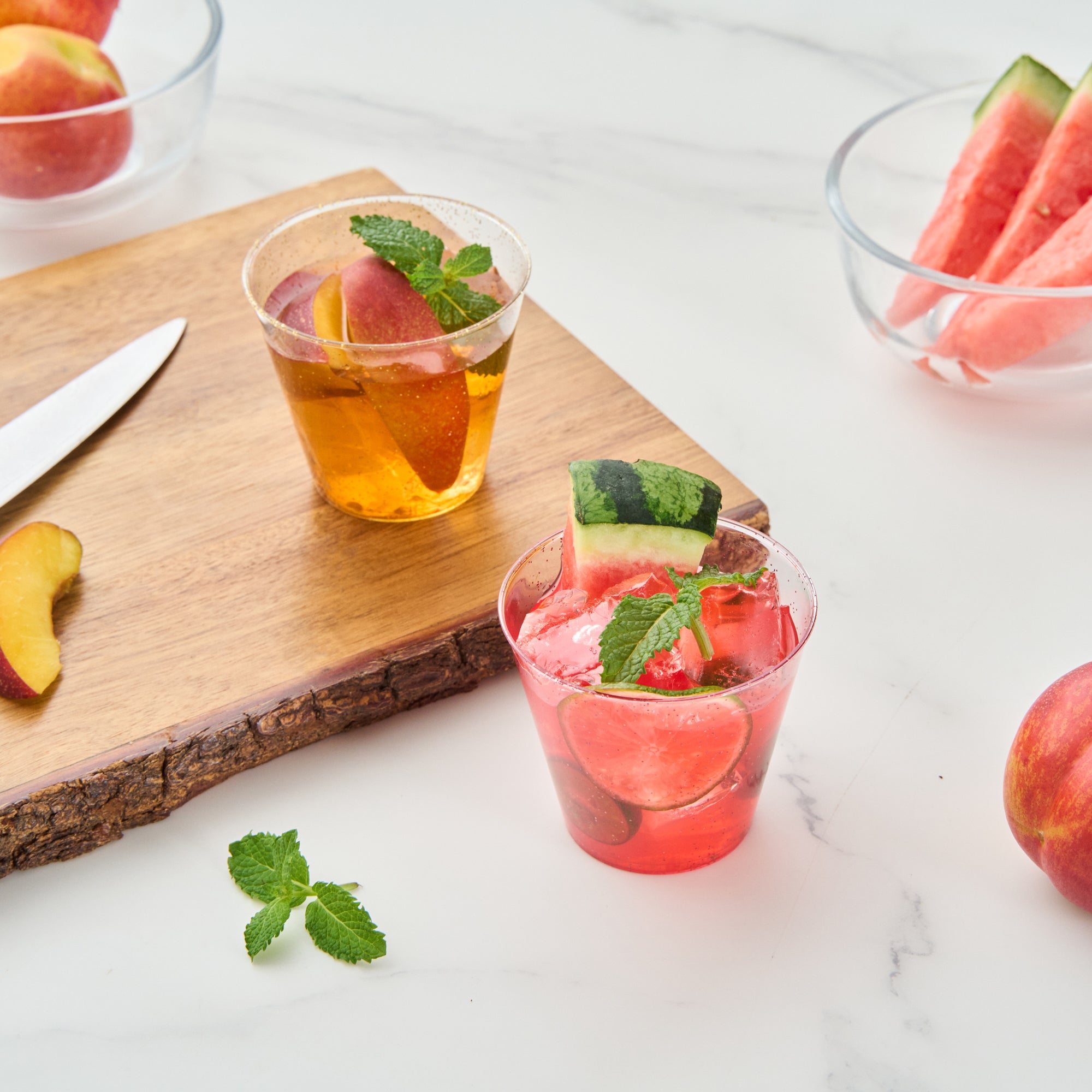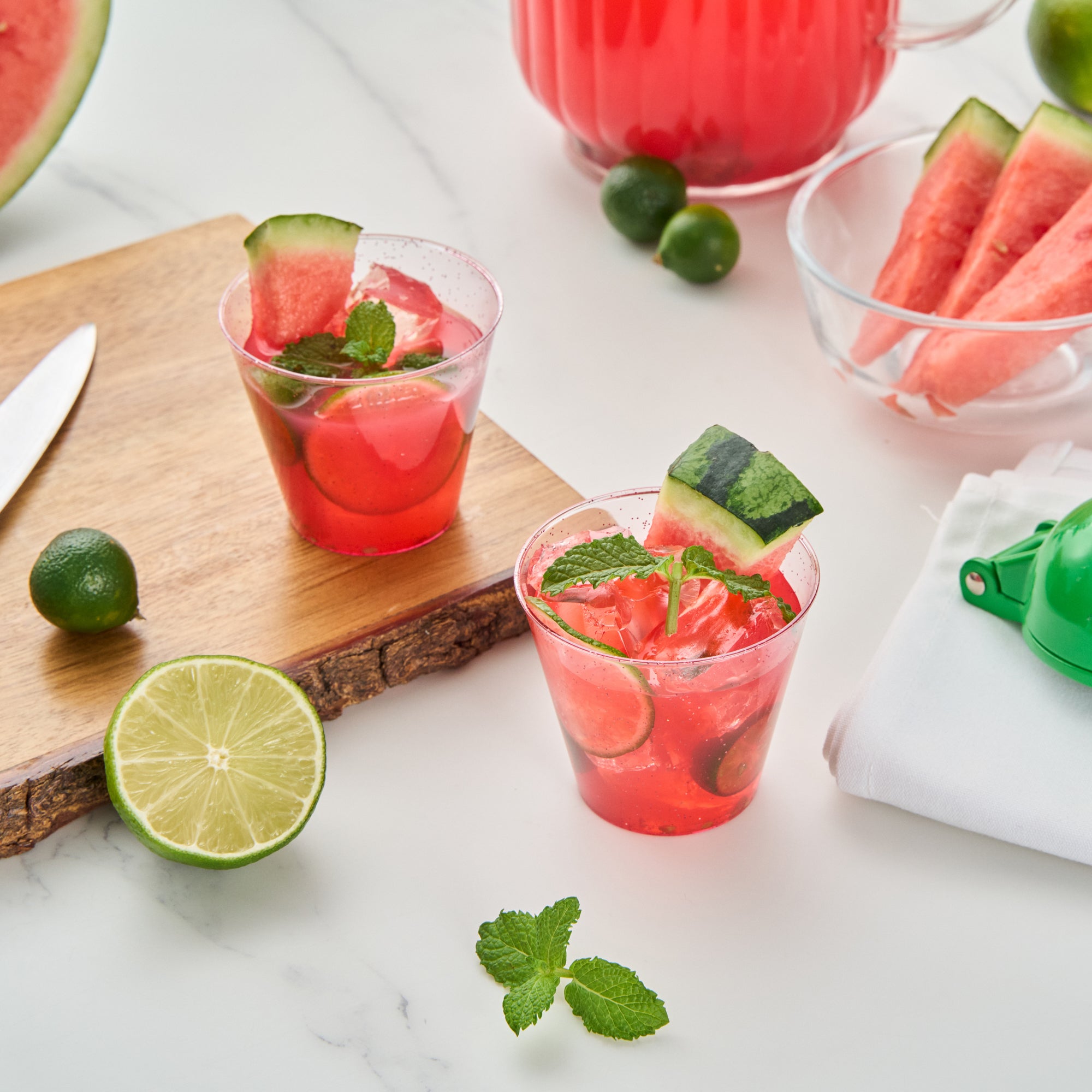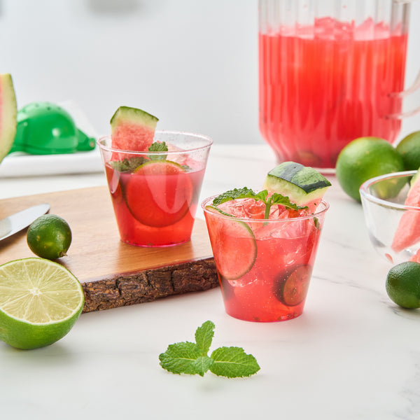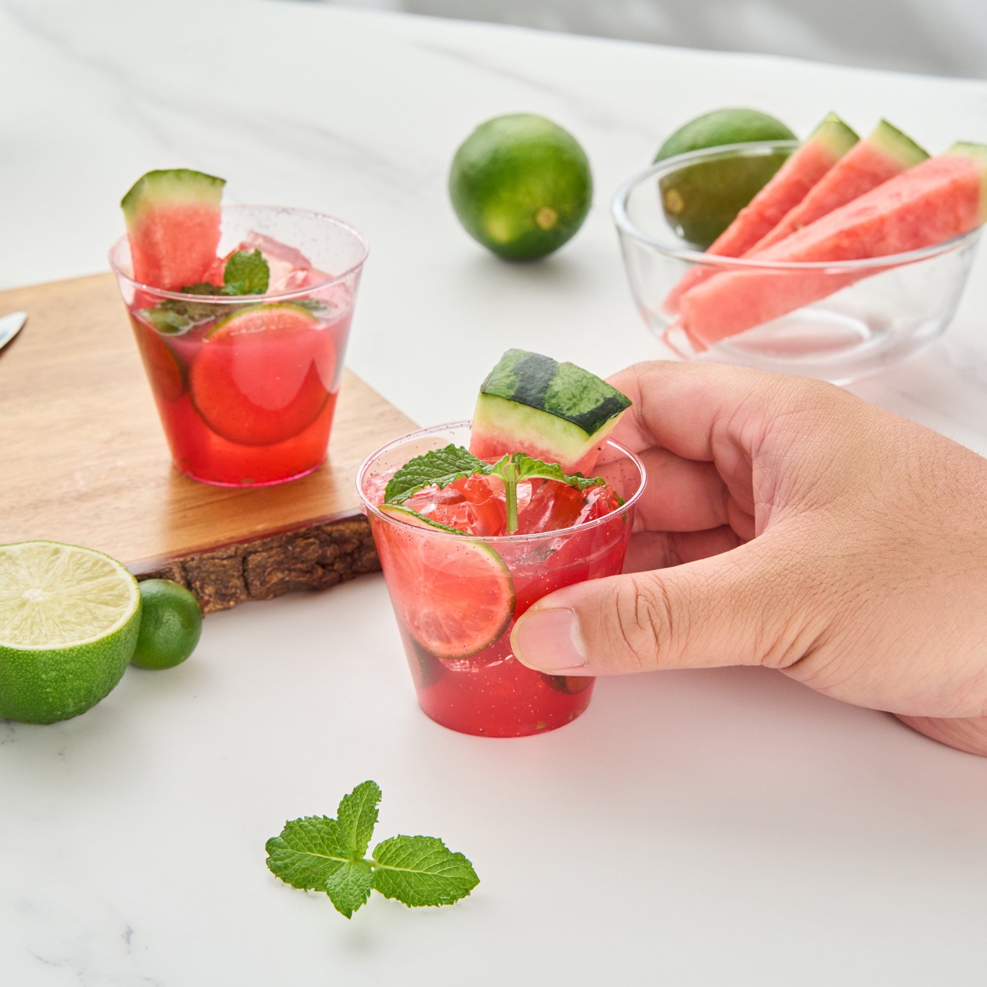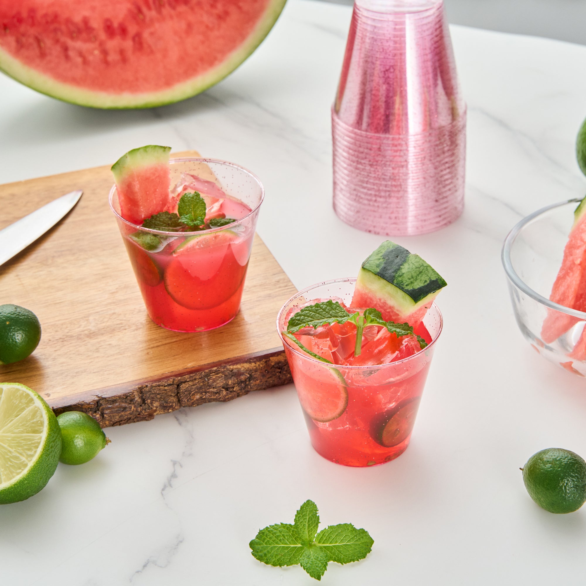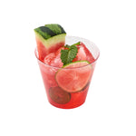 Enhance beverage service with these Chef 101 5-ounce Pink Glitter Plastic Tumblers. Featuring a chic pink hue infused with glitter, these party cups elevate any event's ambiance with dazzling presentations for festive drinks. Made from durable PS plastic, these cold food-friendly cups effortlessly serve iced beverages and chilled desserts. The compact size of these glitter finish cups ensures easy handling. These cocktail cups are also recyclable, supporting sustainable practices. The clear plastic design of these plastic cups allows the glitter to pair beautifully with any colored beverage, transforming simple occasions into visually appealing experiences. Make your next gathering memorable with these disposable plastic glasses, perfect for both professional and casual settings. Measuring 2.8 inches in diameter and 2.3 inches in height, these 5-ounce glitter disposable cups are perfect for portioned servings, making them ideal for weddings and parties. Sold in a 20 count box.