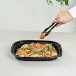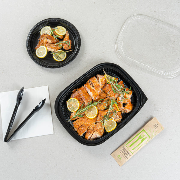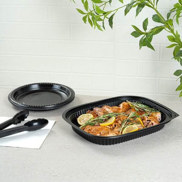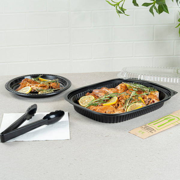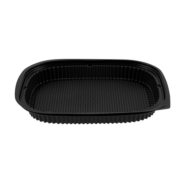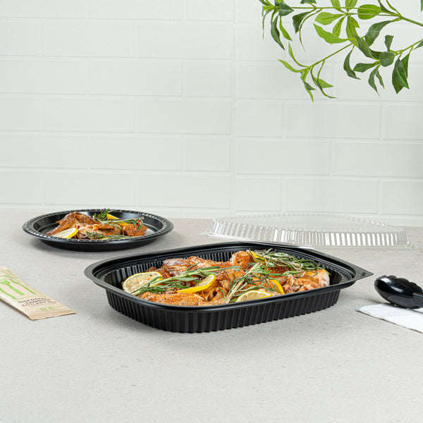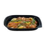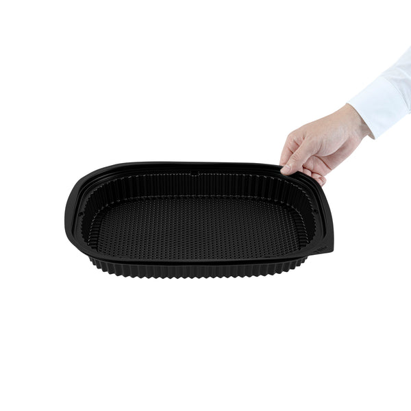 Elevate your foodservice with our Chef 101 59 oz Rectangle Black Plastic Food Containers. These microwavable food containers are perfect for reheating meals quickly and conveniently. Made from durable plastic, these heavy-duty takeaway containers are ideal for storing both hot and cold food items. With a stackable design, these to go boxes help save valuable space in your kitchen or storage area. Pair these containers with their coordinating lid (SKU: RWP1702C) for a complete and secure takeaway solution. Holding up to 59 ounces, these disposable food containers measure 13.4 inches in length by 9.5 inches in width by 1.6 inches in height. Sold in a 20 count box.