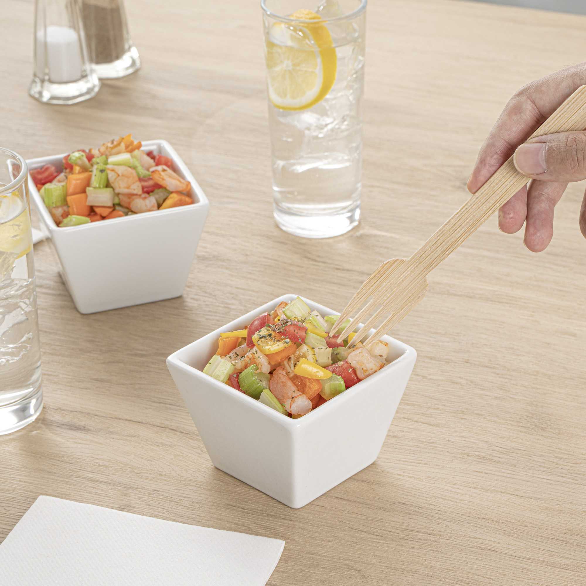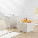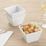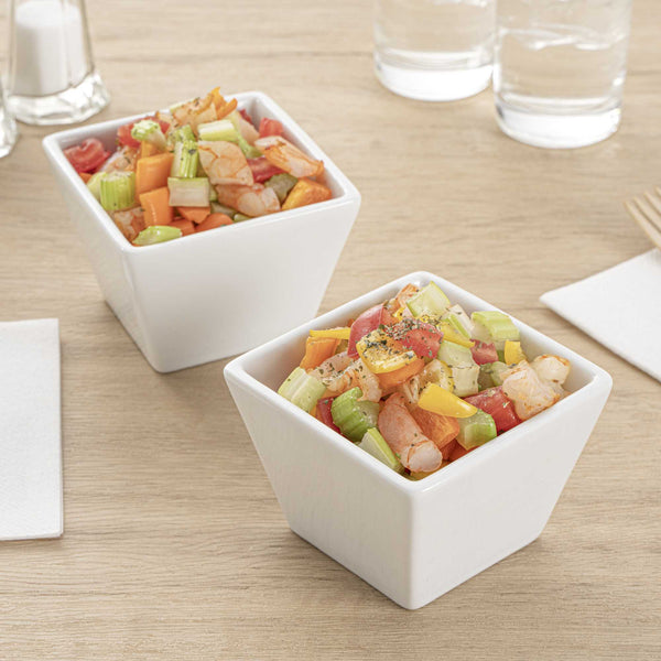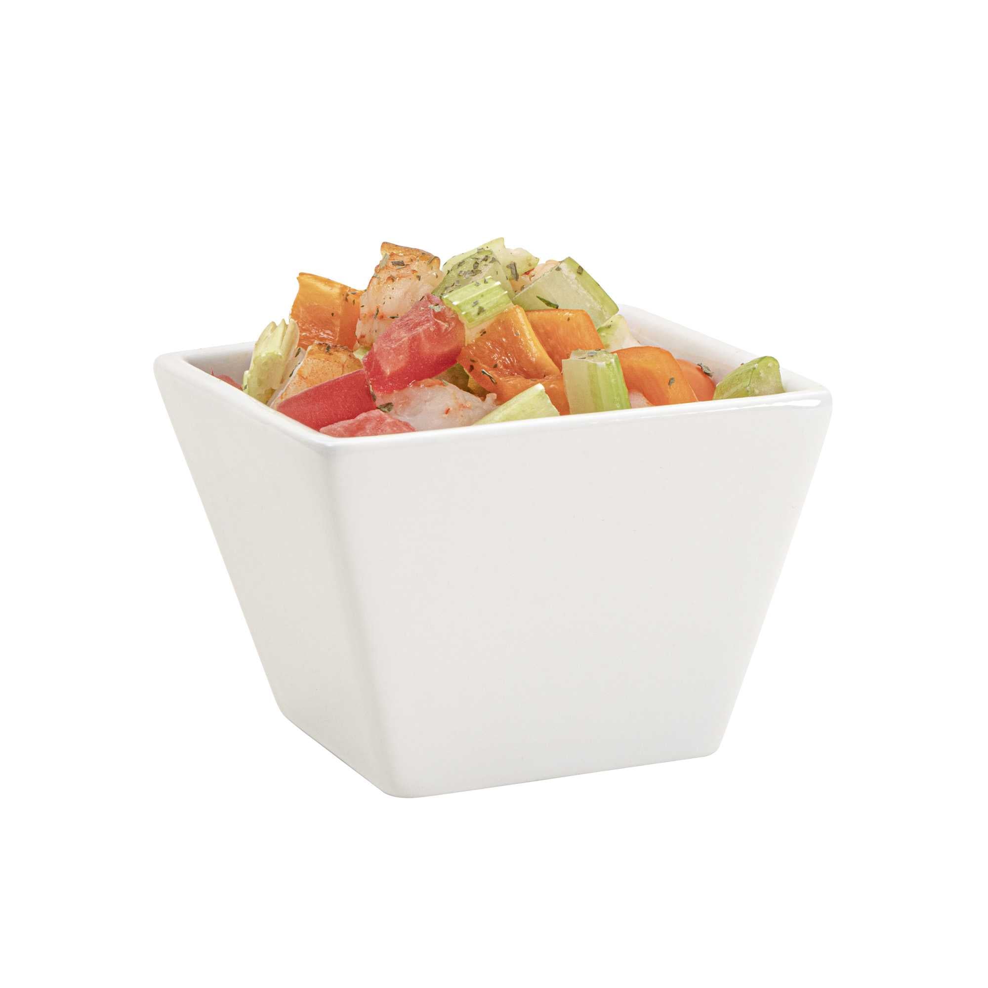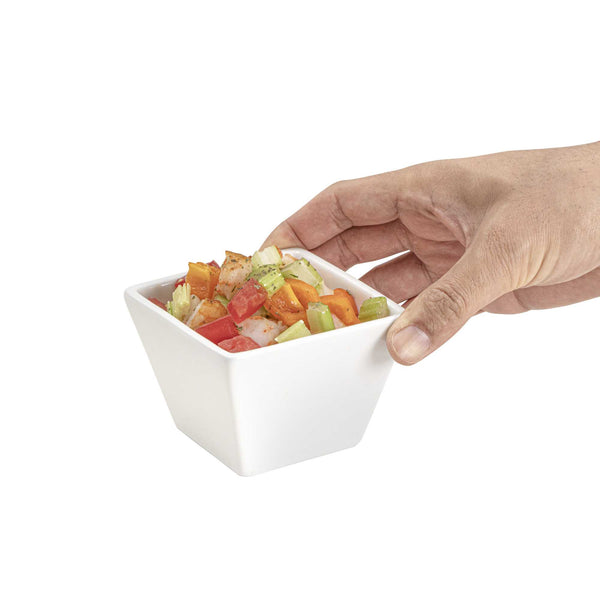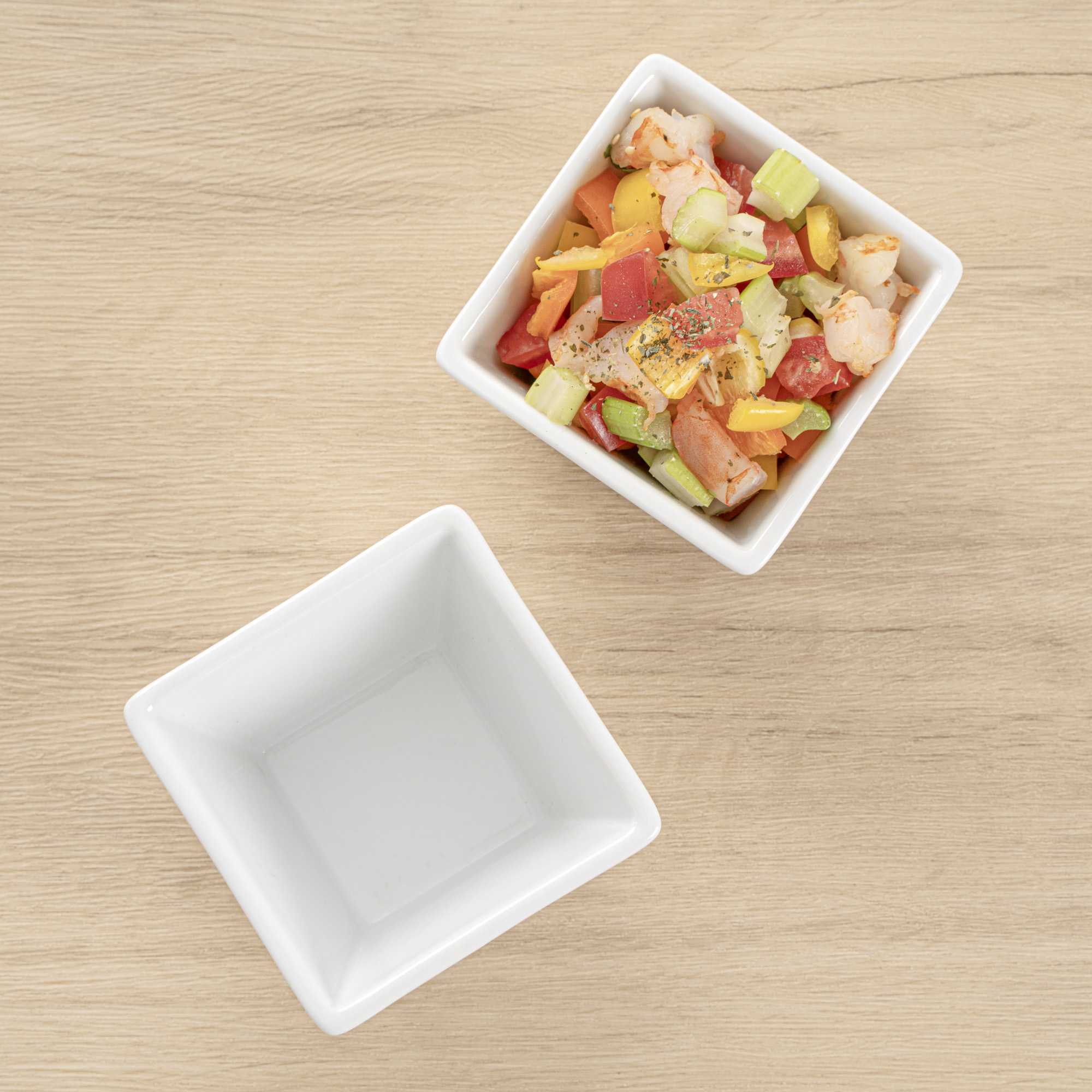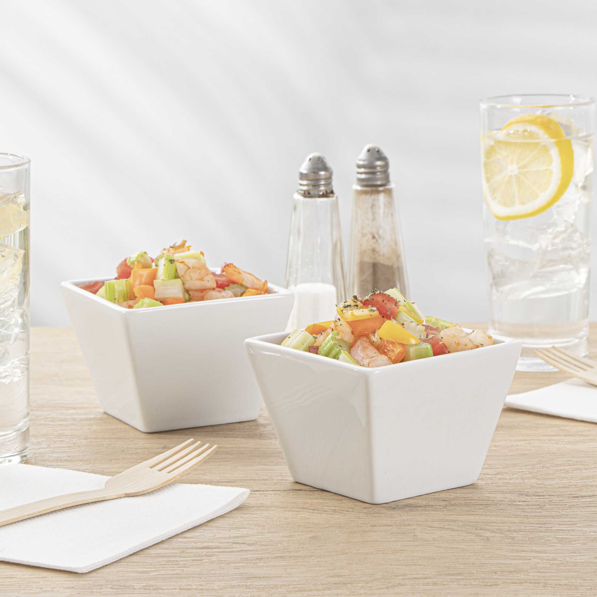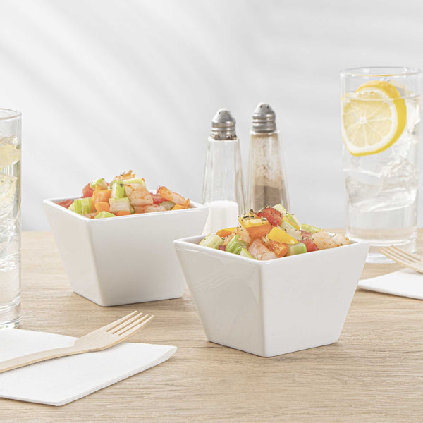 Add a touch of elegance to samplers with our Chef 101 6-ounce Square White Porcelain Kova Bowls. Crafted from premium porcelain, these porcelain bowls are chip-resistant and scratch-resistant to endure constant use and maintain their high-quality look. These serving bowls are microwave-safe and oven-safe to conveniently prepare and serve all types of warm treats. With a sophisticated white finish, these stylish square bowls effortlessly enhance your dessert presentation and complement the decor at any establishment. Measuring 3.5 inches in length by 2.5 inches in height, these white porcelain bowls have a durable structure that is built to withstand commercial dishwasher use. These square porcelain dishes can contain up to 6 ounces and are sold in a 10 count box.