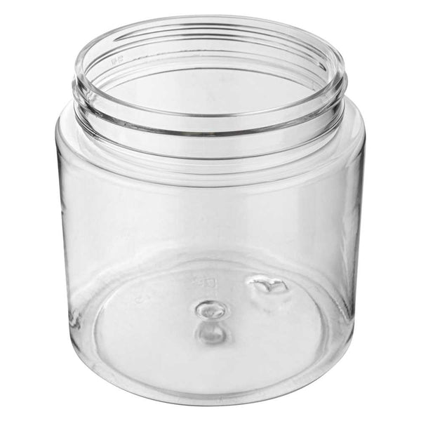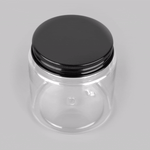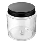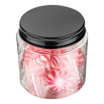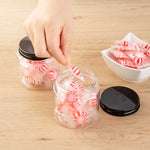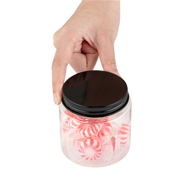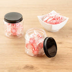 8 OZ ROUND CLEAR PLASTIC CANDY AND SNACK JAR - WITH BLACK ALUMINUM LID
