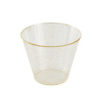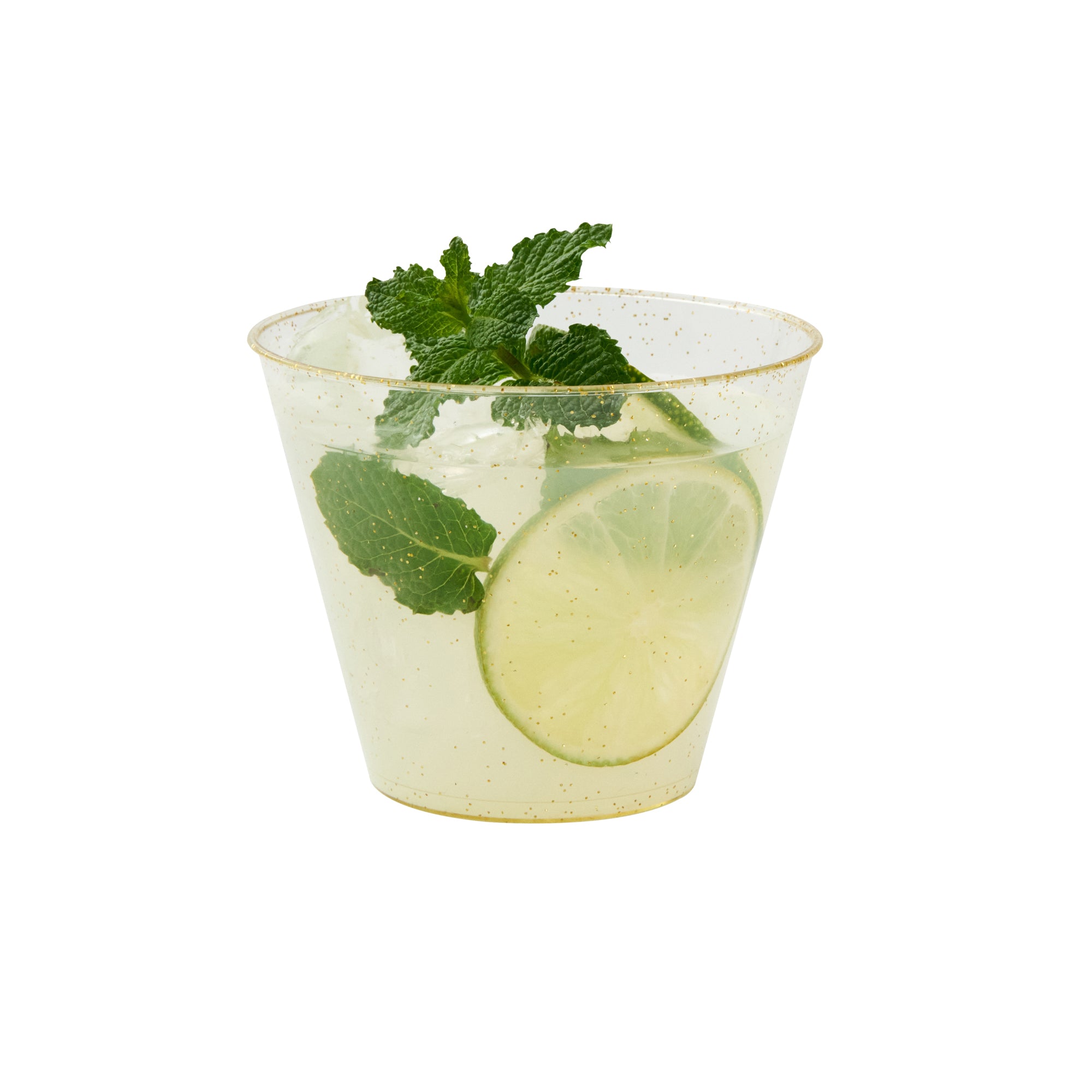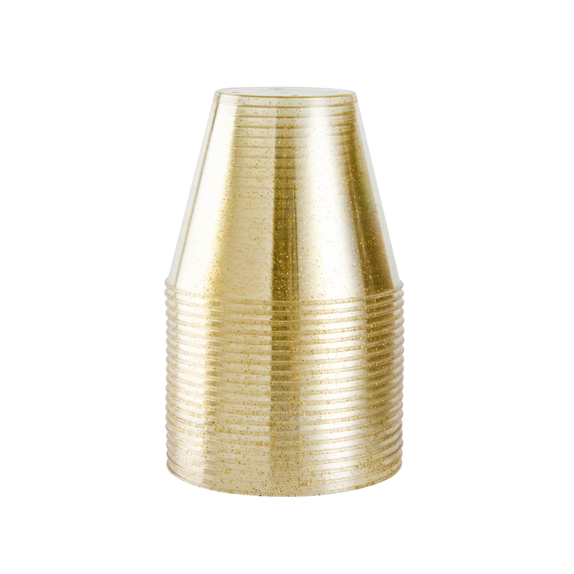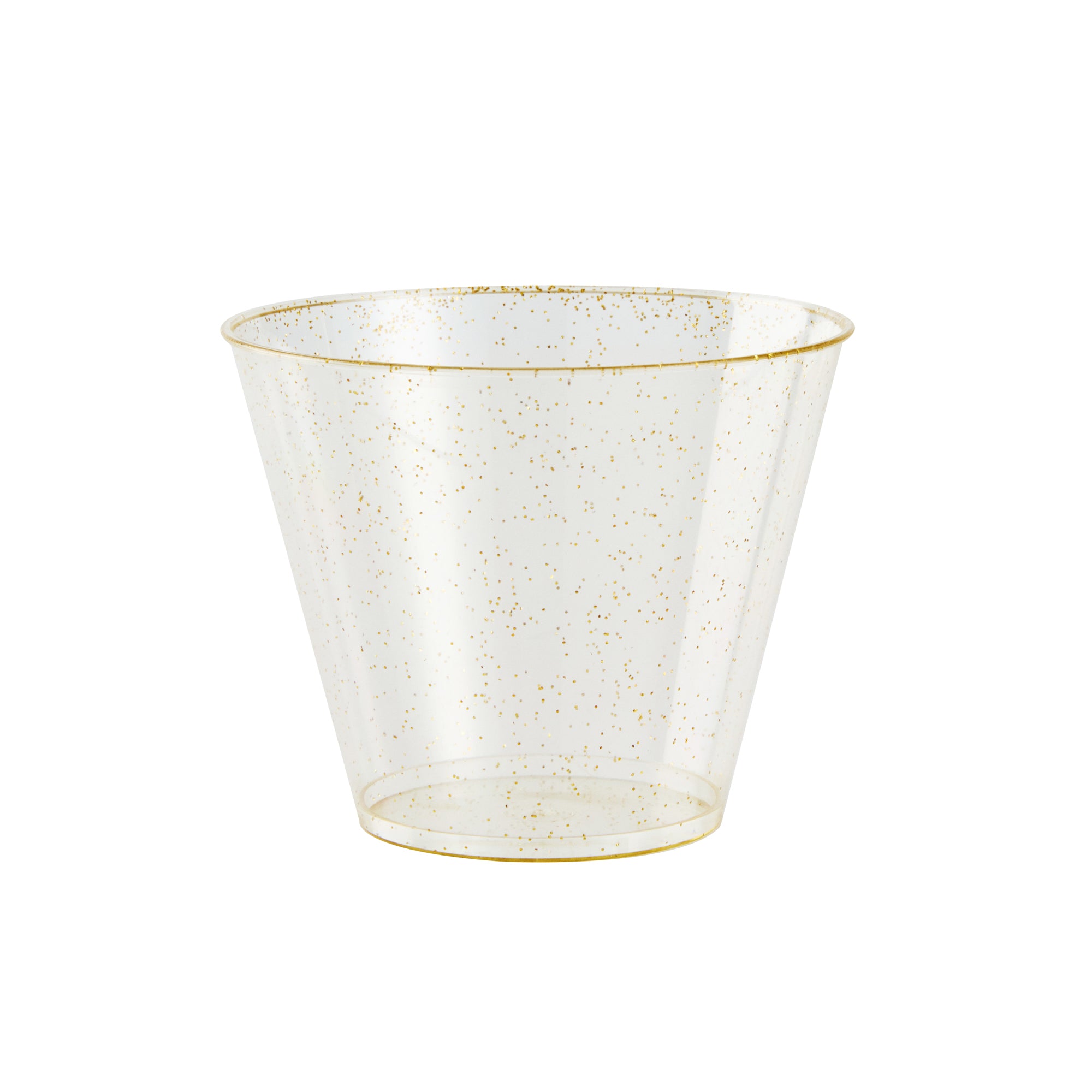 Enhance your event presentation with these Chef 101 9-ounce Gold Glitter Plastic Tumblers. Made from hard and durable PS plastic, these glitter glasses are perfect for weddings, birthdays, or corporate gatherings. With a dazzling glitter design, these cups add a festive appeal, elevating the aesthetic of your event. Featuring a 9 ounce capacity, these gold plastic glasses are ideal for sampling cocktails and ensuring guests enjoy the perfect serve. Cold-food-friendly, these glitter disposable cups effortlessly handle diverse culinary needs while staying pristine in appearance. The recyclable nature of these cocktail cups provides eco-conscious event cleanup benefits, aligning with sustainable practices. Measuring 3.5 inches in diameter and 2.8 inches in height, these 9-ounce functional and stylish beverage solutions are compact and convenient for any bar setup. Sold in a 500 count box.