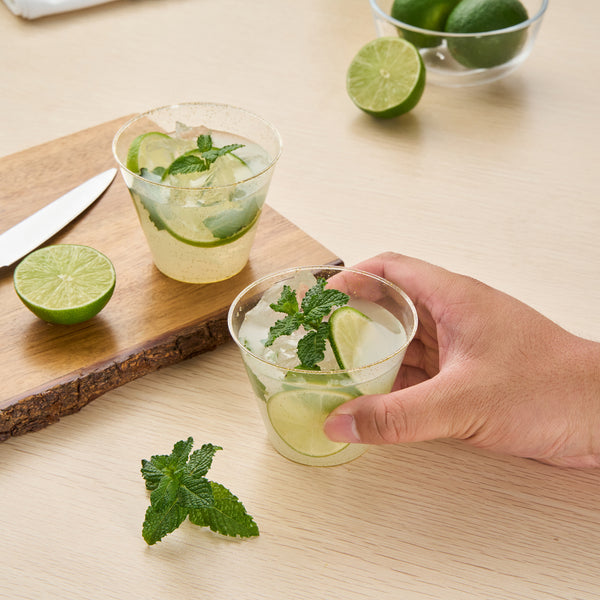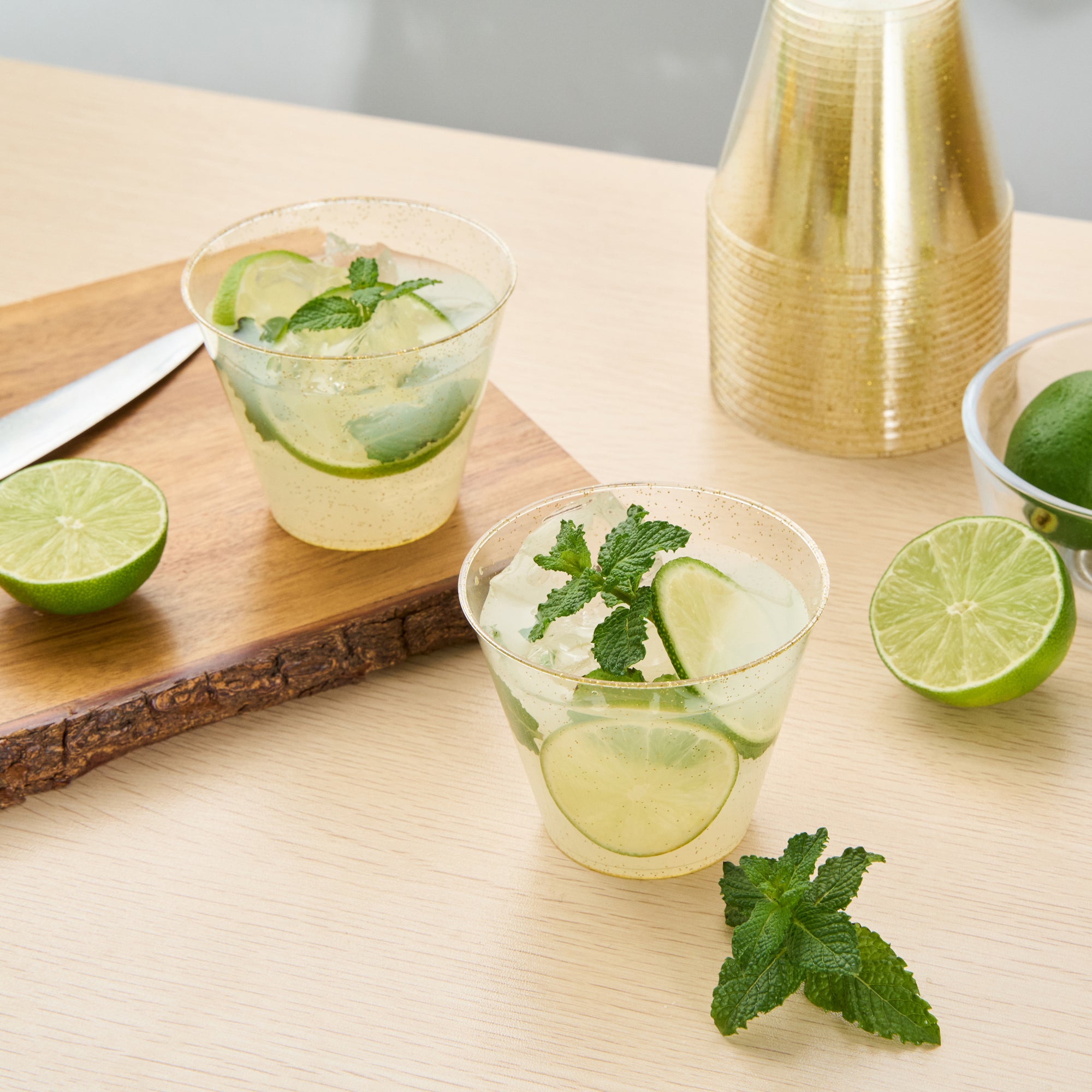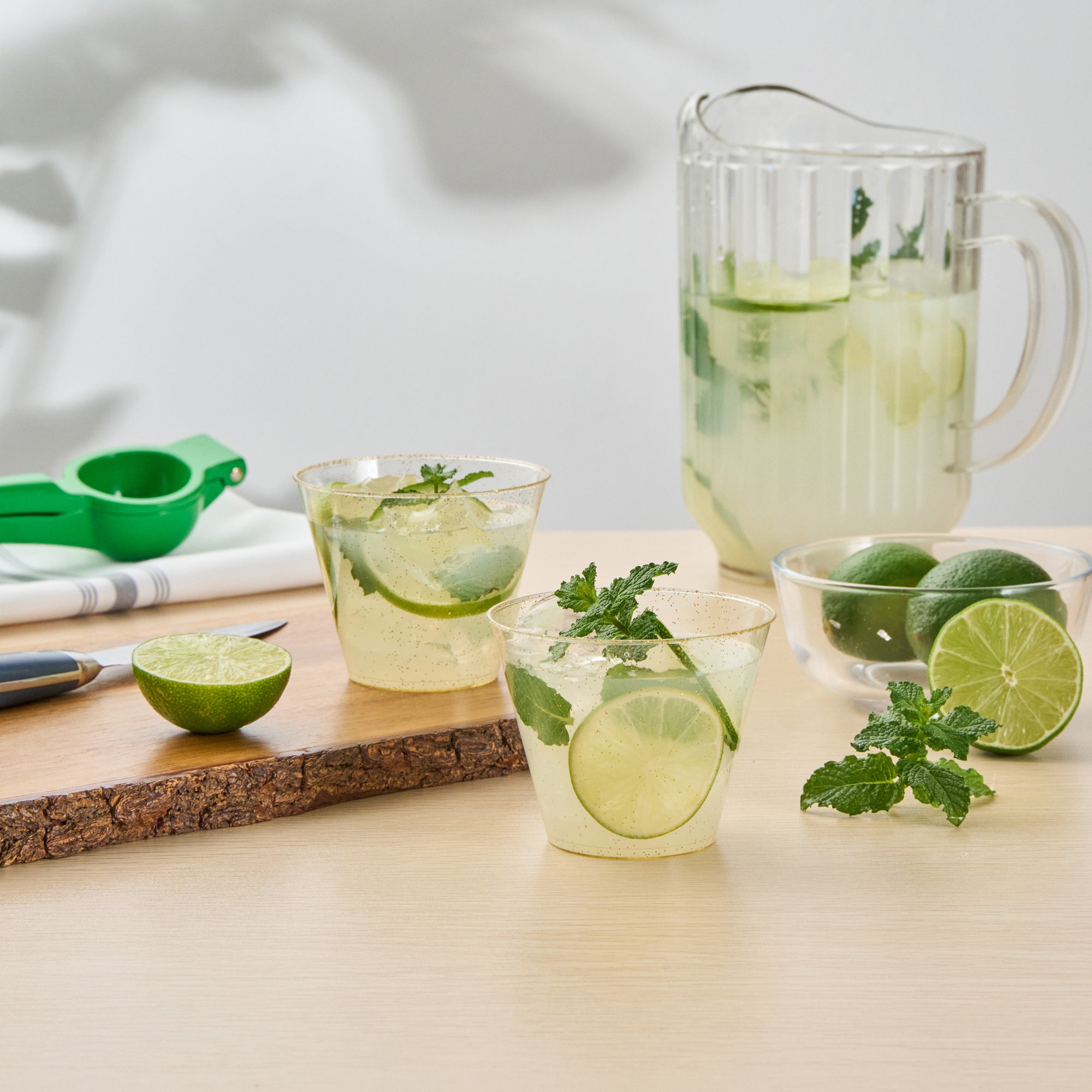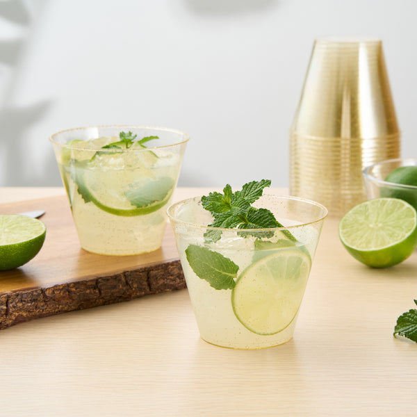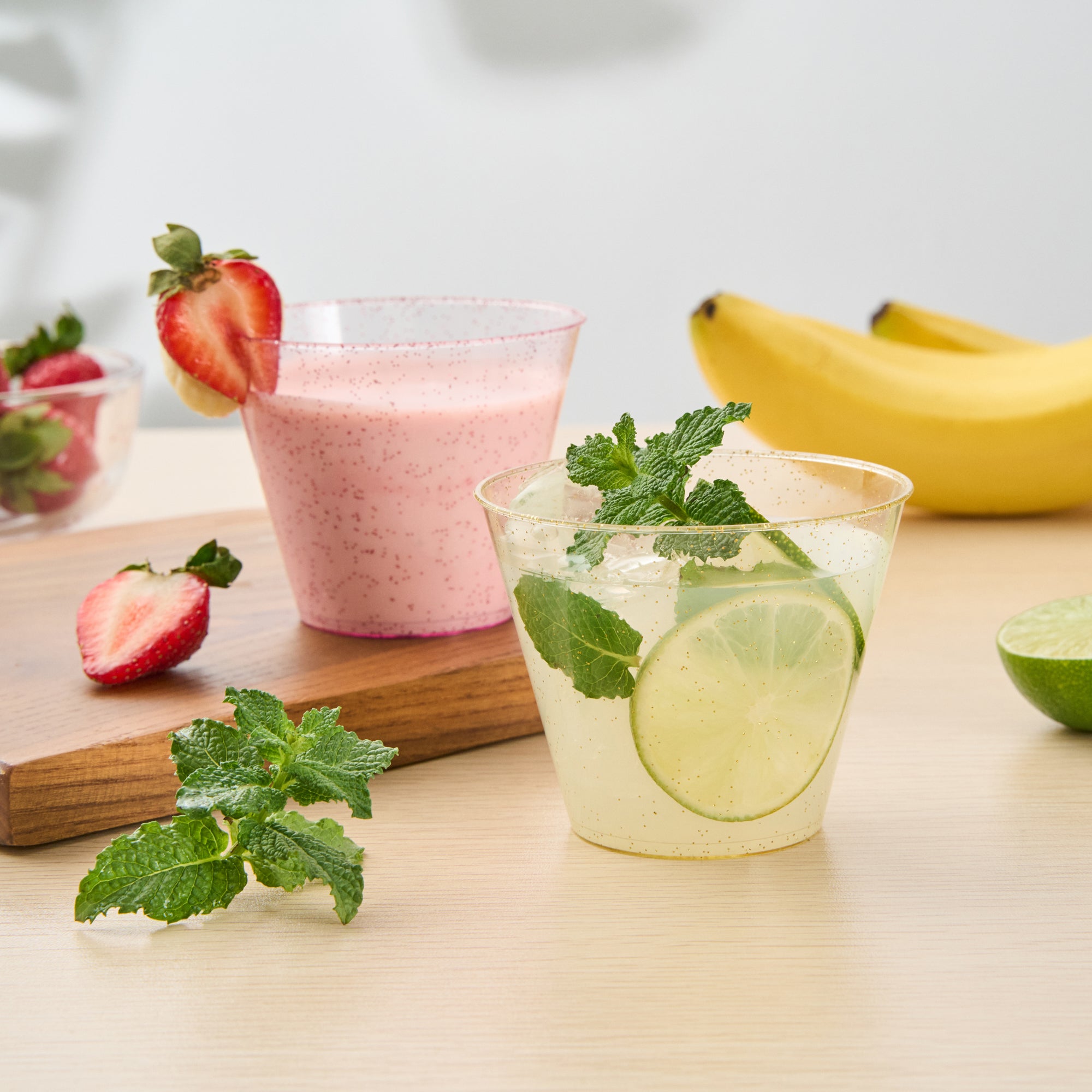 Enhance your event presentation with these Chef 101 9-ounce Gold Glitter Plastic Tumblers. Made from hard and durable PS plastic, these glitter glasses are perfect for weddings, birthdays, or corporate gatherings. With a dazzling glitter design, these cups add a festive appeal, elevating the aesthetic of your event. Featuring a 9 ounce capacity, these gold plastic glasses are ideal for sampling cocktails and ensuring guests enjoy the perfect serve. Cold-food-friendly, these glitter disposable cups effortlessly handle diverse culinary needs while staying pristine in appearance. The recyclable nature of these cocktail cups provides eco-conscious event cleanup benefits, aligning with sustainable practices. Measuring 3.5 inches in diameter and 2.8 inches in height, these 9-ounce functional and stylish beverage solutions are compact and convenient for any bar setup. Sold in a 500 count box.