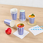 Enhance your beverage service with leak-resistant functionality. Chef 101 Leak-Resistant Disposable Cold Drink Cups feature a double poly-coated paper construction, ensuring a sturdy experience for your cold beverages. These cold beverage cups are designed with a tightly rolled lip, preventing spills and messes, making them ideal for busy cafes and quick-service restaurants. Showcasing an attractive blue houndstooth design, these cups elevate the presentation of your drinks while the 9-ounce capacity is perfect for serving standard portions, reducing waste and cost. At 3 inches in diameter and 3.75 inches in height, these cups are stackable, saving valuable storage space. Simplify your cleanup with their disposable design, perfect for catering events and food trucks. Each order includes 25 Chef 101 Leak-Resistant Disposable Cold Drink Cups.