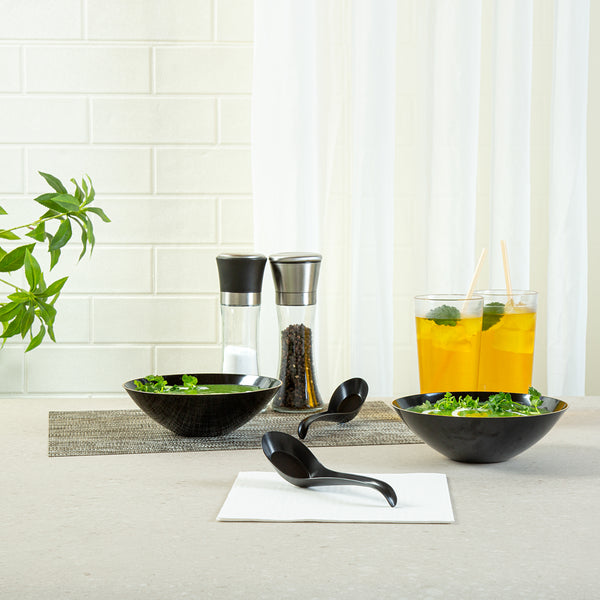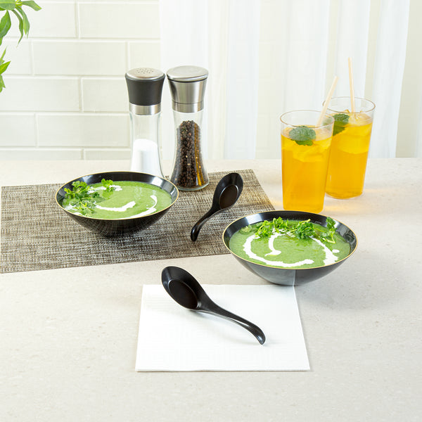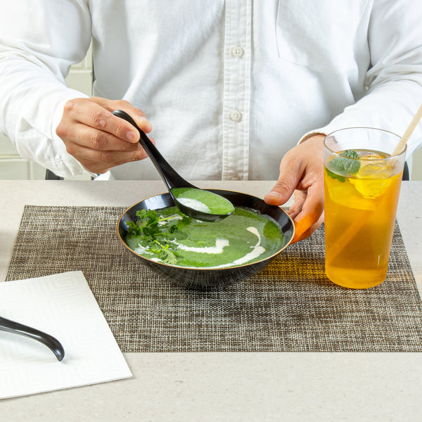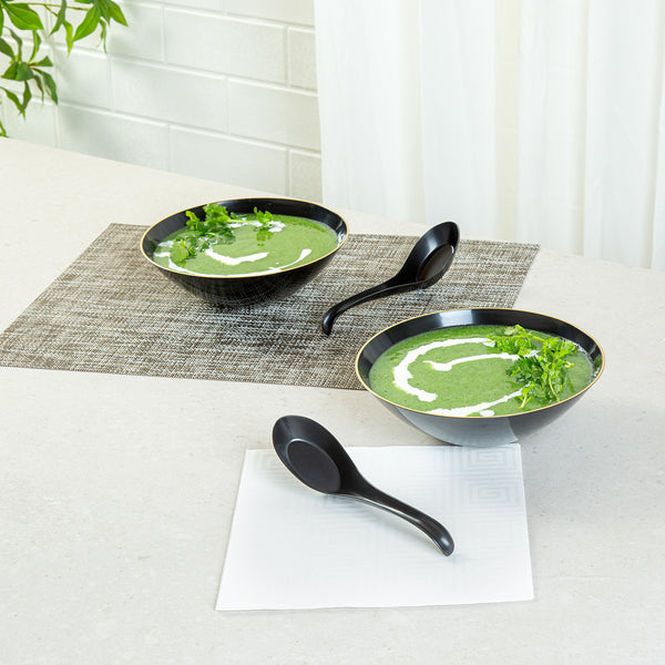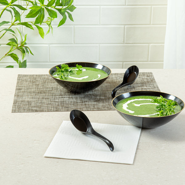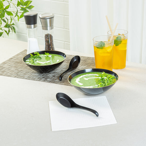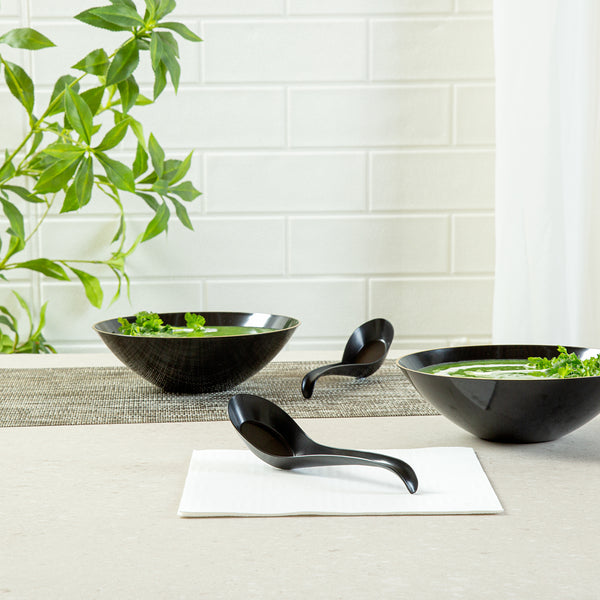 Enhance your dining experience with our Chef 101 Black Plastic Asian Soup Spoons. Crafted from premium plastic, these black spoons are durable and perfect for any foodservice setting. The reinforced handles of these Asian spoons provide extra strength, ensuring they can handle hefty bites of your favorite dishes. With a heat resistance of up to 200F, these plastic spoons are ideal for serving hot piping soups and meals. The sleek black finish of these Japanese soup spoons adds a stylish touch to your food presentation, impressing your guests. For added convenience, these disposable Chinese soup spoons can be easily discarded after use, making cleanup a breeze. Measuring 6.5 inches in length by 1.7 inches in width by 3.2 inches in height, these Asian soup spoons are designed to cater to all your dining needs. Sold in a 1,000 count box.