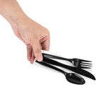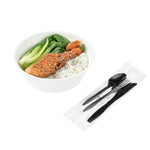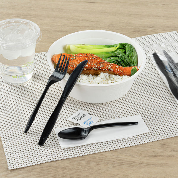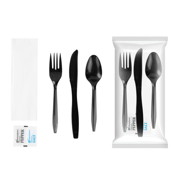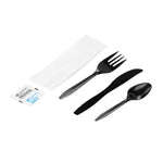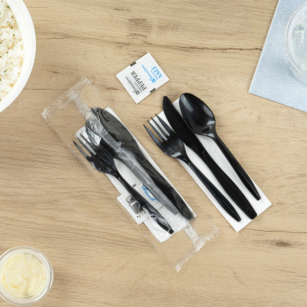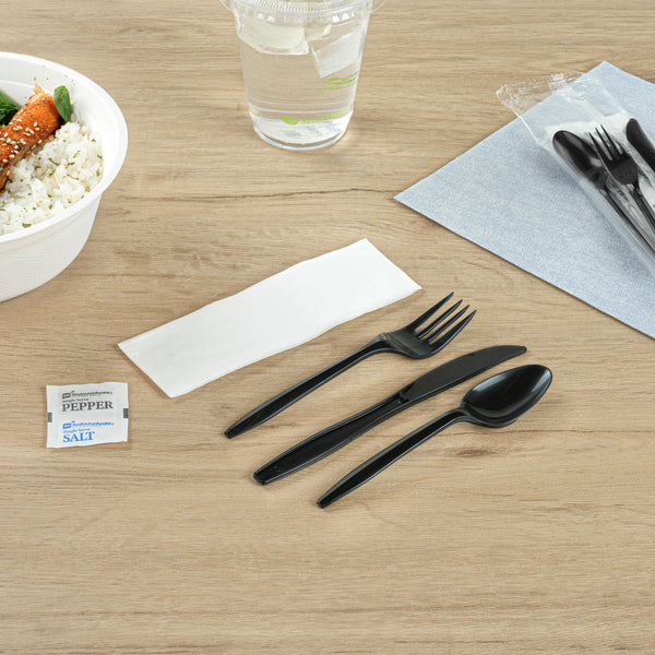 Chef 101 Black Plastic Cutlery Set - with Napkin and Salt / Pepper Packets, Medium Weight, Wrapped - 6 1/2