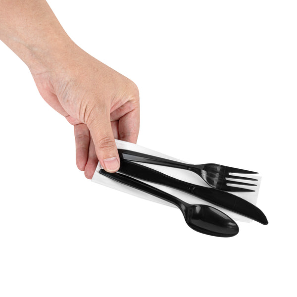 BLACK PLASTIC CUTLERY SET - WITH NAPKIN AND SALT / PEPPER PACKETS