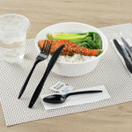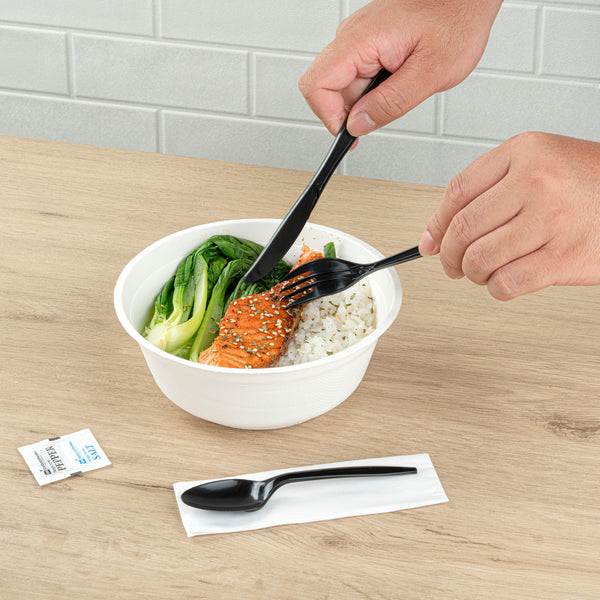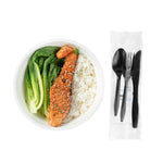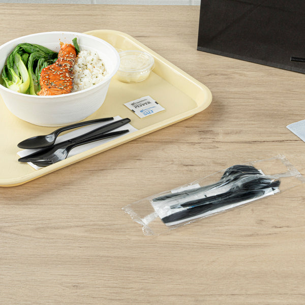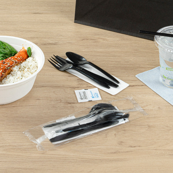 Ensure sanitary dining experiences with individually wrapped utensils. The Chef 101 Individually Wrapped Plastic Cutlery Set includes medium-weight black plastic cutlery that offers a cost-effective, stylish solution for diverse foodservice environments. Each set features a fork, knife, spoon, napkin, and salt and pepper packets, providing a complete disposable utensil pack that enhances convenience and customer satisfaction. Designed for light fare take-out and catering, these medium-weight utensils are perfect for serving meals at food trucks, outdoor festivals, or catered events, where traditional dishware isn't practical. The individually wrapped packaging safeguards hygiene, making these sets ideal for takeout and delivery services. Crafted from durable plastic, these cutlery sets measure 8.9 inches in length, facilitating easy handling and reliable performance. Each order includes 250 Chef 101 Individually Wrapped Plastic Cutlery Sets.