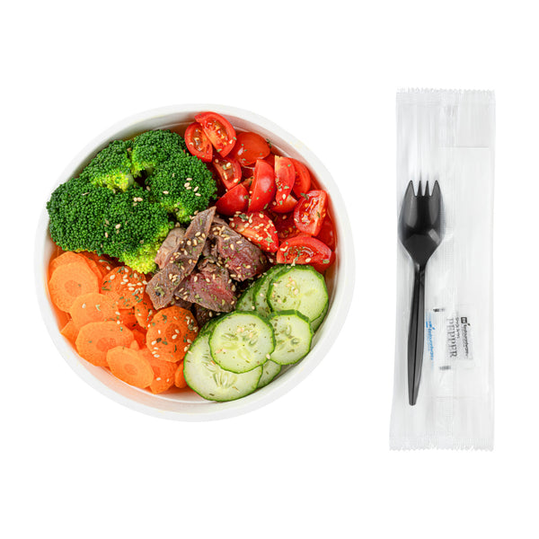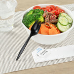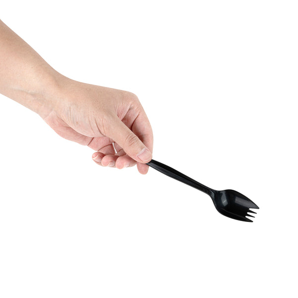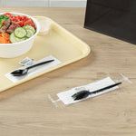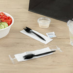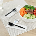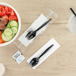 Enhance sanitation in foodservice with our individually wrapped cutlery kit. The Chef 101 Hygienic Wrapping Disposable Spork Set features a medium weight polypropylene design, measuring 5.3 inches in length, making it perfect for light-fare take-out at restaurants, stadiums, and fairs. This disposable spork set includes a spork, napkin, and salt and pepper packets, providing a complete dining utensil set to meet all your customer's needs. The individually wrapped packaging ensures increased sanitation, ideal for take-out operations, while the black color complements any dining atmosphere. Elevate your take-out service with this efficient and hygienic solution. Each order includes 250 Chef 101 Hygienic Wrapping Disposable Spork Set.