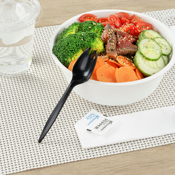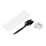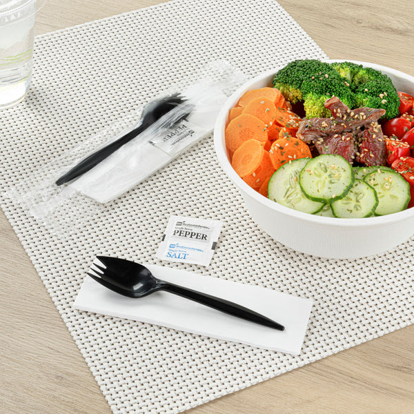 BLACK PLASTIC SPORK - WITH NAPKIN AND SALT / PEPPER PACKETS