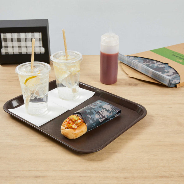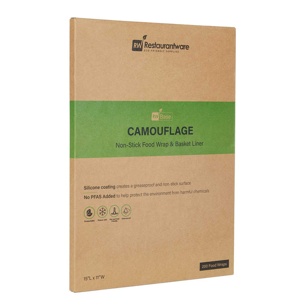 Add a pop of style to your food presentation with our Chef 101 No PFAS Added Camouflage Paper Food Wraps and Basket Liners. These food wraps boast a durable paper construction, ensuring your dishes remain intact and presentable. Styled with a unique camouflage design, these taco paper wraps add a fun twist to your traditional food packaging, making your offerings more appealing. With the greaseproof silicone coating, these sandwich wrap papers keep oils and sauces contained, maintaining the cleanliness of your customer's hands and dining area. These basket liners are freezable, offering you a versatile solution for serving a variety of hot and cold food items. Perfect for fast-paced foodservice establishments, these deli papers are precut, speeding up your wrapping process and enhancing efficiency. These disposable food wraps are recyclable and commercially compostable. Measuring 15 inches in length by 11 inches in width, these sandwich wraps are ideal for food trucks, catered events, or cafes. Sold in a 2,000 count box.