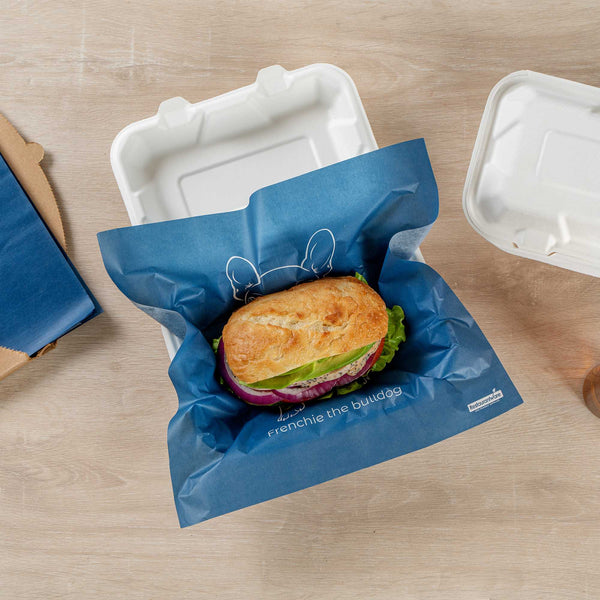 Enhance your food presentation with our Wrap delicious meals in style with our Chef 101 No PFAS Added Frenchie Paper Bakery Wraps and Basket Liners. Offering superior quality, these food wraps are made from durable paper construction ensuring food stays secure. With no added PFAS, these taco paper wraps provide a sustainable choice, as they have no unwanted substances. The greaseproof silicone coating of these sandwich wrap papers ensures that oil and grease do not seep through. These basket liners come with a French bulldog design, adding a fun touch to your food presentation. Versatile and practical, these bakery wraps are freezable, catering to all your food serving needs. Conveniently disposable, these deli papers make clean up a breeze and help in minimizing your establishment's carbon footprint. These bakery wraps are also pre-cut to 12 inches in length by 12 inches in width, providing ample space for wrapping sandwiches, tacos, or lining baskets. Sold in a 2,000 count box.