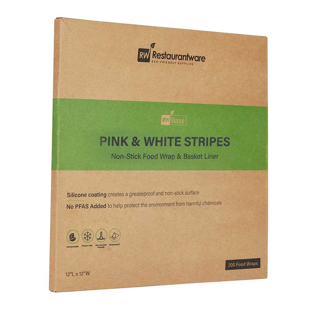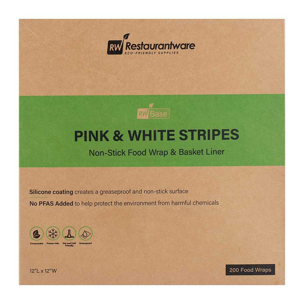 Upgrade your food presentation with our Chef 101 No PFAS Added Pink and White Stripe Paper Bakery Wraps and Basket Liners. These versatile food wraps are perfect for wrapping up delicious tacos, sandwiches, or lining bakery trays and baskets with their durable paper construction with no added PFAS. Featuring a greaseproof silicone coating, these taco paper wraps avoid oil and grease from seeping through, providing a no-mess eating experience. With a pink and white striped design, these deli papers effortlessly complement any establishment's aesthetic. Freezable, these sandwich wrap papers maintain your food's temperature and freshness and let you store them when needed. Ecologically-conscious, these disposable and reprocessable bakery wraps reduce your carbon footprint. Measuring 12 inches in length by 12 inches in width, these basket liners offer ample space for wrapping or lining a variety of dishes. Sold in a 2,000 count box.