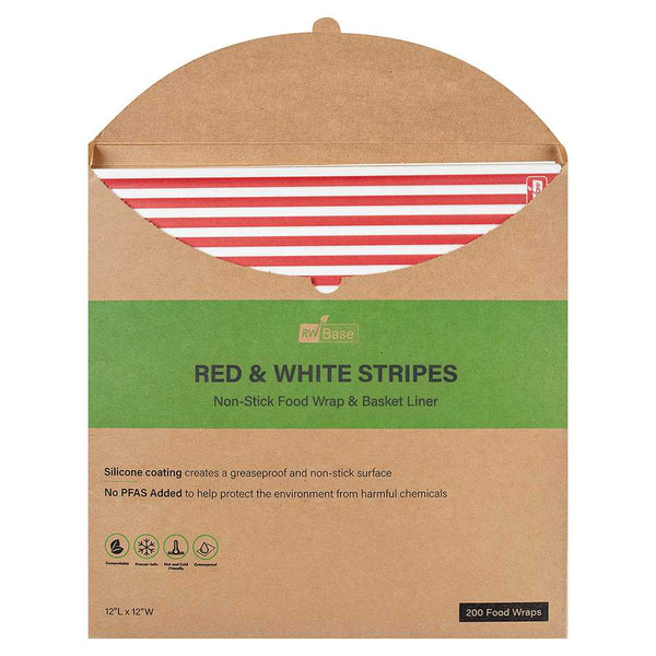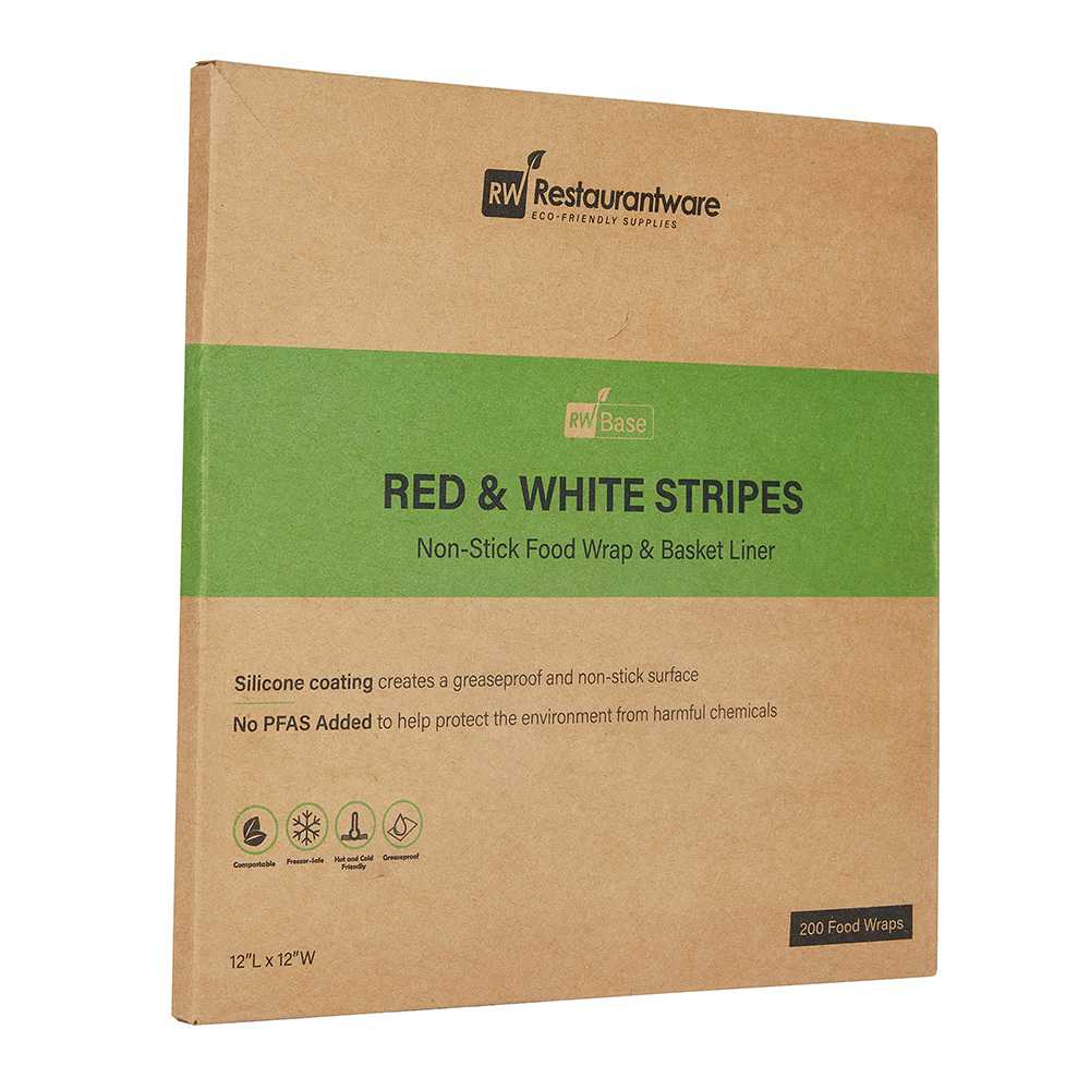 Experience the superior quality of our Chef 101 No PFAS Added Red and White Stripe Paper Bakery Wraps and Basket Liners, designed to meet the highest standards of the foodservice industry. These food wraps, boasting a durable paper construction, offer strength and reliability to handle your most delectable dishes. With their greaseproof silicone coating, these taco paper wraps are perfect for serving oily or moist foods without any mess. Display your baked goodies with a charm, as the red and white striped design of these bakery wraps adds an authentic touch to your presentation. These pre-cut sandwich wrap papers, measuring 12 inches in length by 12 inches in width, are versatile enough to accommodate a variety of food items, from burgers to wraps and everything in between. With an unwavering commitment to our environment, these disposable deli papers are reprocessable, ensuring your foodservice operation leaves a minimal carbon footprint. Sold in a 2,000 count box.