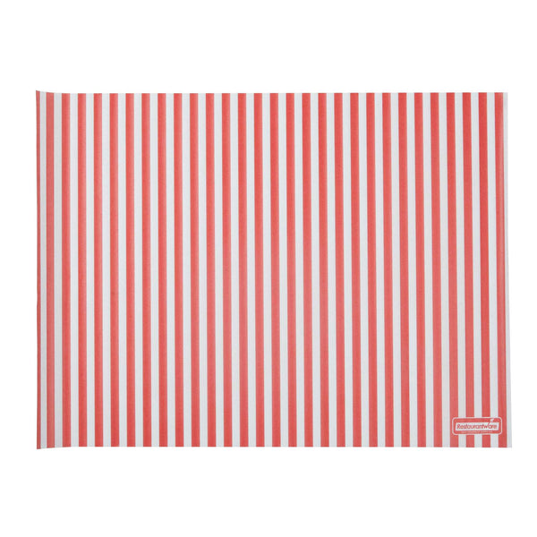 Meet our Chef 101 No PFAS Added Red and White Stripe Paper Food Wraps and Basket Liners, an essential addition to your foodservice supplies. These food wraps are crafted from durable paper with no added PFAS, ensuring a sturdy hold for a variety of food items. Featuring a greaseproof silicone coating, these taco paper wraps avoid oil seepage, maintaining the integrity of your tacos, sandwiches, and more. These sandwich wrap papers have a trendy red and white striped design, which gives a timeless, clean look that complements any food presentation. These basket liners demonstrate their versatility by being freezable, accommodating cold food items with ease. Plus, these deli papers are conveniently precut, saving you time and effort in your busy kitchen. With dimensions that measure 15 inches in length by 11 inches in width, they provide ample space to wrap, line, and serve a variety of food items. Sold in a 2,000 count box.