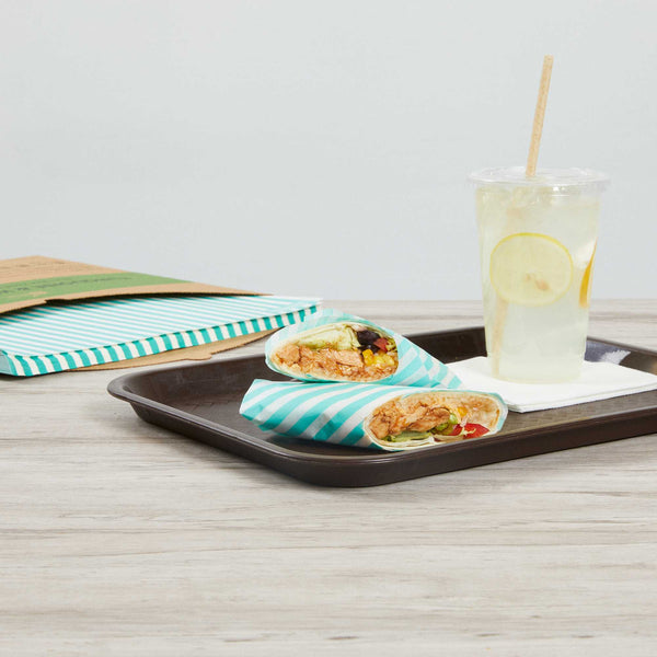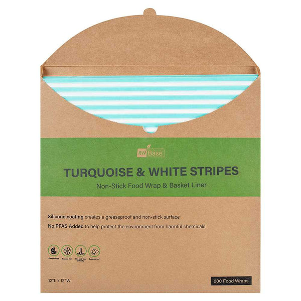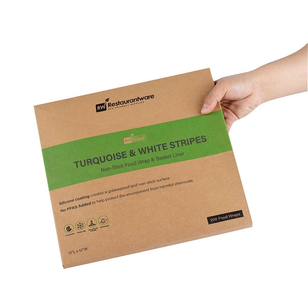 Upgrade your food presentation with our Chef 101 No PFAS Added Turquoise and White Stripe Paper Bakery Wraps and Basket Liners. Crafted from durable kraft paper construction with no added PFAS, these bakery wraps are foodgrade and sustainability. Designed as versatile food wraps, these papers are perfect for wrapping tacos, sandwiches, and more. With their greaseproof silicone coating, these disposable taco paper wraps ensure your dishes stay without any mess. Enhance your deli papers with this turquoise and white striped design, providing a stylish alternative. The freezable properties of these sandwich wrap papers make them suitable for various applications in your bakery, restaurant, or food truck. Conveniently disposable, these basket liners offer a convenient cleanup solution. Measuring 12 inches in length by 12 inches in width, these reprocessable food wraps come precut and are perfect for handling a variety of dishes. Sold in a 200 count box.